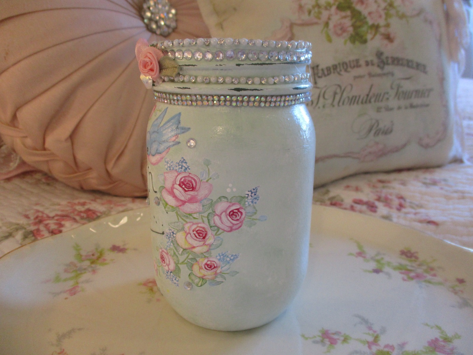 Kerr Mason jar painted a pastel sage green. A single bluebird among pink and yellow roses with greenery and bits of blue larkspur. A single rose is on the backside. Sealed. I have added lots of bling to the rim with pearl and rhinestone trim, rhinestone trim. Pink handmade ribbon roses with leaves. Jewels and crystals have also been added. The jar measures 5 1/4" tall with a 2 3/4" diameter opening. Great for office pens and pencils, art brushes, cosmetic brushes or faux flowers or just display as is!!