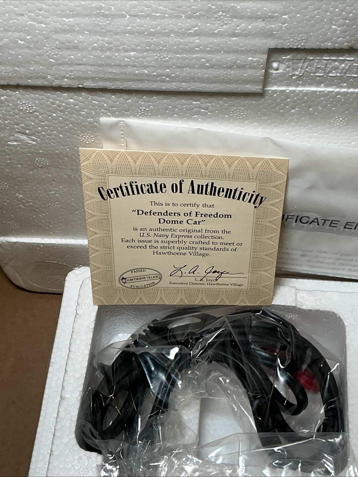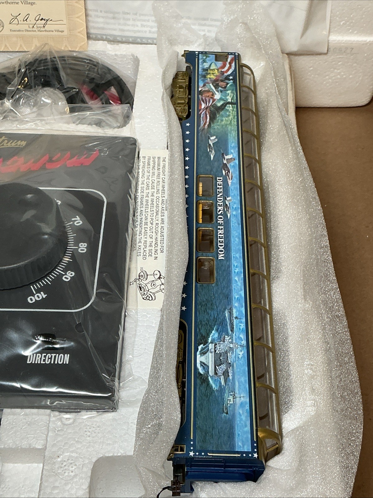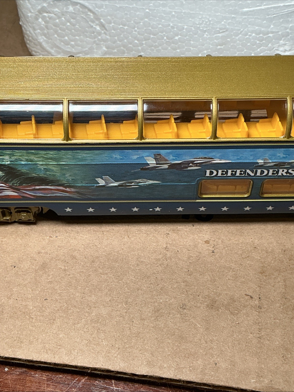 The 2005 Bachmann Hawthorne Village DEFENDERS OF FREEDOM dome Car is a vintage model train car made of plastic, featuring a multi