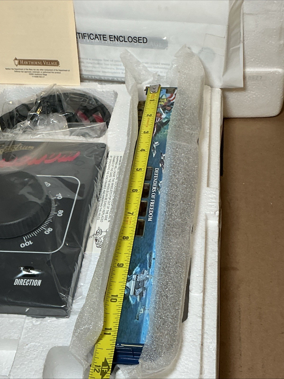 This 2005 Bachmann Hawthorne Village “Defenders of Freedom” dome car set is offered in new condition and is suitable for model train collectors and hobbyists. The listing title notes a transformer is included; check the listing for details on what is in the box, compatibility, and any additional accessories. Price is $85.00 USD. Free shipping is included, and the item will be shipped as described in the listing. Review the listing photos and any notes for exact contents and packaging condition before purchase.