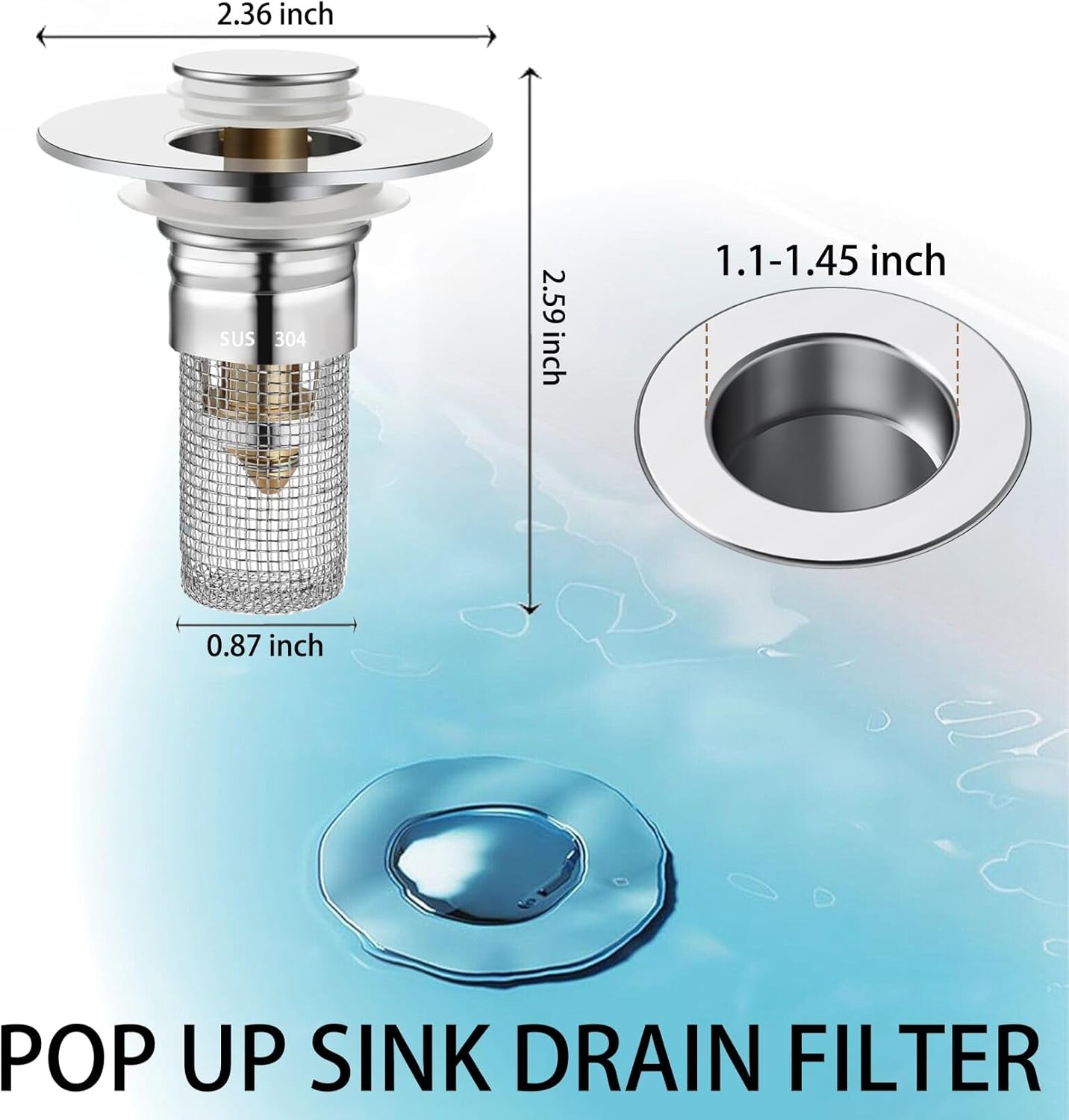 Perfect Compatibility: This sink stopper is suitable for 99% of sink holes, with a diameter range of 1.1 to 1.45in. It comes with two spare rubber rings for 0.95 to 1.1in drain holes. The overall applicable diameter range is 0.95 to 1.45in. Can be used in washbasins, bathroom sink drains.2-IN-1 Anti-Clogging Design: Pop up sink drain stopper have a removable clog-proof basket inside that combines a drain stopper and a strainer in one. This design stores water and prevents clogging by trapping hair, debris, and valuable items like jewelry rings before they flow down the drain.Premium Material: This sink stopper made of thickened premium 304 stainless steel and pop-up brass core, rugged construction, rustproof and watertight, ensure durability and longevitysolid, making it a reliable choice for your bathroom sink.Easy Set-Up and Cleaning: Effortless installation, simply insert the sink plugs for drain pluginto the drain hole to complete the installation. For cleaning, effortlessly remove it and rinse under running water. Use a soft cloth or brush to eliminate any stubborn debris. No more worrying about cleaning the drains.Efficient and Low-Maintenance: Elevate your bathroom experience with our efficient pop-up sink drain stopper, a practical choice for any sink. Enjoy smooth water flow and hassle-free maintenance, bidding farewell to clogged sinks for good. Note: Regularly clean the filter to ensure that it can drain smoothly. New Upgrade Sink Strainer: Innovative 2-in-1 Stopper & strainer design. Filtering hair and debris to keep sewers clear. 100%Prevents Blockages. Quick drainage, no need to wait long. Easy to Clean and Remove Odors.Exouisite Details: Brass Bouncing Core Device: High-strength brass,fiexible bounce,durable and reliable. ABS Material: Environmentally friendly and durable, waterproof and rust-proof, deformation after long-term use. 304 Stainless steel Filter: Fine filtration, effectively intercepting hair and debris, rust-proof and durable. Sealing Ring: Sealed and leak-proof design, anti-flushing and anti-odor, ensuring smooth water flow.Simple and Easy to Install: ①Suitable for drain hole diameters from 1.1-1.45 inch. ②Remove the old sink stopper. ③Install and torque the filter. ④Insert the new sink stopper. Suitable for various scenarios: washbasins, bathroom sinks, and shower tubs. Stainless Steel Floor Drain Filter Bathroom Sink Stopper Hair Catcher Sink Stopper Hair Catcher Bathroom Sink Stopper Hair Catcher Floor Drain Filter Drain Strainer Bathroom Sink Stopper Drain Strainer