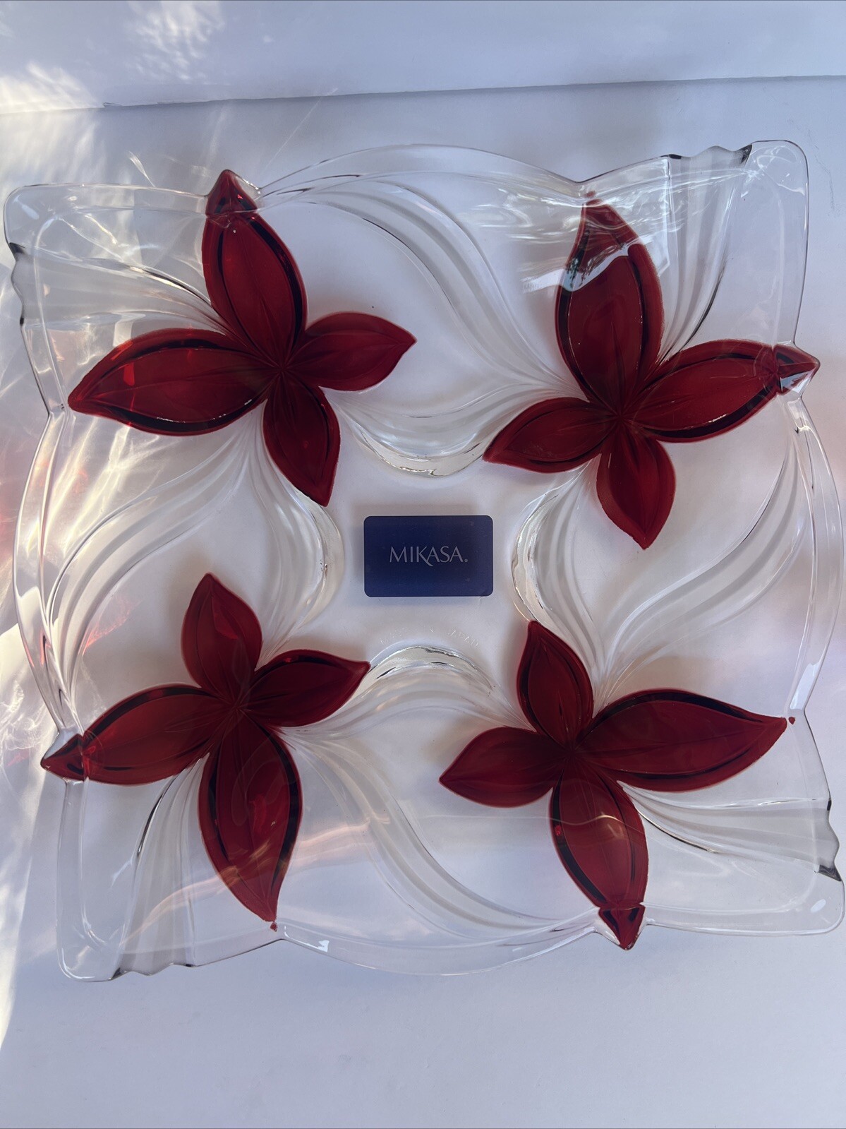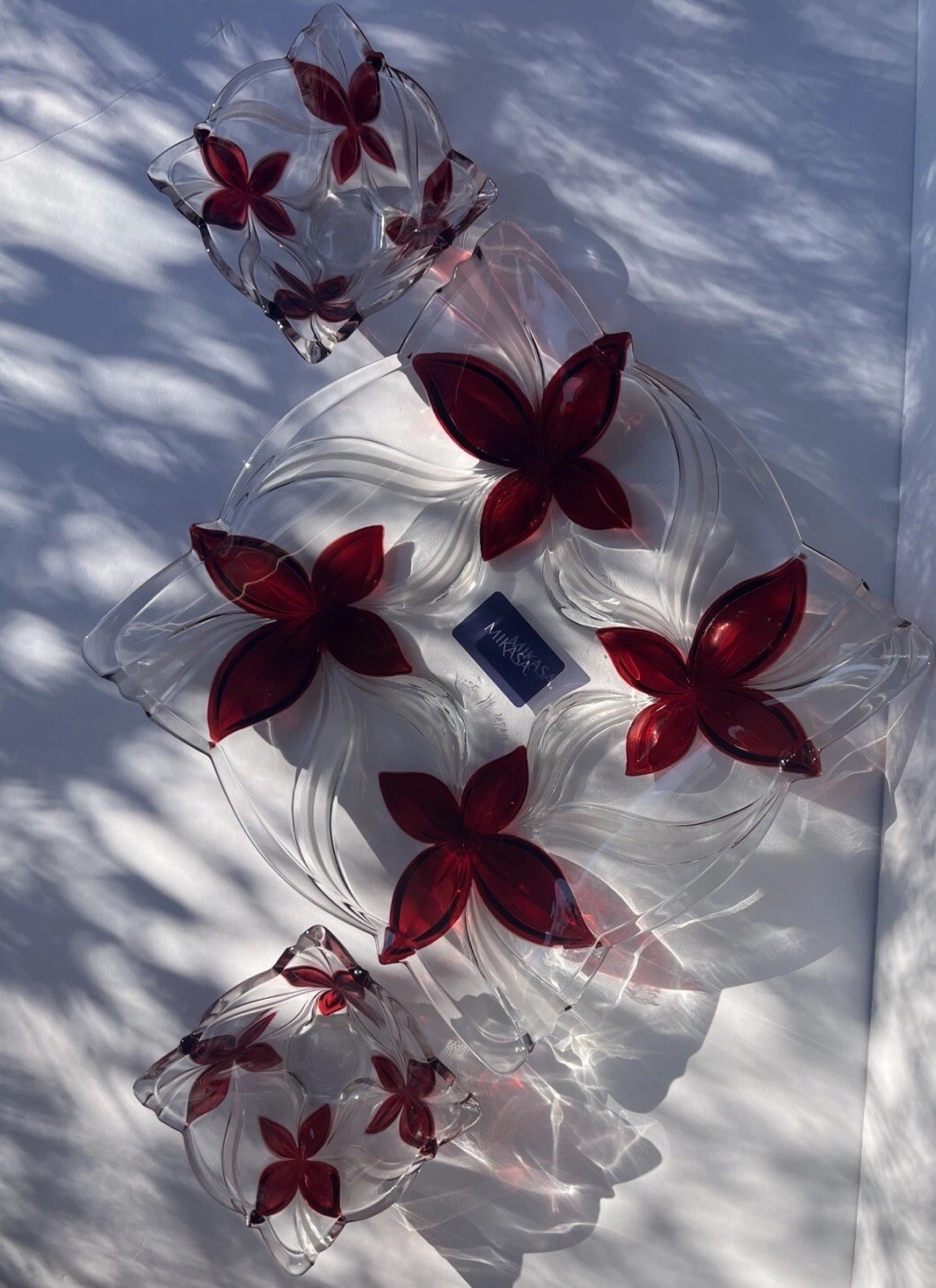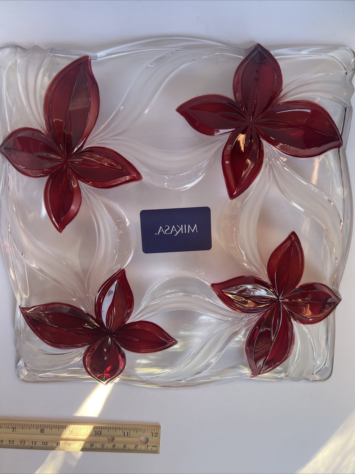 color and flower theme make it a great addition to any collection. Care instructions recommend hand washing only to ensure longevity of the glass material. The platter and small plates are all original and come unboxed. The Angelina Ruby Platter model is from the Mikasa Angelia Ruby product line, manufactured in Japan in 2011. Add this stunning set to your collection today!