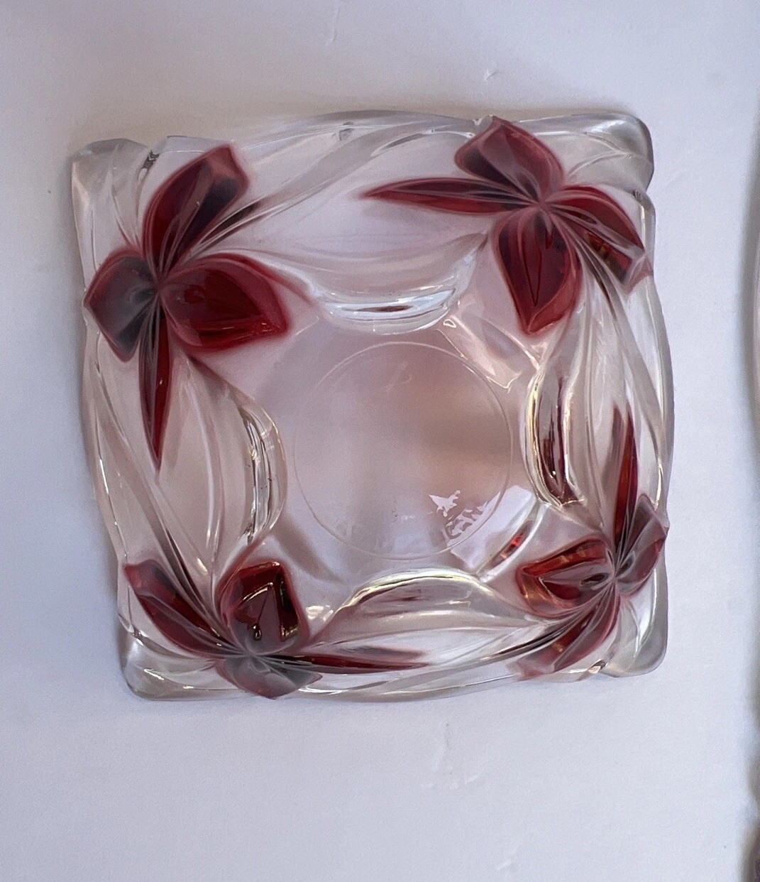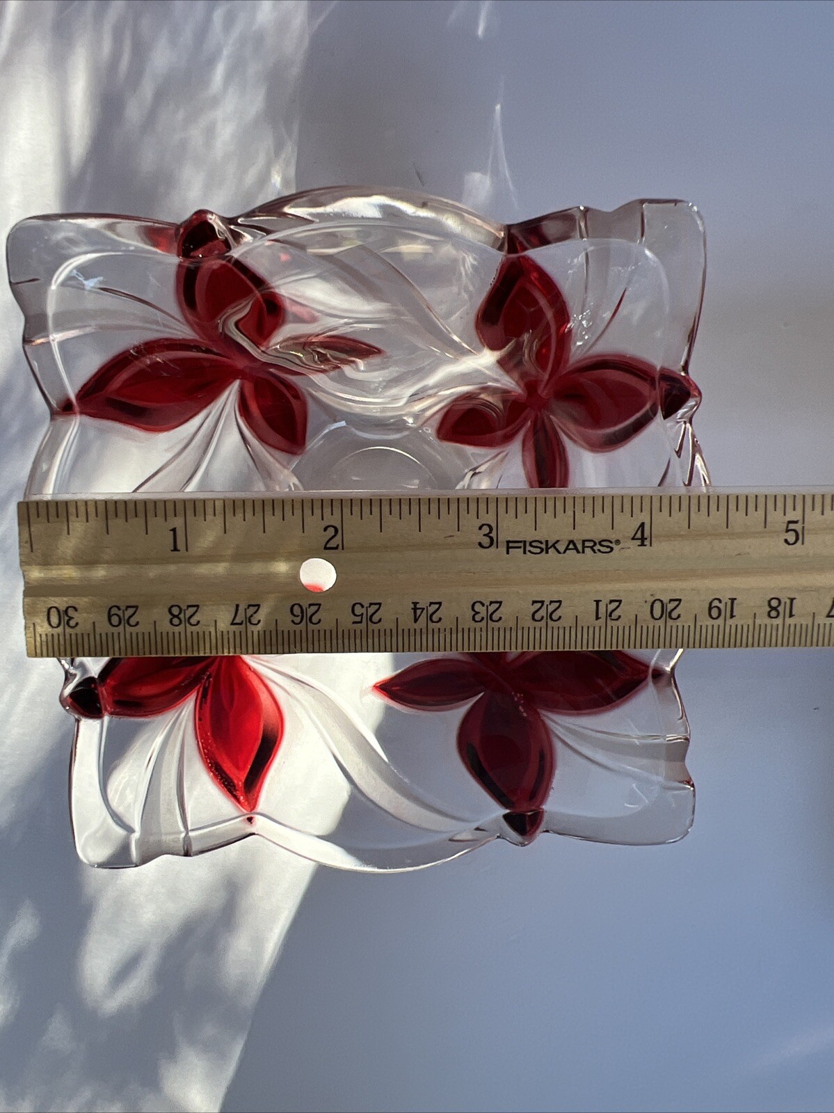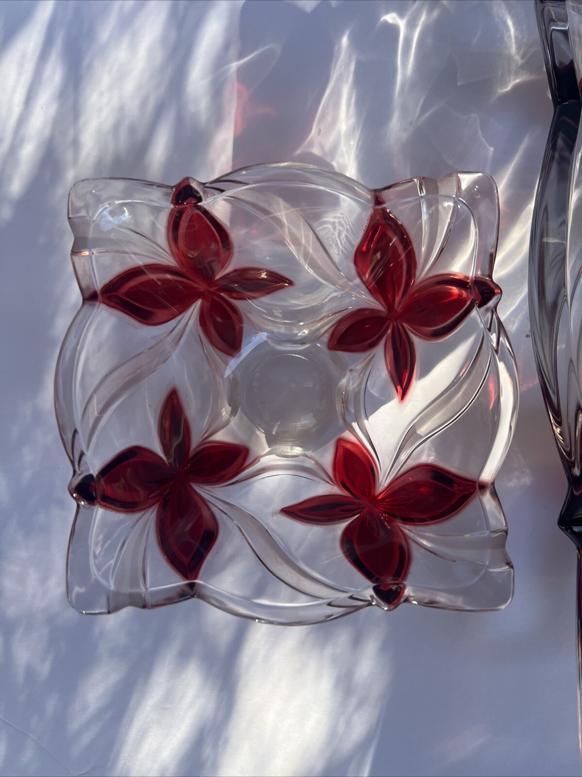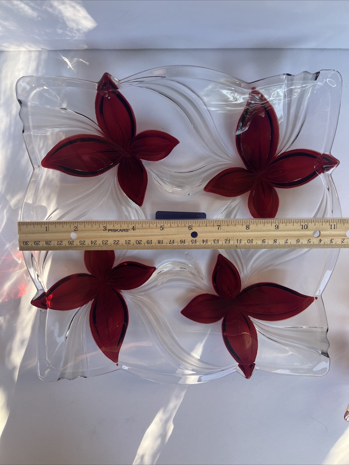color and flower theme make it a great addition to any collection. Care instructions recommend hand washing only to ensure longevity of the glass material. The platter and small plates are all original and come unboxed. The Angelina Ruby Platter model is from the Mikasa Angelia Ruby product line, manufactured in Japan in 2011. Add this stunning set to your collection today!
