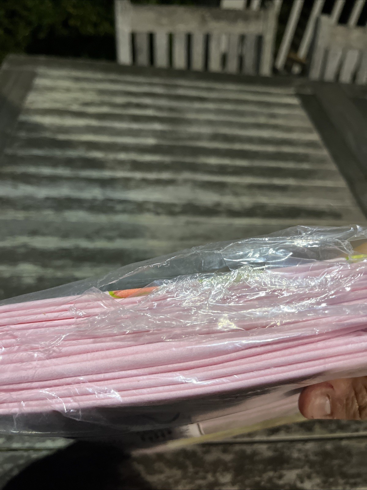 size of 108 x 110 in. before hemming.• Pink background with printed floral ornamentation in shades of pink, peach, green, and lavender, with the package artwork showing the coordinating Essex design.• 50% Dacron polyester / 50% combed cotton blend, as labeled on the package.• Percale weave with over 180 threads per square inch, according to the original packaging.• No-iron, easy-care finish described on the package as an exclusive non-resin finish intended to stay smooth and fresh.• Package notes shrinkage of less than 2%, a useful detail for buyers seeking vintage bedding with labeled care and