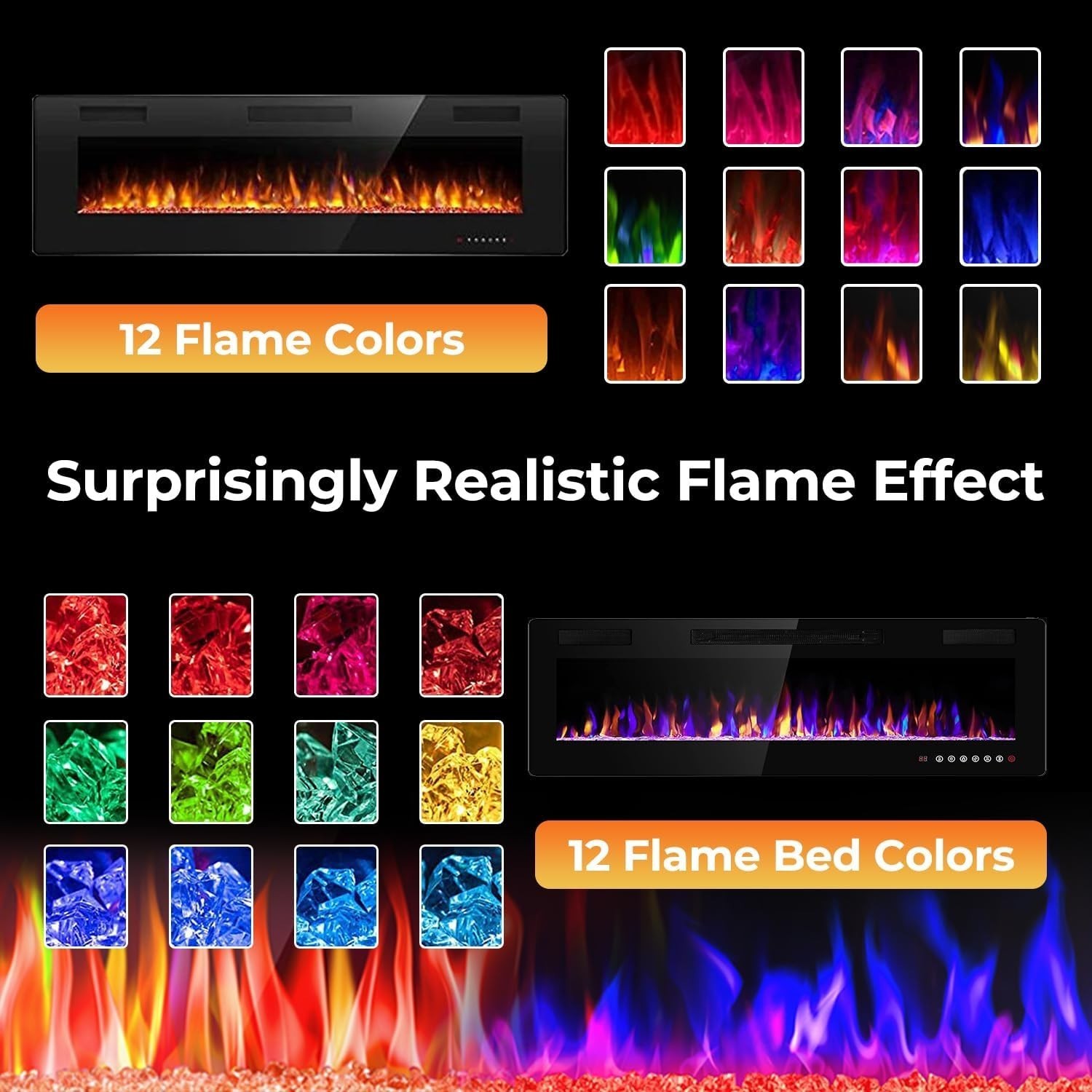 60" Electric Fireplace Recessed and Wall Mounted, 750/1500W Ultra-Thin Electric Fireplace Heater with Remote & Touch Control, Linear Fireplace with Adjustable Flame Color and BrightnessREALISTIC FLAME EFFECT: Tap through 12 flame colors and 12 flame bed colors, 5 flame speeds, and 5 brightness levels to summon anything from a roaring blaze to a smoldering ember. One tap of the remote brings theater-grade 3d flames that dance across your wall like the real thing.RECESSED AND WALL MOUNTED: Only 3.5 inches thin, the electric fireplace slips effortlessly into any room. It not only can be recessed in wall but also can be wall mounted. Both installs take minutes, leave zero bulk. Ditch the heavy mantel and let sleek, minimalist lines frame the flickering flames instead.EFFICIENT HEATING: The electric fireplace heater offers 750W and 1500W settings to quickly heat up to 400 sq. ft. Temperature is adjustable from 62 °F to 82 °F. You can turn off the heat while the 3D flames stay on. The electric fireplace is perfect for winter nights and summer ambiance.REMOTE & TOUCH CONTROL: Control the fireplace effortlessly with the included remote or the touch panel, allowing you to adjust flame effects and temperature from the comfort of your couch. The convenient timer function lets you set an auto-off time from 1 to 8 hours, adding convenience and energy efficiency to your home.SAFE TO USE: Sleep soundly while the fireplace guards your home. ETL certification and automatic overheat shut-off keep safety locked in, and at just 38 dB the gentle flames are quieter than a library whisper, so you get cozy warmth without ever raising the volume.Product Dimensions3.86"D x 60"W x 18.09"HItem Weight21.7 PoundsPrevious pageNext pageLiving Room Entertainment Center Bedroom Kitchen
