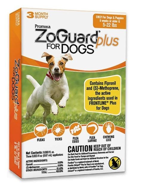 Includes 3 doses for 3 months of coverage. The active ingredients in ZoGuard Plus for Dogs feature a sustained-release formula developed for fast-acting and long-lasting control of fleas, ticks, and chewing lice for up to 1 month on dogs. Use ZoGuard monthly for complete control of flea, tick, and chewing lice infestations. ZoGuard kills adult fleas, flea eggs, and flea larvae and prevents the development of pupae for up to three months. Apply monthly if your dog is at high risk for flea reinfestation. Apply monthly to control ticks, and chewing lice. ZoGuard remains effective, even after bathing, water immersion, or exposure to sunlight. Allow the treated area to dry thoroughly. Do not reapply for 30 days.Contains the same flea-and-tick fighting protection as FRONTLINE® PlusWorks quickly to kill adult fleas and ticks for up to one monthEliminates flea eggs and larvae - others don'tFast-actingLong-lastingWaterproof3-month supply.