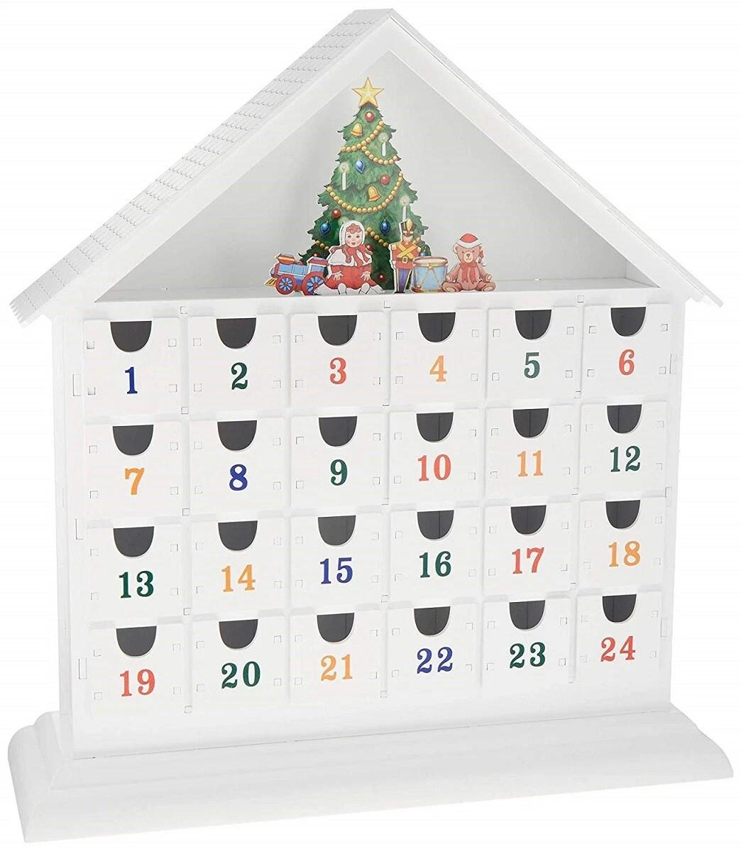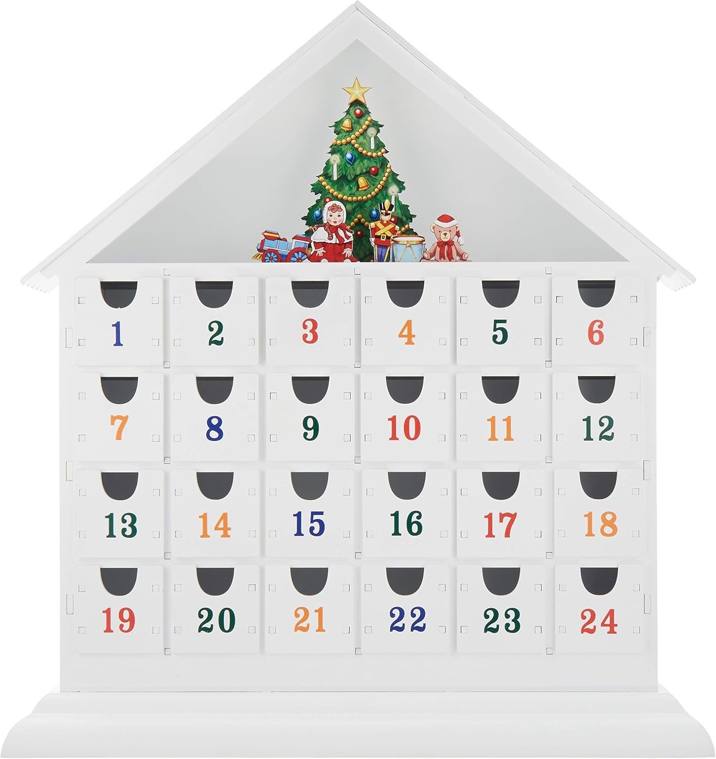 | Features | Reusable, Substantial 15-inch display size, Crafted of sturdy wood with white finish, Nostalgic toy-themed scene with a decorated Christmas tree, Decorative and functional, 24 numbered drawers for daily treats or surprises, Holiday theme cutout at the top |