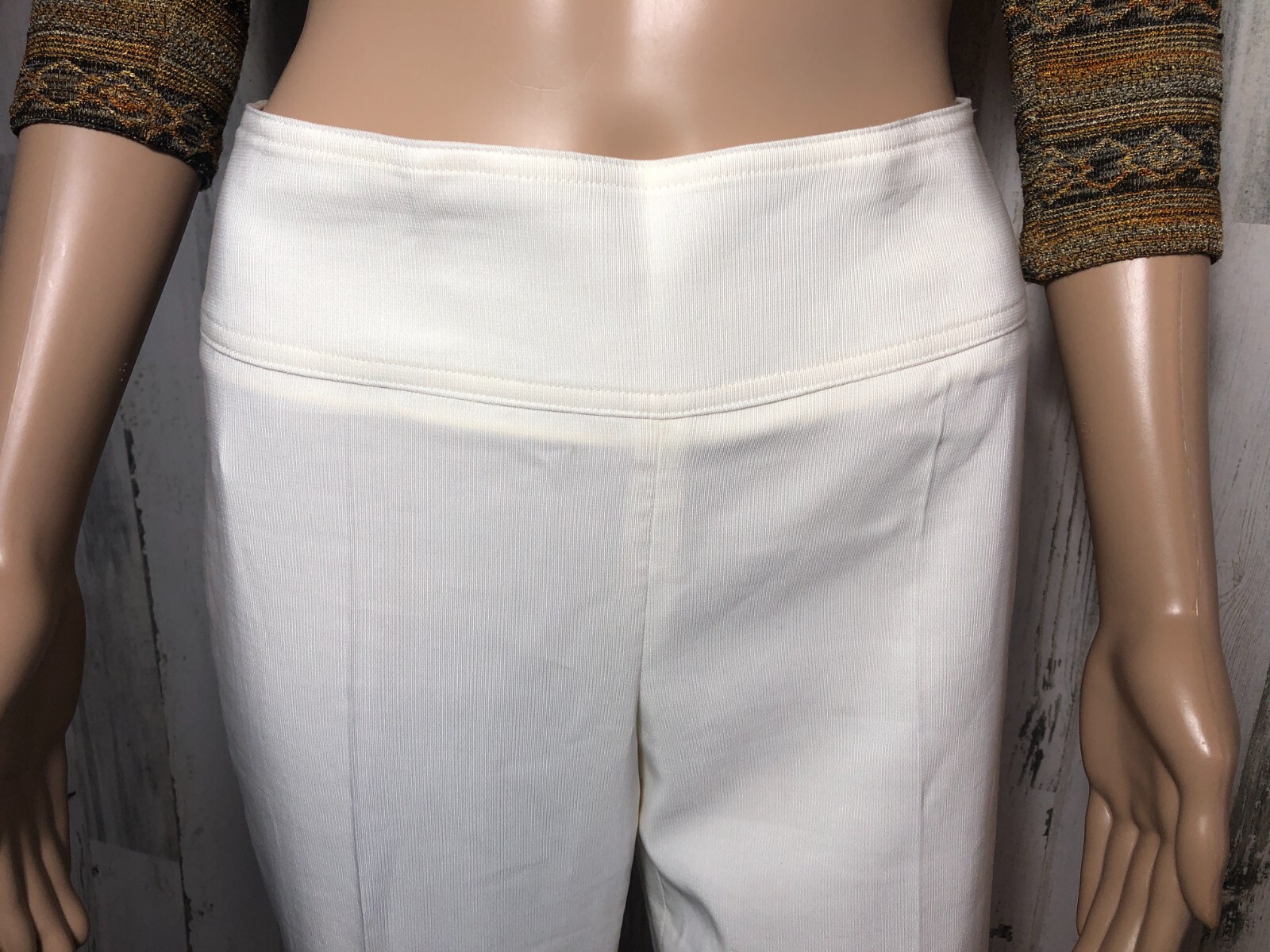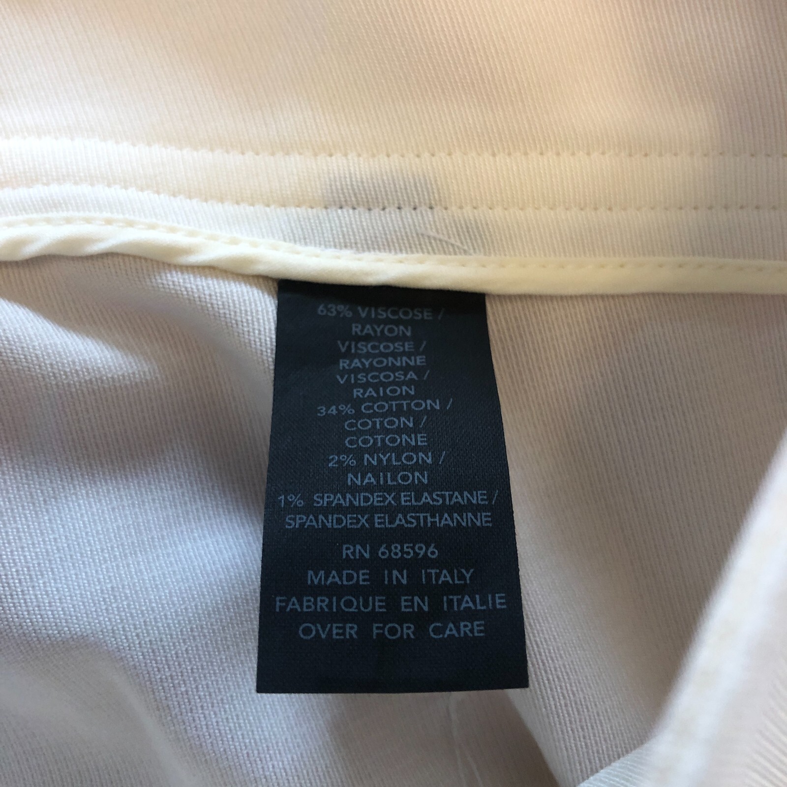 DONNA KARAN Collection Ankle Pant Sz 6 US Back Zip Black Label Made in ItalyPair of cream colored ankle pants from the Donna Karan Collection. Black Label. Made in Italy. They feature a wide waistband, mid rise, back zip and slits at the ankles. Cream colored textured stretch fabric. Perfect for career, evening or casual wear. Excellent condition with very tiny light mark on back side - see last photo for detail. Measurements below.Waist 31"Rise 9"Inseam 28"Leg opening 6" (diameter across laying flat)BnQ312