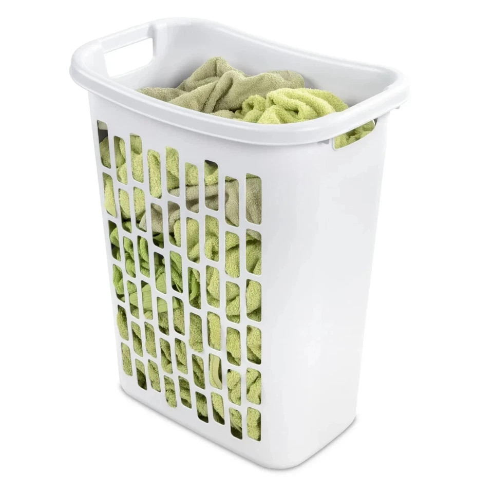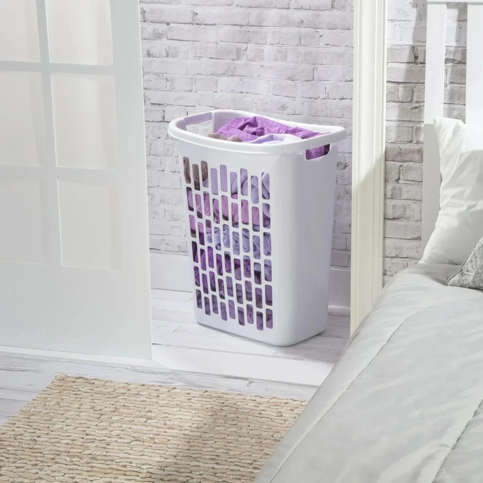 This Mainstays rectangular open laundry hamper in white plastic is listed as New and is suitable for everyday laundry storage in bedrooms, bathrooms, or closets. The open design makes it easy to drop in clothes and carry when needed. Free shipping is included, with shipping offered within the USA. Check the listing for details on exact measurements, capacity, and any included accessories or packaging information.