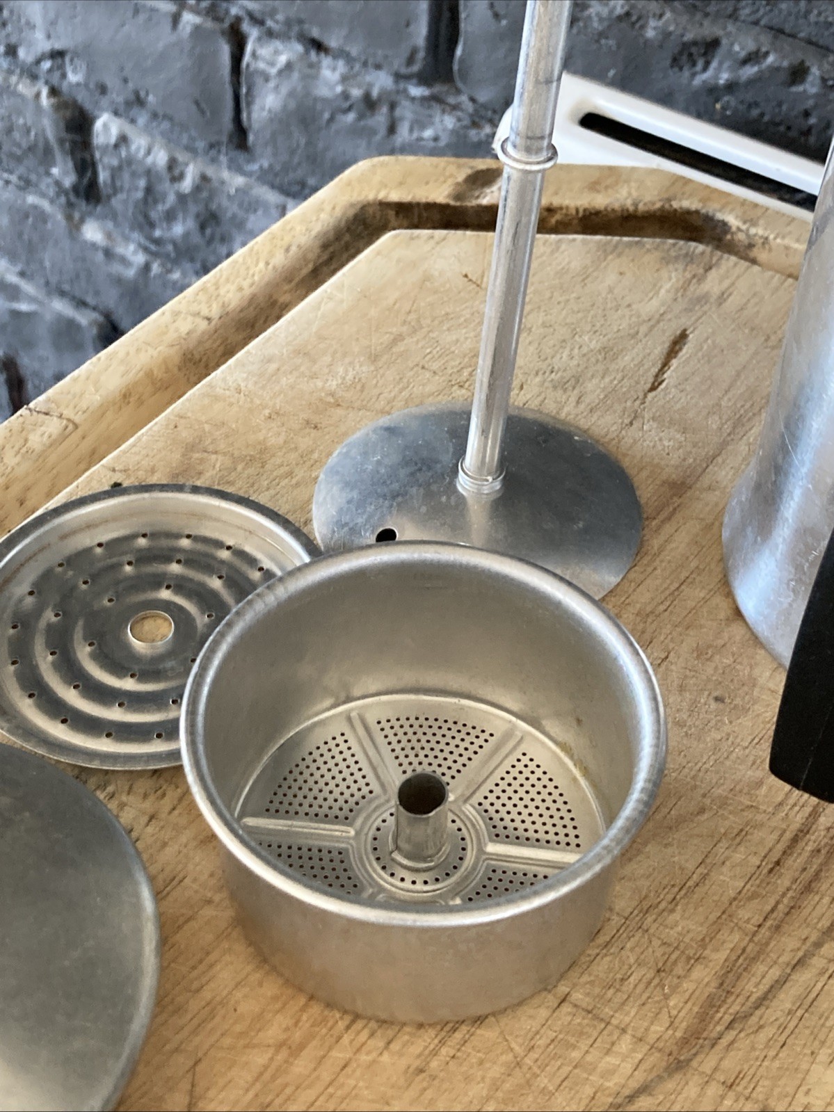 Vintage stovetop/camping coffee percolator with all parts including basket cover. There is one dent in the side of the carafe, please see photos!
