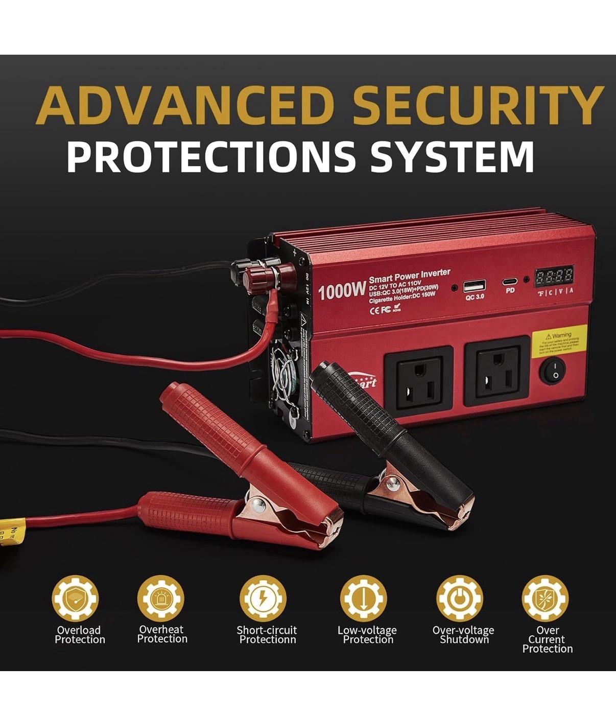 accessories Digital Display inverter for Portable Audio, Camping Lamps, Digitals Cameras, Car Refrigerator, etc.Safety Multi-Protection 1000W 12V Automobile Inverter :Cooling Fan,Smart Digital Display, and Mini Slip Fuse to protect against Over Voltage, Low Voltage,Overload ,Short Circuit, Over Heat. Applies the technology of ABS crashworthiness, robust, as well as good electrical insulation auto inverterWidely Using Inverter :Inverter can be connected with car lighter or 12V battery directly for Emergency or solar inverter, Hurricane, Storm, Snowstorm, and Outage,cell-phone, laptop, electric light, digital camera, breast pump and other electronicsWhat You Get :Our power inverter have CE and FCC , ROSH certification. Please use in well-ventilated, dry areaGift Ideal: Emergency current converter power inverter is the most ideal gift for Camping, Christmas, New Year's Day, and Thanksgiving DayNote: Our power inverter provides 750 Watts continuous power and 1000 Watts peak powerClamp Wire Description: The red wire connects to the positive terminal, and the black wire connects to the negative terminal. The cigarette lighter adapter contains a fusePrevent Overloading: Ensure the Total Power of Connected Devices Does Not Exceed the Inverter's Maximum 1000W Output Limit
