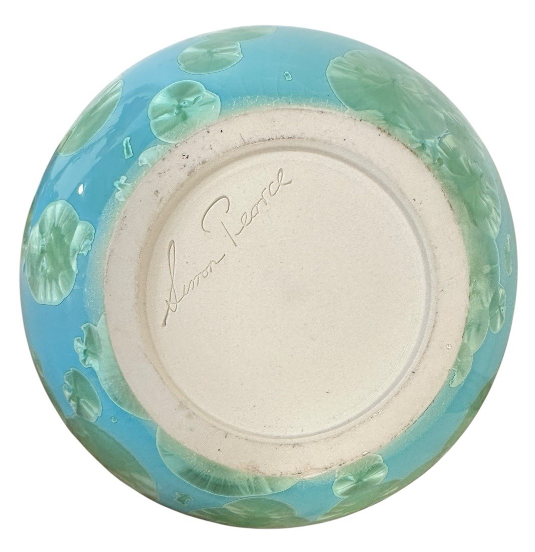 It’s hard not to pause and admire the glaze on this one.This Simon Pearce “Jade” crystalline glaze teardrop vase features beautiful celadon crystal blooms floating across a luminous aqua ground, creating the organic lily-pad effect collectors appreciate in crystalline ceramics.Crystalline glazes form during a carefully controlled firing process where minerals separate and grow into visible crystal structures within the glaze. Because the process is unpredictable, each firing produces a unique pattern of crystal blooms.This example is particularly striking, with well-developed crystals drifting across the rounded belly and rising naturally toward the shoulder of the form.The elegant teardrop silhouette gives the vase a sculptural presence whether displayed alone or holding simple stems.Hand-signed Simon Pearce on the base.⸻ConditionExcellent vintage condition.There is light crazing in the glaze, which is common with crystalline ceramics and does not affect the stability or beauty of the piece. No chips or cracks noted.⸻MeasurementsHeight: approximately 10.5 inchesWidth: approximately 5.75 inches