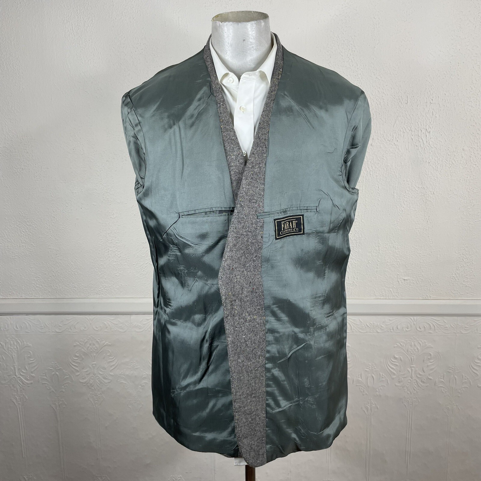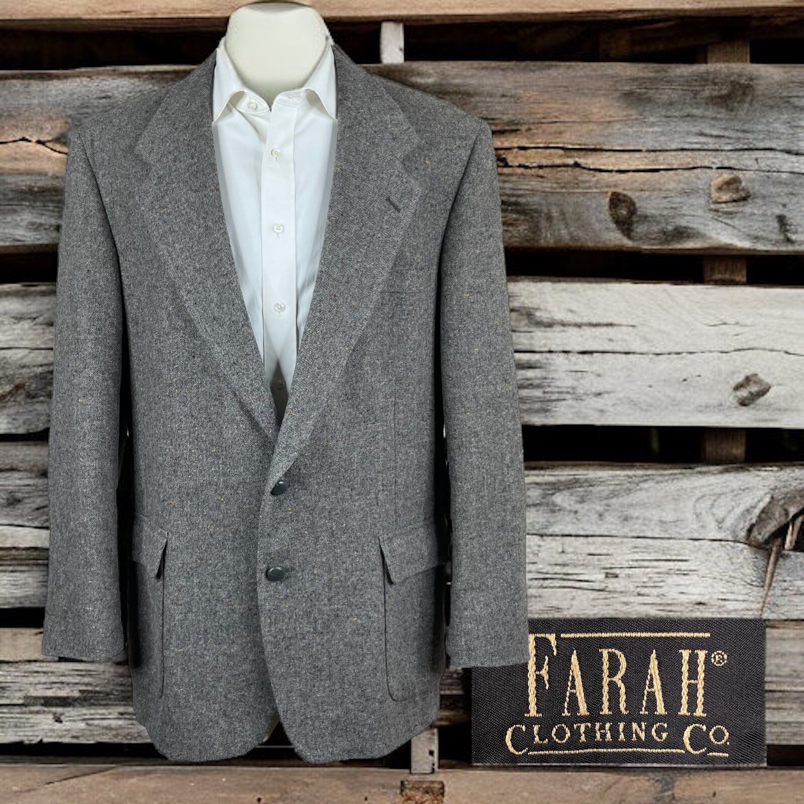 Vintage Farah Sport Coat Blazer Mens 46L Gray Tweed Wool Elbow PatchesQuality used condition. Please check out the measurements before buying to ensure a perfect fit.ShirtSize onLabel46LShoulder-Hem32.00''Shoulder-Shoulder20.00''Shoulder-Wrist27.00''Armpit-Armpit25.00''Top button23.00''Everything ships within a day. Spot cleaned according to manufacturer's recommendations. Has a chance of wrinkling in the mail. Feel free to message me with any questions. Thank you very much.10/21/23