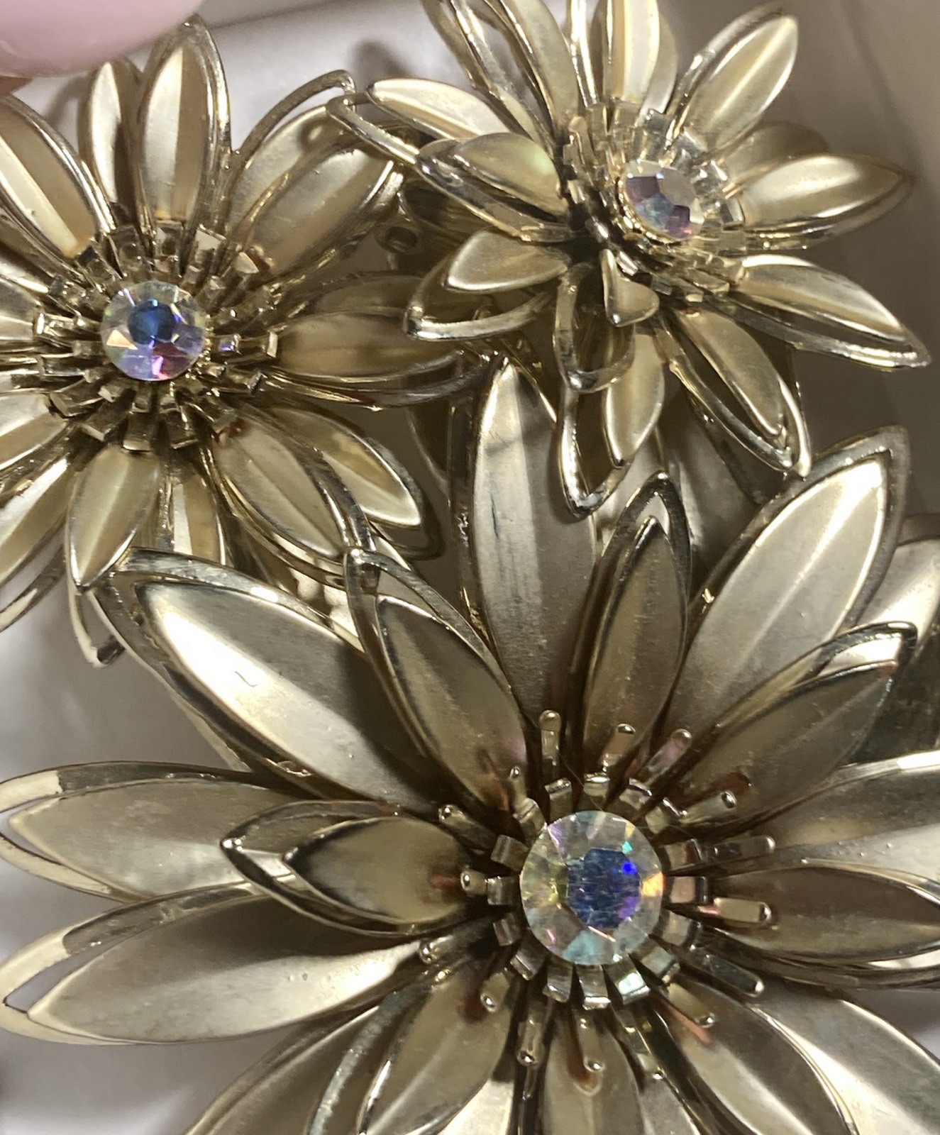 Beautiful vintage gold tone floral brooch with matching clip-on earrings.The design features layered openwork petals with a sparkling aurora borealis rhinestone center that reflects soft rainbow colors in the light.This mid-century style jewelry set has a classic daisy or chrysanthemum motif and makes a lovely statement on a jacket, sweater, scarf, or dress.Brooch measures approximately 2.75 inches across.Earrings measure approximately 1 inch.Good vintage condition with light wear consistent with age. Rhinestones are bright and secure. Please see photos for details.