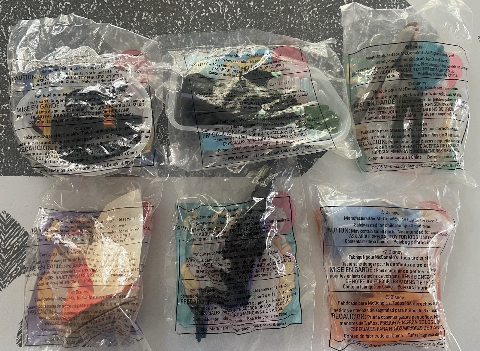 1996 Complete set of 6 Sleeping Beauty Happy Meal Toys in original packages & 50th anniversary miniature lunch box in excellent condition. Thanks for looking.