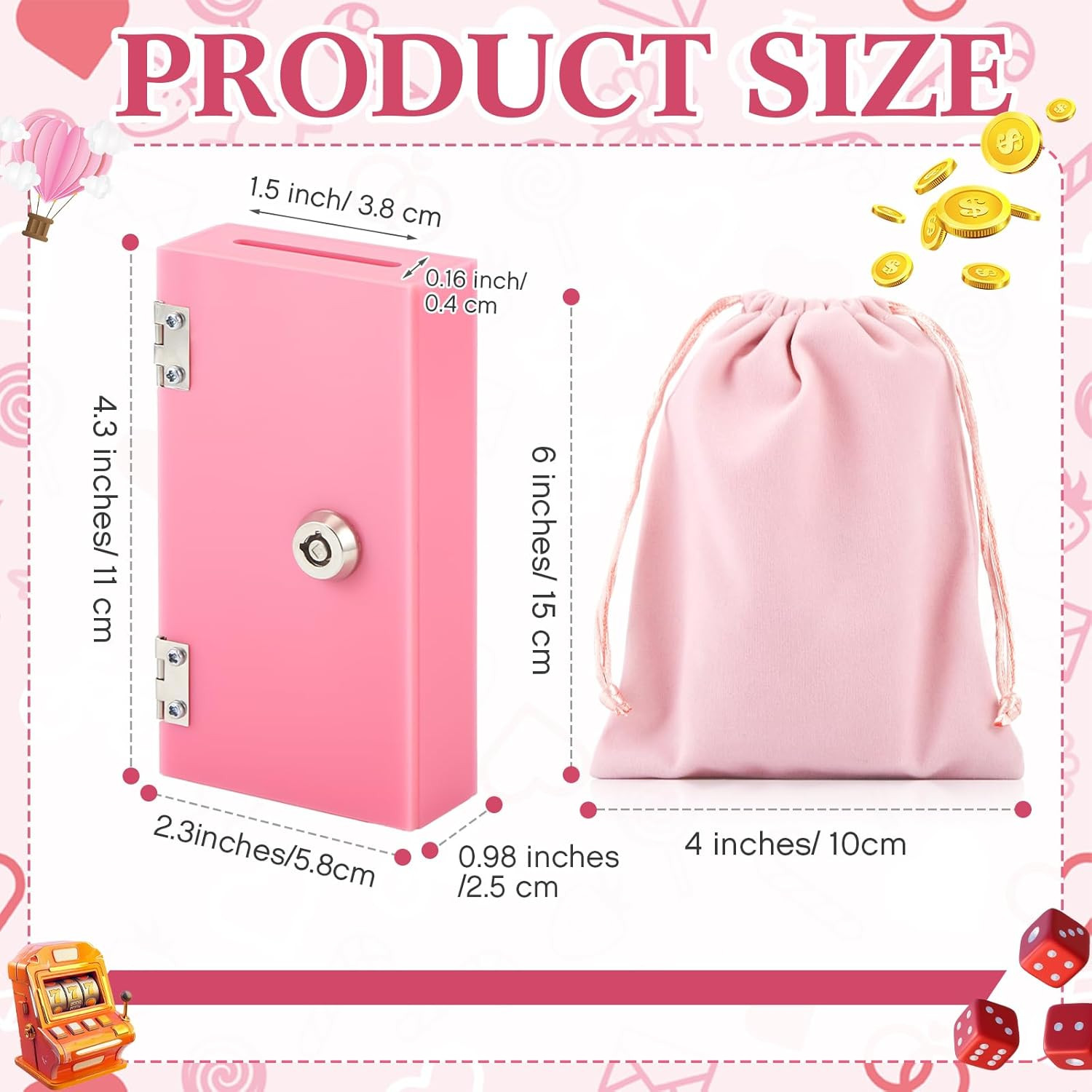 Practical set: You will receive a pink acrylic Gamble Box set, including 1 acrylic money box, 1 storage bag and 2 keys. It not only meets the needs of saving money, but also takes into account the needs of storage, which is practical and beautifulPocket Sized Box: The acrylic Gamble Box measures 4.3 x 2.3 x 0.98 inches, and the storage bag measures 4 x 6 inches. The Gamble Box is pocket-sized and you can carry it anywhere in your pocketReliable material: The acrylic Gamble Box is made of acrylic, which is sturdy and lightweight. The top slot is enlarged for easy insertion of coins, and it is also designed to prevent coins from being easily taken outGo Home Money: Please remember to leave the keys at home. When you win cash at the slot machine put some of it in the box. You can get a safe deposit box. And it can make you go home happyWinners Bank: This acrylic Gamble Box is designed for gamblers. It prevents the gambler from playing all cash to win more back. It is a perfect gift for gambler friends or family Product description