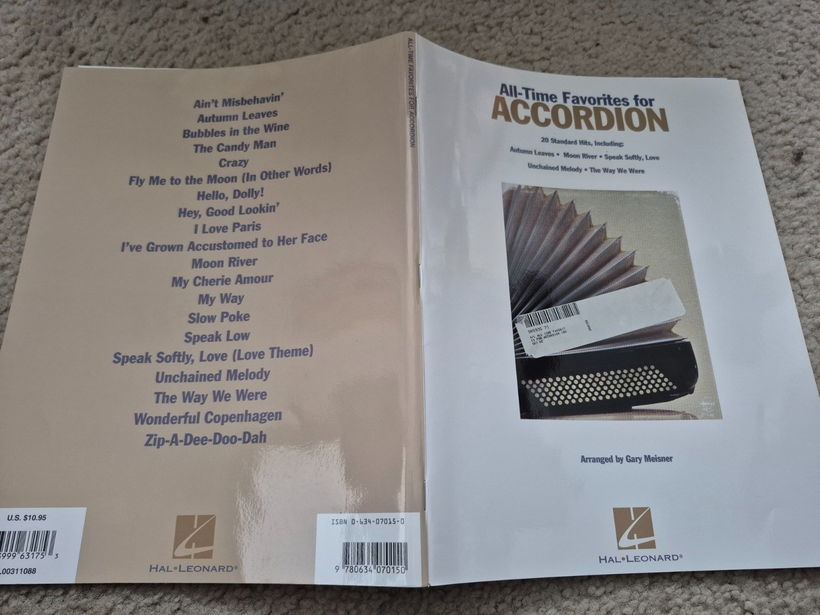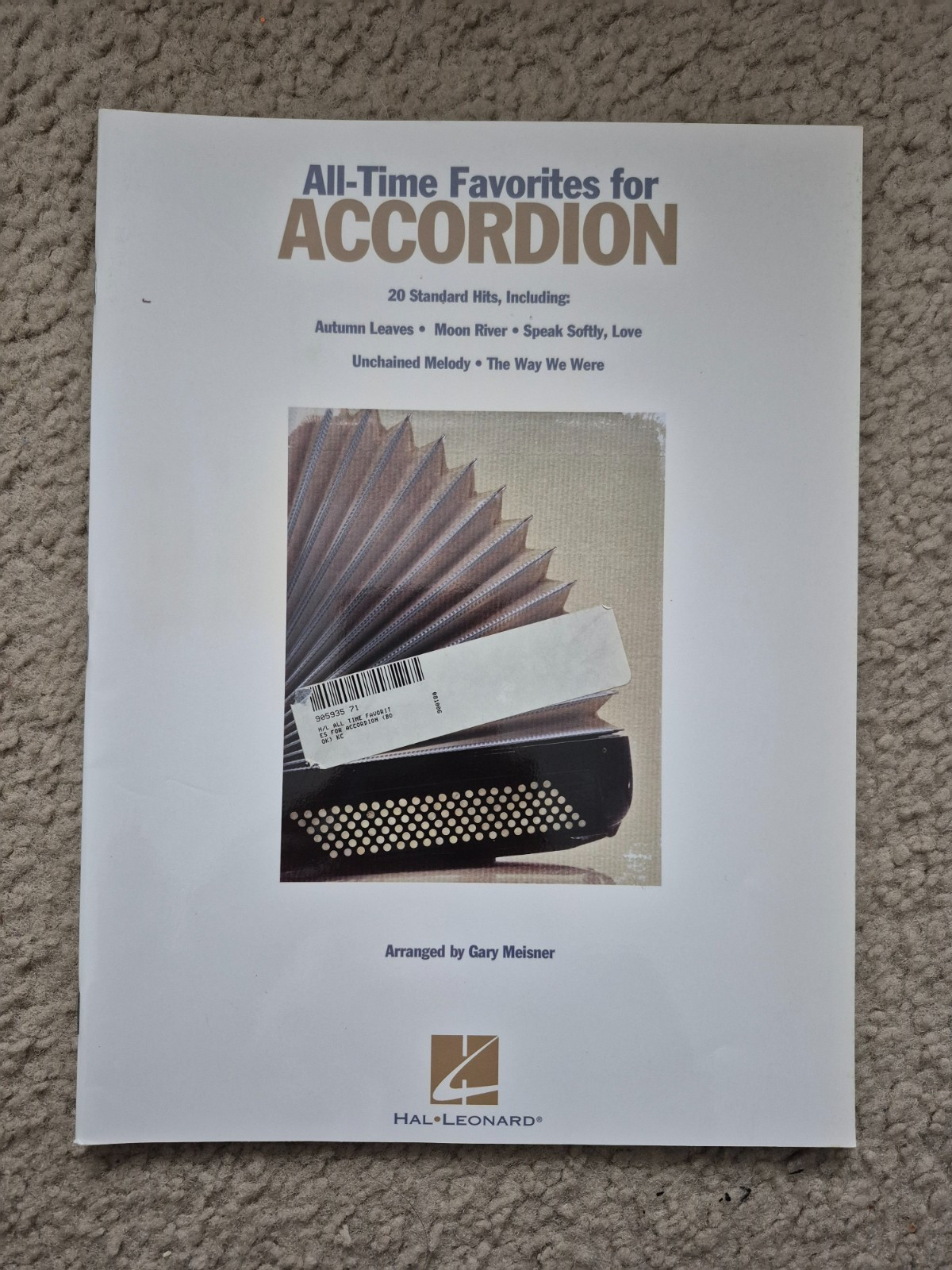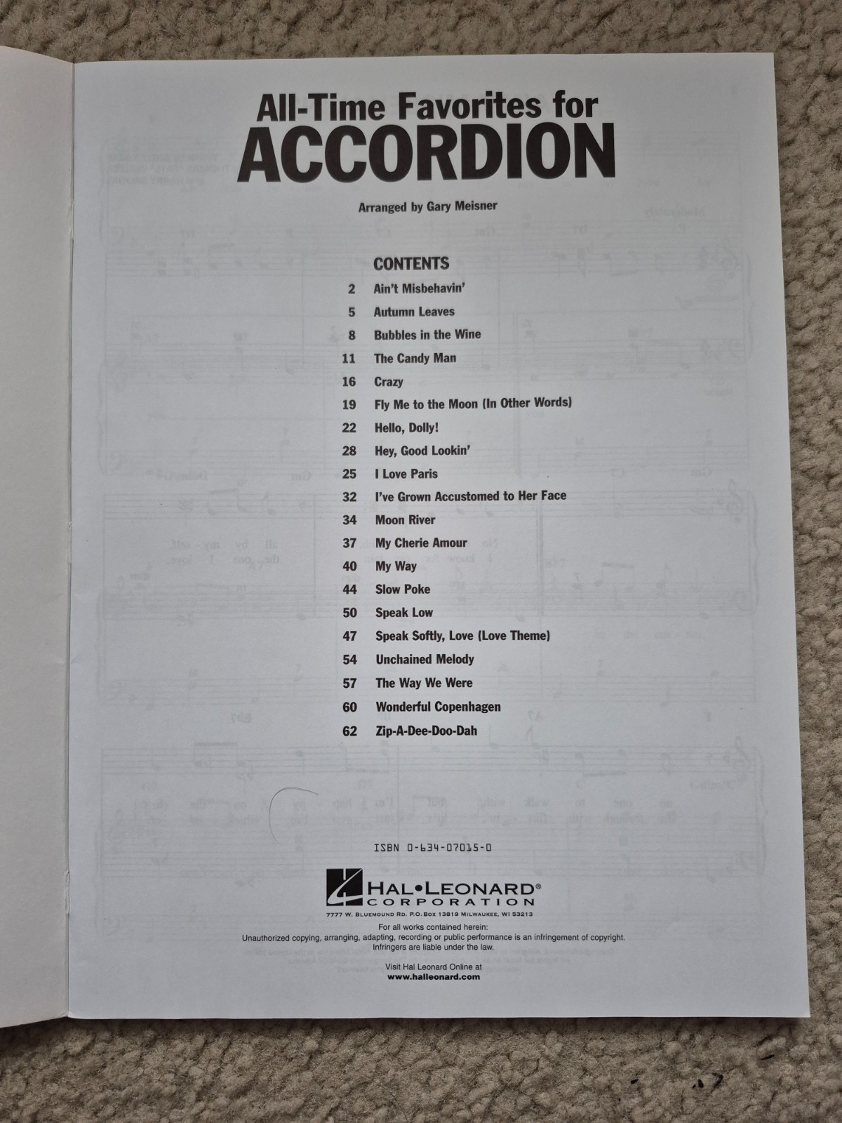 ALL-TIME FAVORITES FOR ACCORDION, arranged by Gary Meisner, includes 20 standard hits with 64 pages. Published by Hal Leonard Corporation. Contents are as follows: Ain't Misbehavin' Autumn Leaves Bubbles in the Wine Crazy Fly Me To The Moon (In Other Words) Hello, Dolly! Hey, Good Lookin' I Love Paris I've Grown Accustomed To Her Face Moon River My Cherie Amour My Way Slow Poke Speak Low Speak Softly, Love (Love Theme) The Candy Man The Way We Were Unchained Melody Wonderful Copenhagen Zip-A-Dee-Doo-Dah