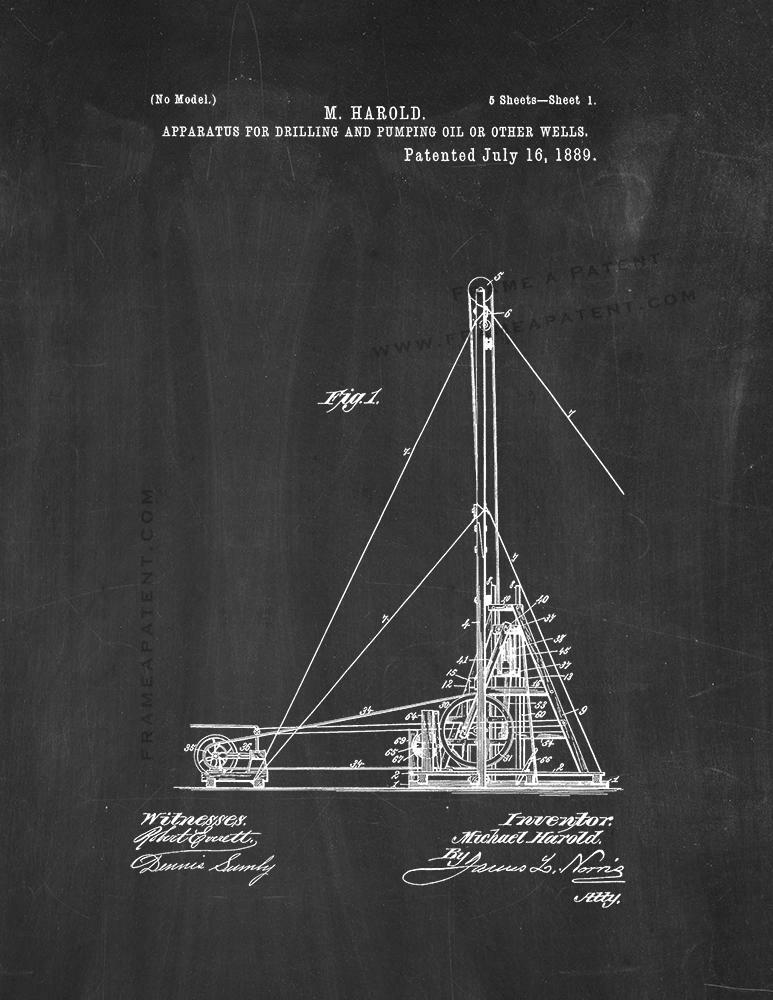 Apparatus For Drilling And Pumping Oil Or Other Wells Patent Print ChalkboardPatent Title: Apparatus For Drilling And Pumping Oil Or Other Wells Patent PrintInventor Name: M. HaroldYear Issued: July 16 1889Item Number: 13069-54Reprint of original PatentPatent is printed on premium heavy weight matte paperYour choice of sizes: 5"x7"; 8"x10"; 8.5"x11"; 11"x14"; 13"x19"; 16"x20"; 18"x24"; 20"x24"; 24"x30"; 24"x36" Made in USA.Great gift ideas for any professional; hobbyist; or collector!Note: The image shown above of the Patent Art and Frame(if applicable) are shown in a low resolution untouched up version for easier web browsing. The print you will receive will be of a higher restored version(which includes cleaning up stray marks; straightening; etc) but it will maintain the original look of the patent. It will also not have our logo on it. We take time and great care in giving you the best possible looking print. You are not purchasing any patent rights. Check out our other eBay items here