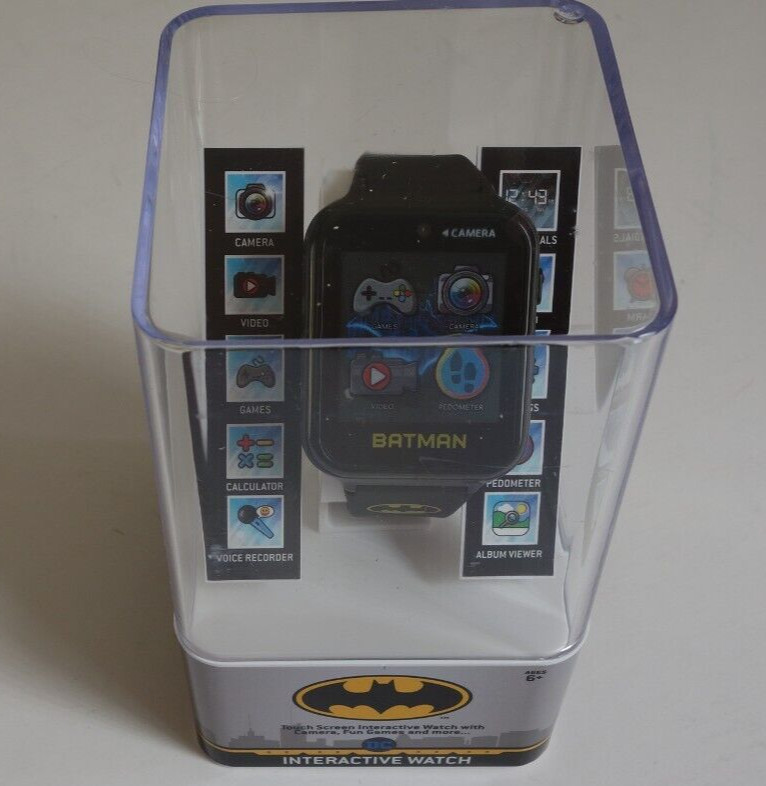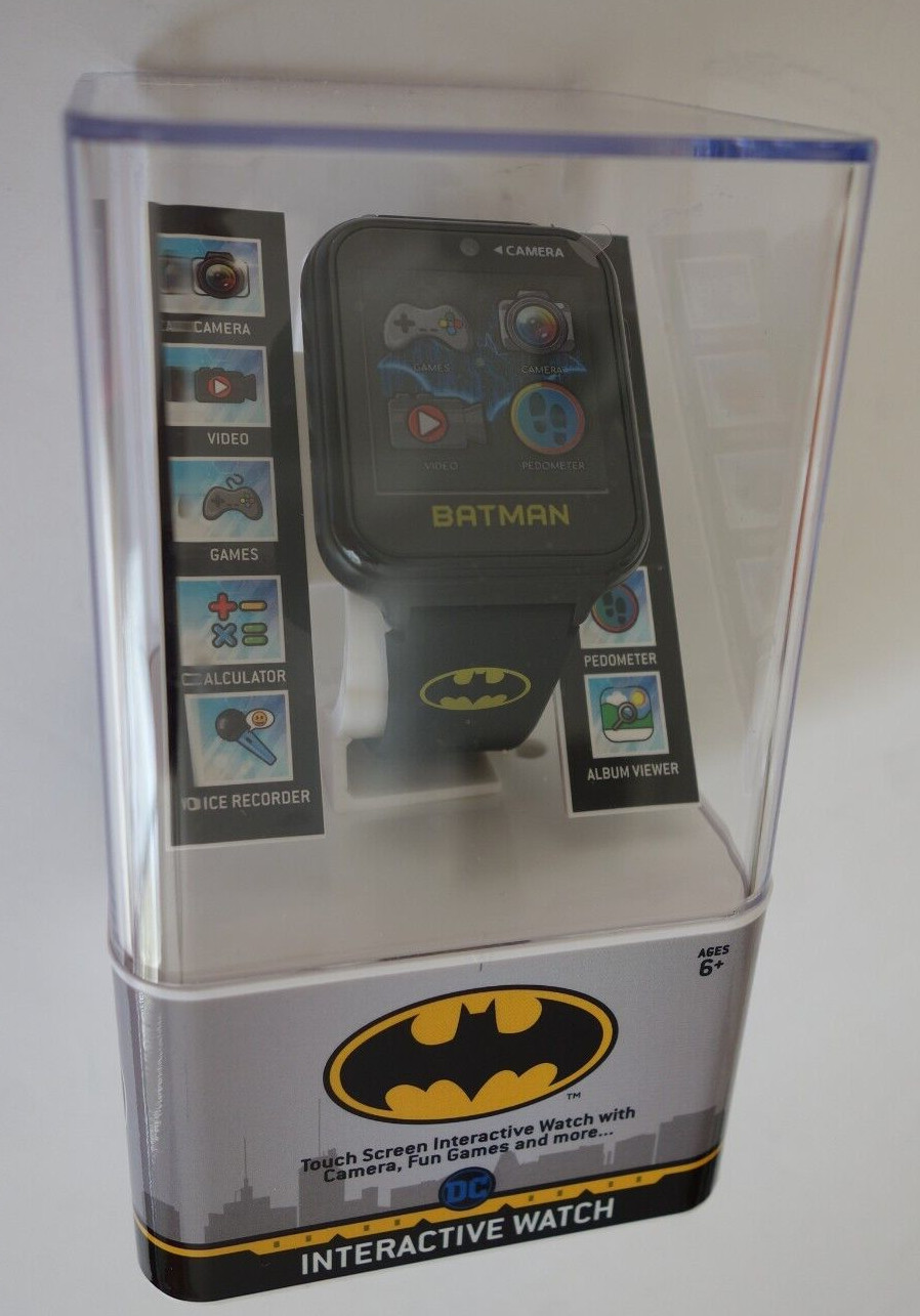 Kids' Batman Interactive Smart Watch Multi Color Large New $49.99 BAT4740KLFeaturing awesome Batman designs, pre-loaded games and ten cool watch faces to choose from, this kids' interactive smart watch will keep your little Dark Knight-in-training busy for hours of fun playtime.FEATURESStep, distance and calorie counterTouchscreen gamesPhoto and video cameraVoice recorder5 digital and 5 analog changeable clock facesCalendar: dateAlarm & TimerCASEMaterial: plastic with screw-down backFace cover material: plasticSize: 40 mm x 40 mmBANDMaterial: rubberClasp: buckleCircumference: adjusts from 140 mm to 220 mmWidth: 19 mmDETAILSPower: batteryWater resistance: no ratingPackaging: boxed