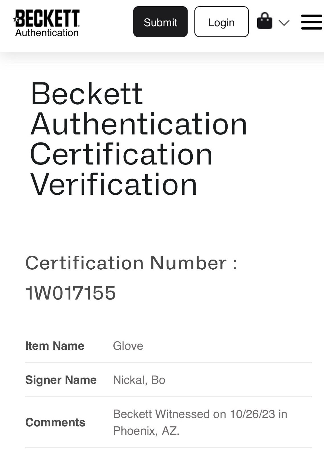 Custom right-hand American Flag Glove is hand-signed by Bo Nickal (UFC).The autograph includes an official Beckett Authentication Services serially numbered hologram for authenticity purposes.** Please note silver ink smudging on rear of glove.
