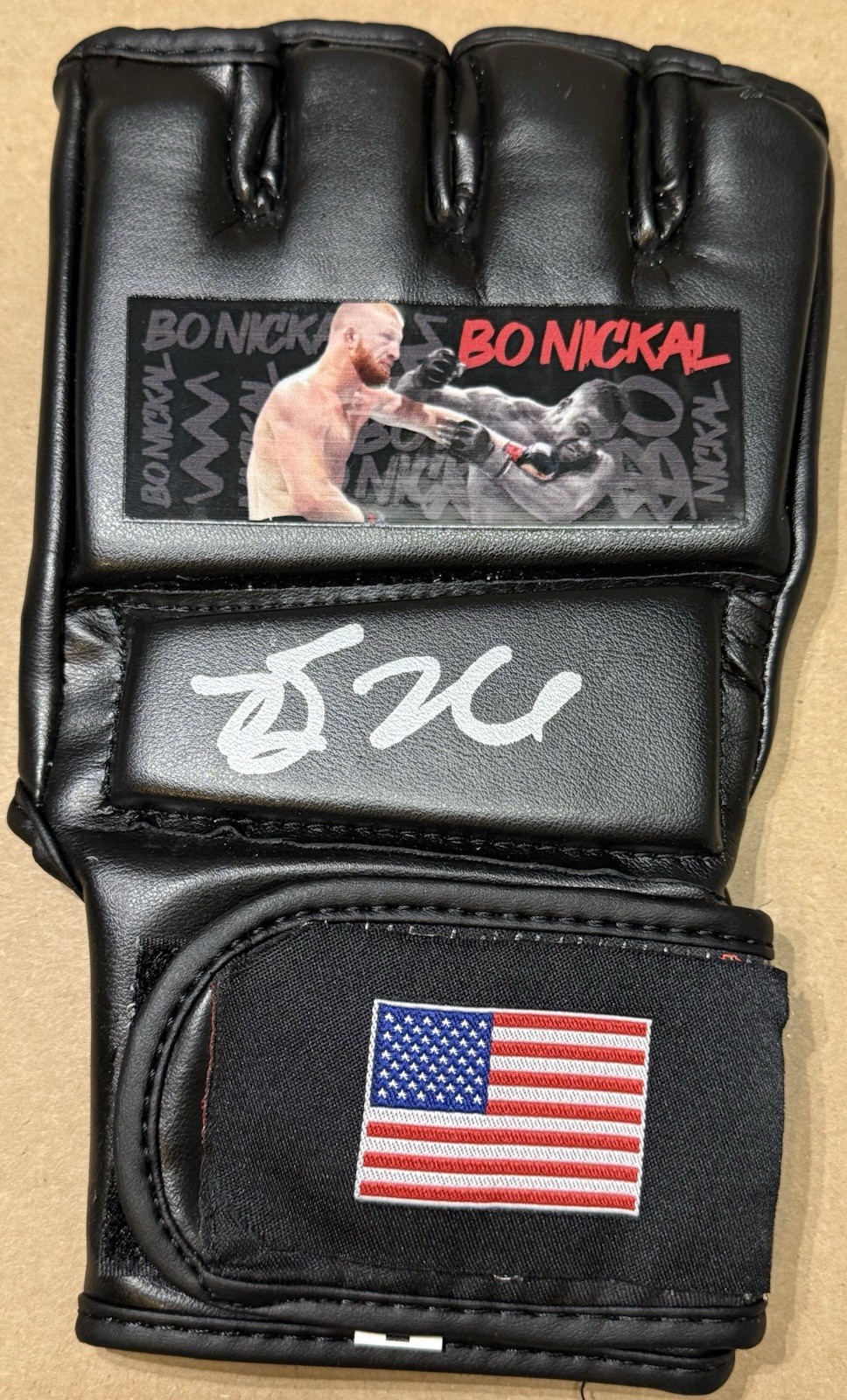 This listing features a Bo Nickal signed UFC/MMA fight glove with Beckett authentication. Condition is not specified, so check the listing for details on wear, display quality, and any included packaging or COA information. Free shipping is included; review the listing for the carrier, handling time, and any shipping restrictions that may apply. See the photos and description for all included items and signature placement.