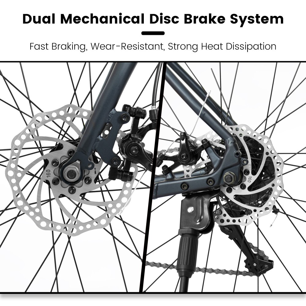 Road Bike Specifications body Road Bike Specifications Lightweight Aluminum Frame: Crafted from high-strength, lightweight aluminum alloy, this road bike features a streamlined aerodynamic geometry that reduces wind resistance while enhancing frame rigidity, balancing long-distance stability and agile handling. Precision 16-Speed Shifting: The professional 16-speed transmission system, paired with a high-efficiency rear derailleur, delivers smooth, seamless gear changes. It ensures effortless cruising on flat roads and fluid climbing on inclines, adapting easily to diverse conditions from urban commutes to countryside rides. Dual Disc Brake System: Equipped with front and rear mechanical disc brakes, the bike offers linear, responsive braking with strong stopping power. It maintains reliable performance even in wet weather or on gravel roads, significantly boosting overall riding safety. Ergonomic Riding Comfort: The design with an adjustable stem allows you to flexibly adjust your riding posture to reduce fatigue. Paired with thickened non-slip handlebar grips and a breathable comfort saddle, it effectively relieves muscle strain during long rides, prioritizing your comfort for extended cycling sessions. Convenient & Practical Features: Quick-release wheel sets simplify assembly and maintenance. Reflective stickers and a side stand enhance visibility for safe night riding and make parking hassle-free. The sleek dark gray finish delivers a premium, modern look that suits any setting.