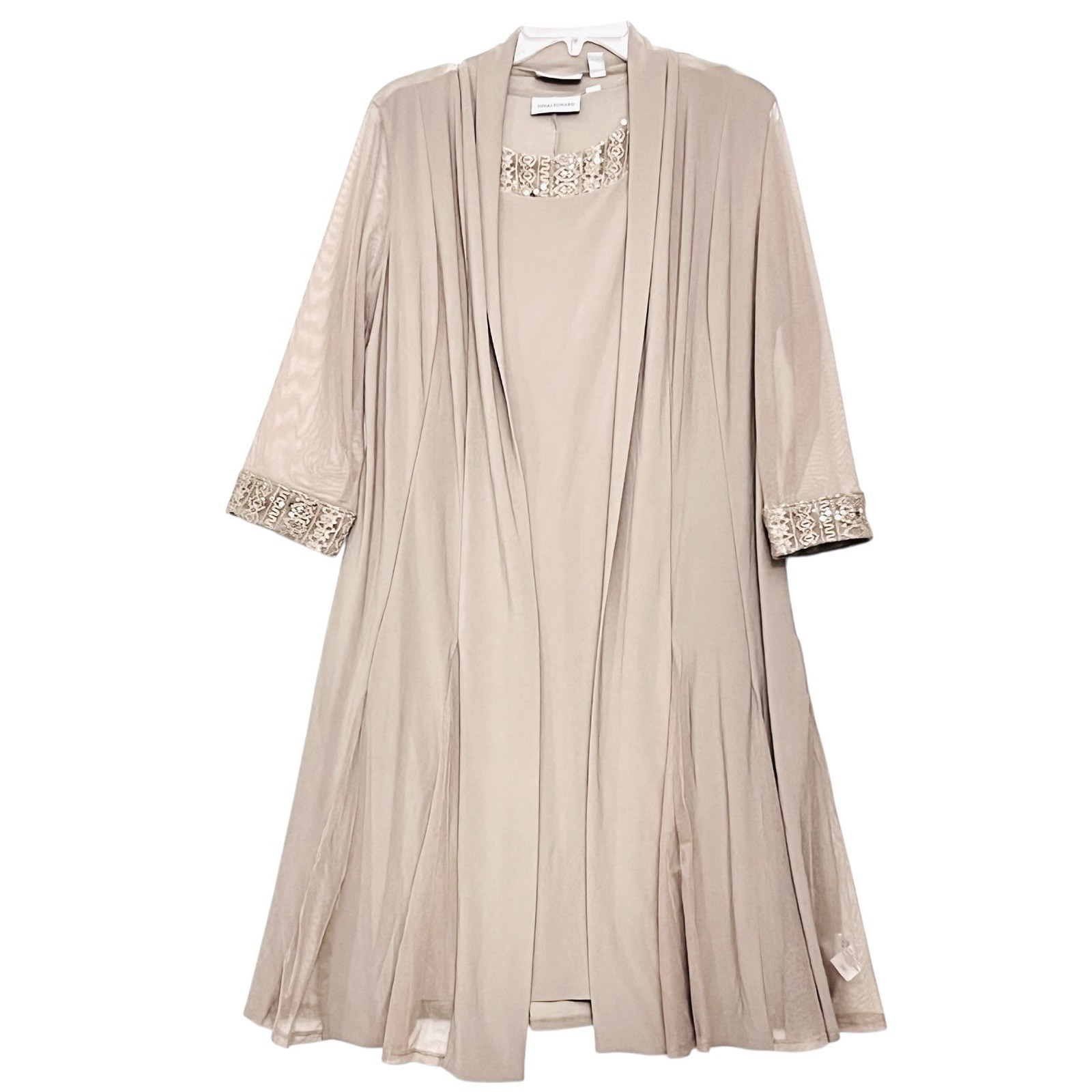 This Nina Leonard 2-piece outfit includes a lace and sequin sheath dress paired with a long open-front blazer with mesh details. It is new with tags and priced at $42.00 USD. Free shipping is included, making it a convenient option for updating your wardrobe or gifting. Check the listing for details on sizing, color, measurements, materials, and care instructions, as those specifics are not provided here.