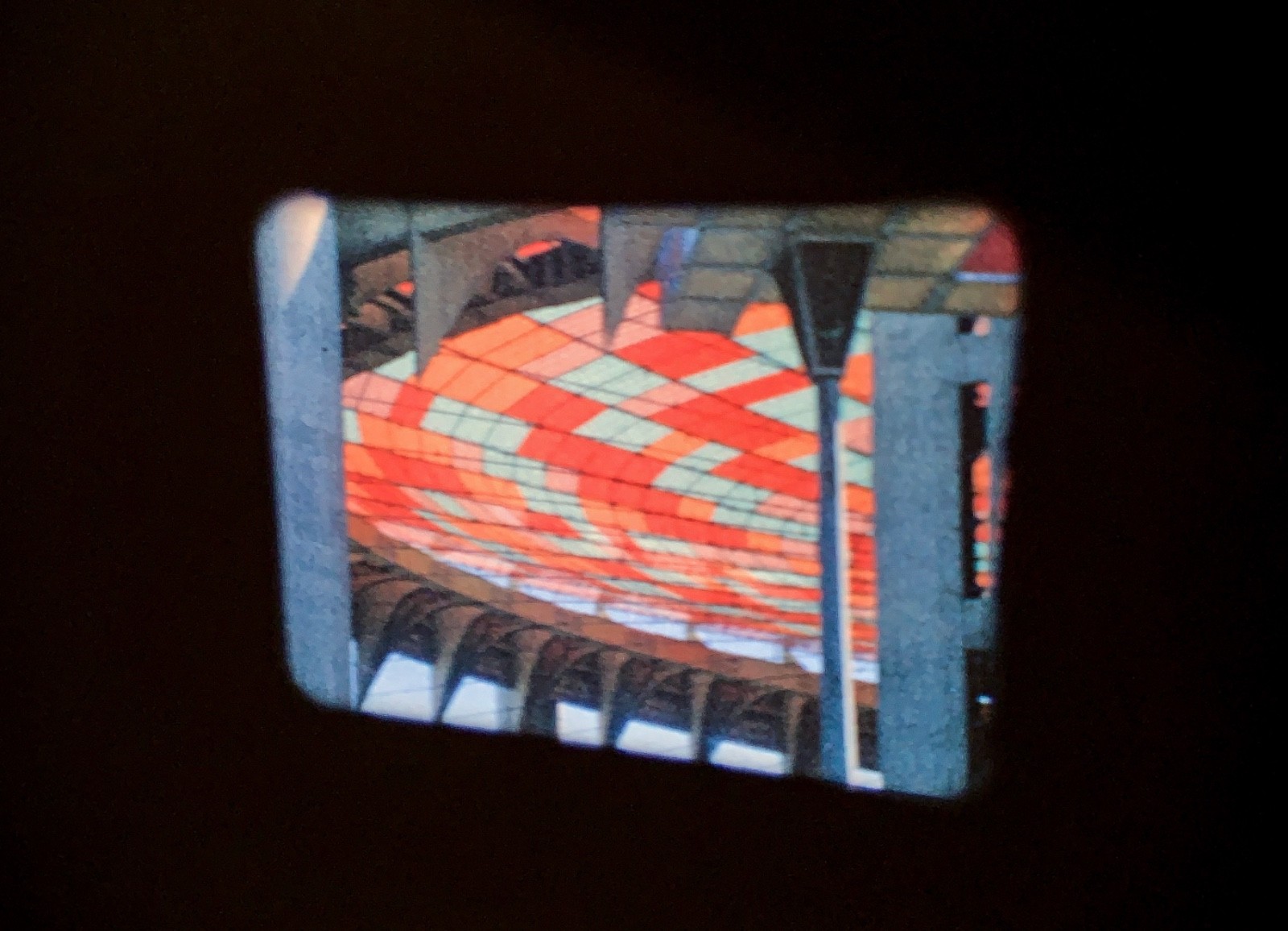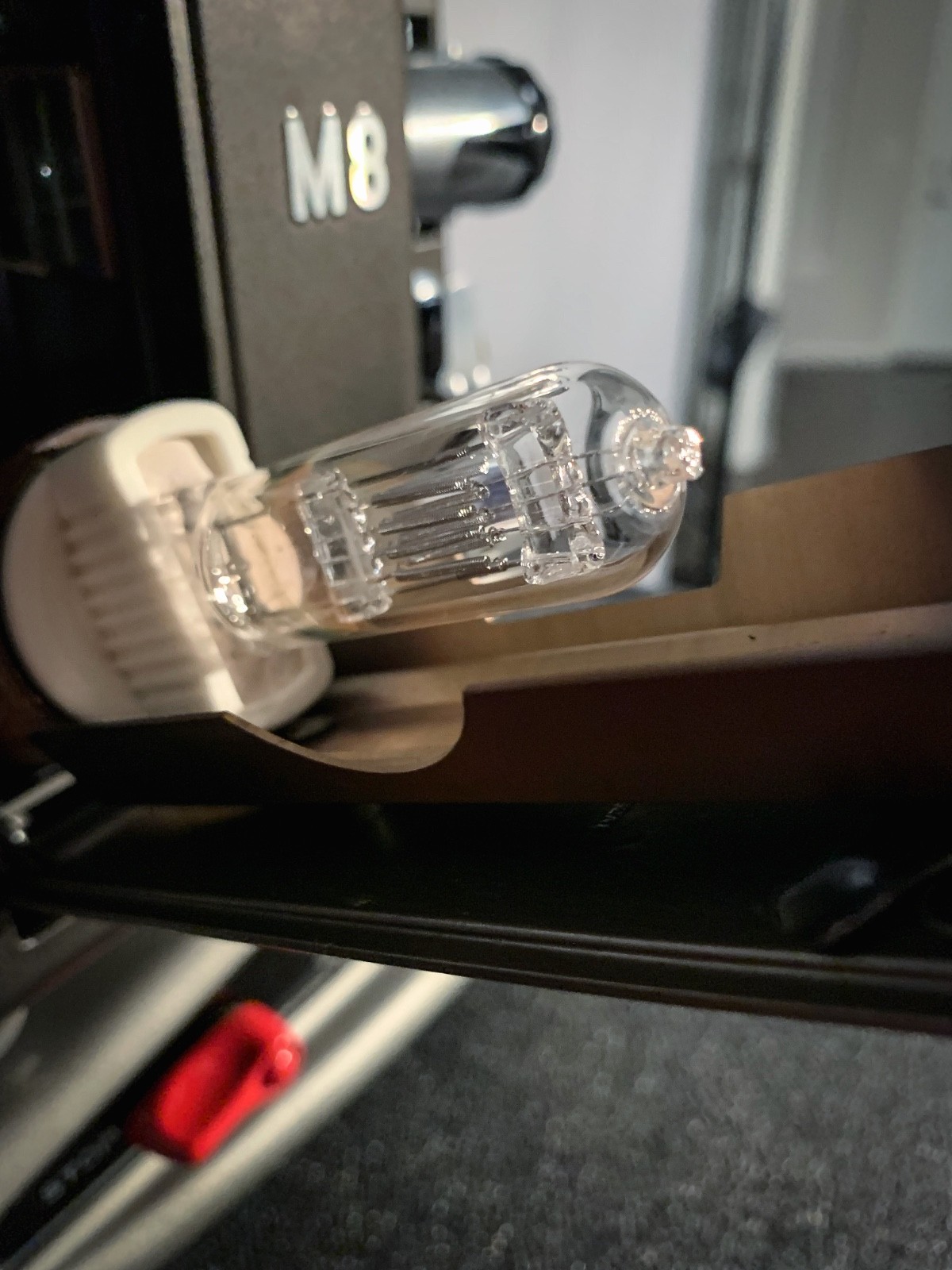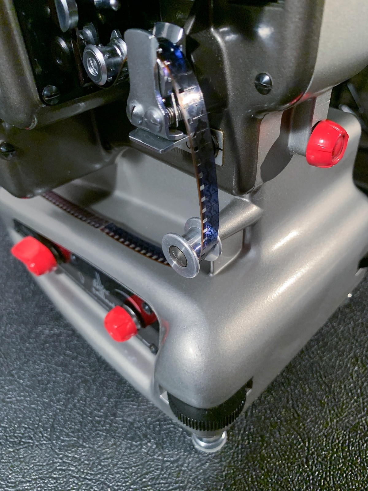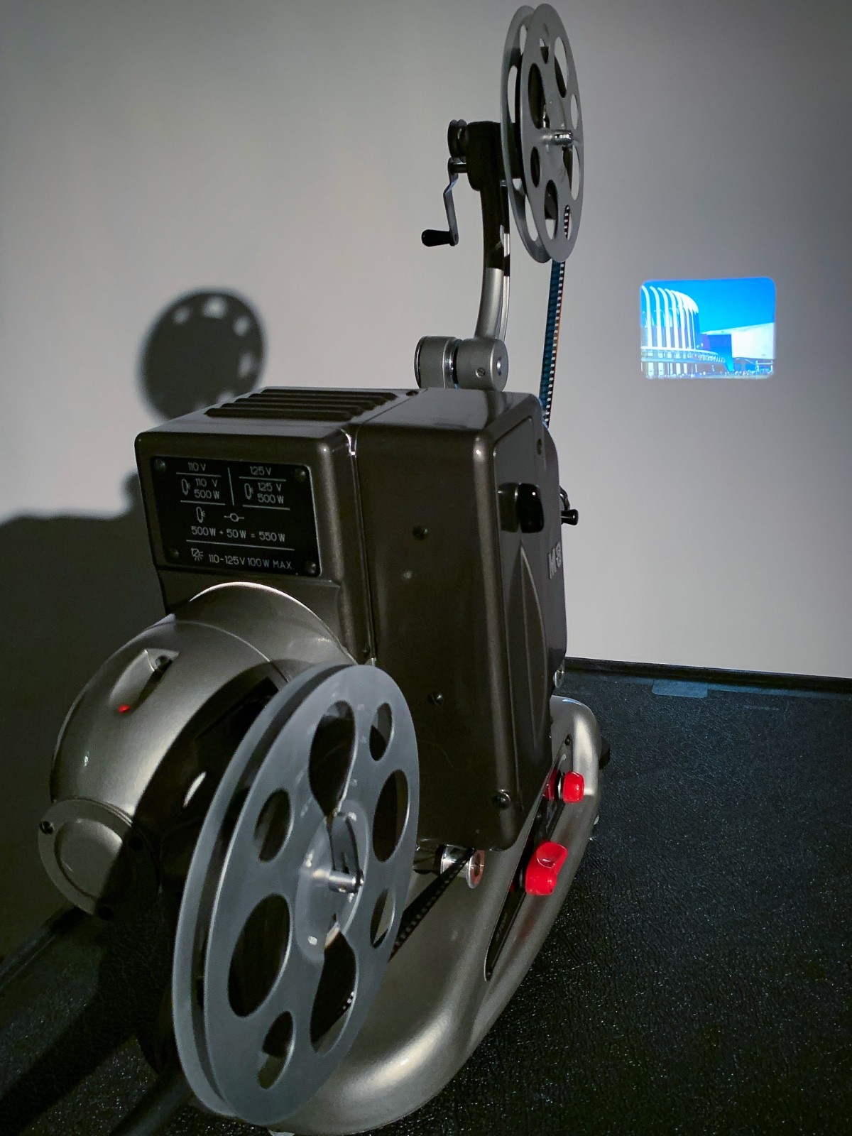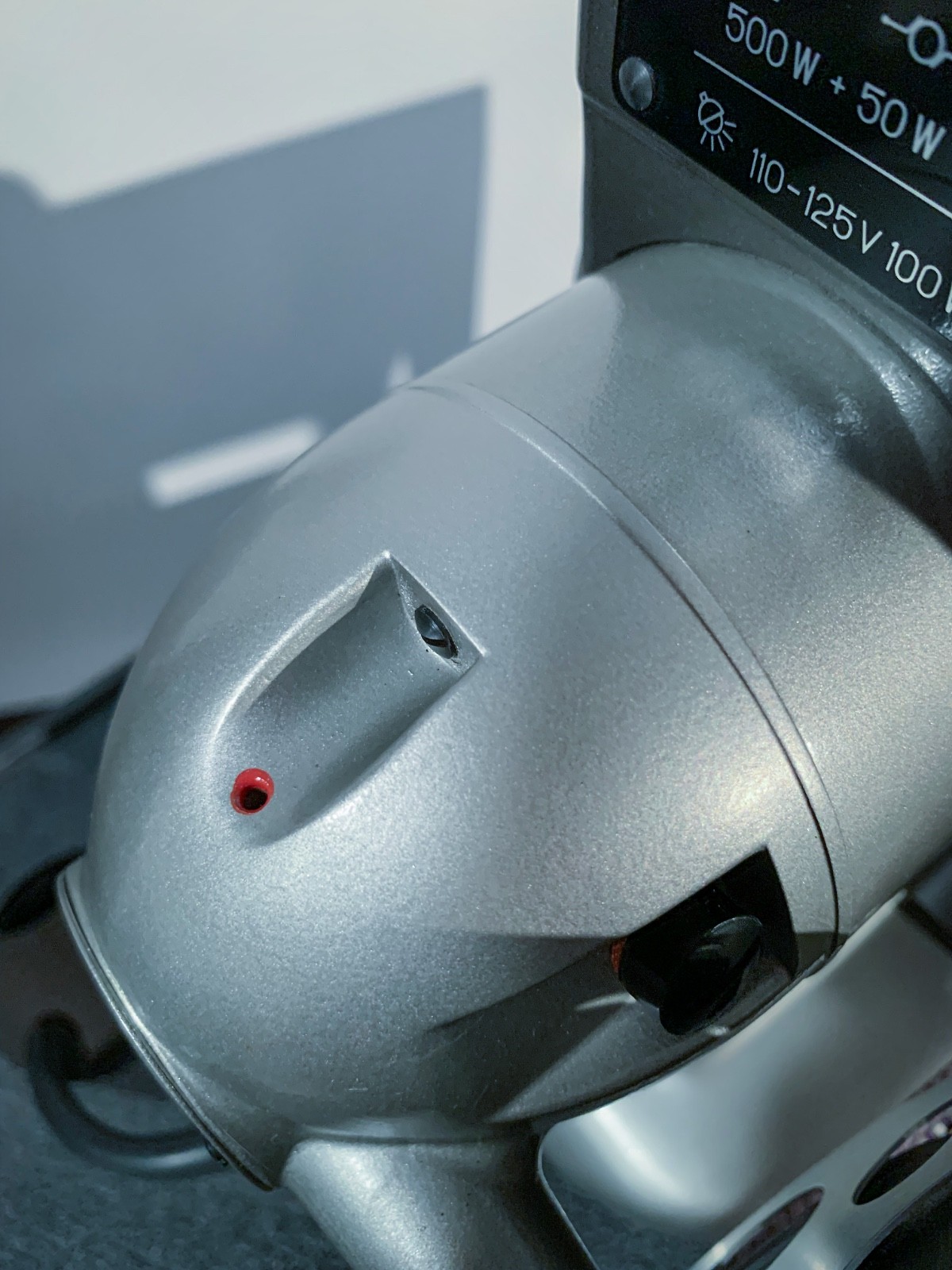 accessories that rarely survive together: the original instruction manual, guarantee certificate, and even the hang tag from its 1959 sale. The original oil bottle remains in its small cardboard container, along with its cylindrical box and the cylindrical lens box. There’s the original cleaning brush—keep this as part of the collection, but don’t use it. After 65+ years it’s shedding bristles. For actual gate cleaning, use a PEC PAD with film cleaner or isopropyl alcohol (PEC PADs available from B&H in New York). Projection Lamp Upgrade:The original 500-watt projection bulb still works and will be included in the Osram box from the upgraded tungsten halogen lamp. Even the original projector box is included—cleaned and structurally sound despite some cosmetic wear from the decades.While these projectors aren’t particularly rare, finding one professionally restored by a filmmaker/photographer—thoroughly cleaned, properly lubricated, and upgraded—combined with complete original documentation and