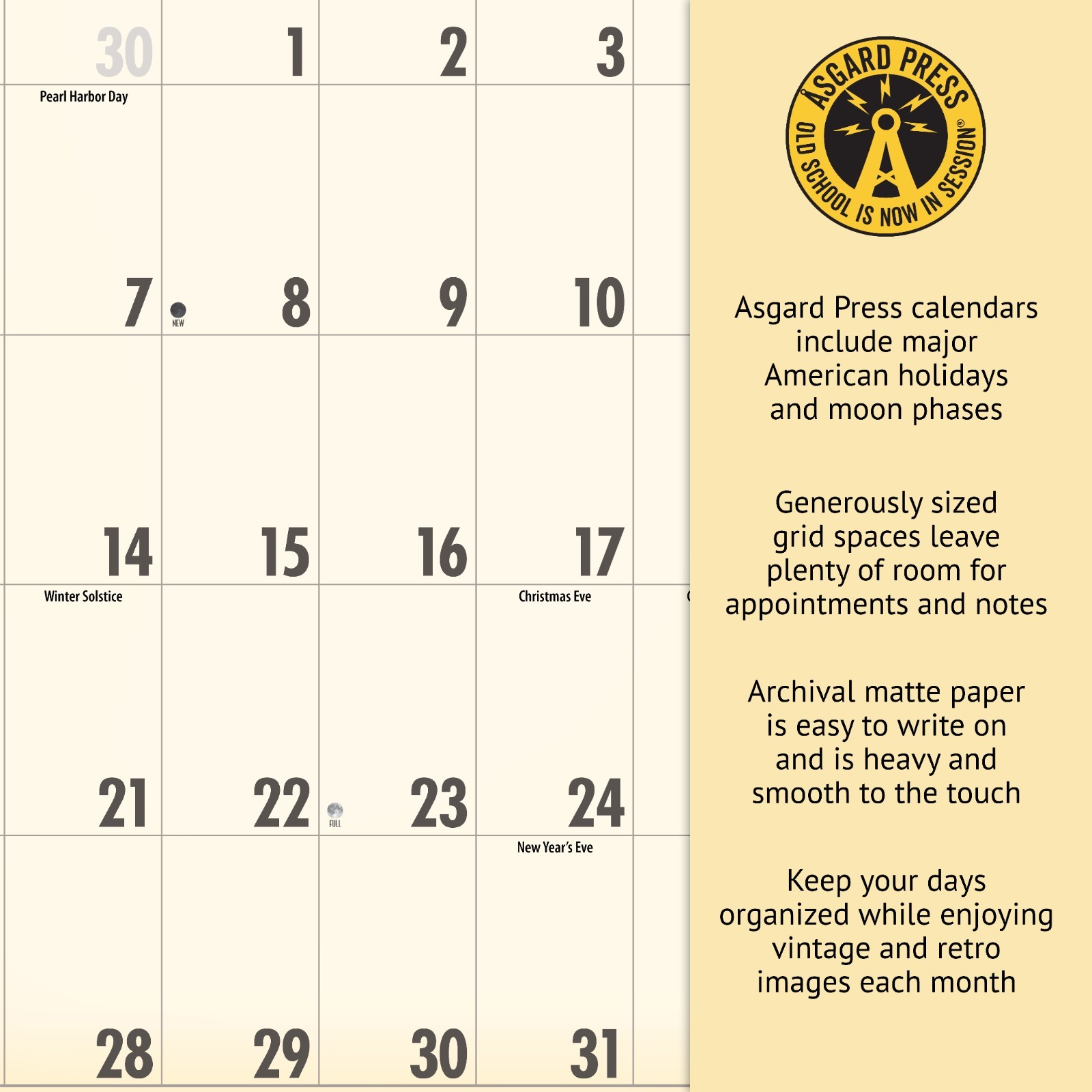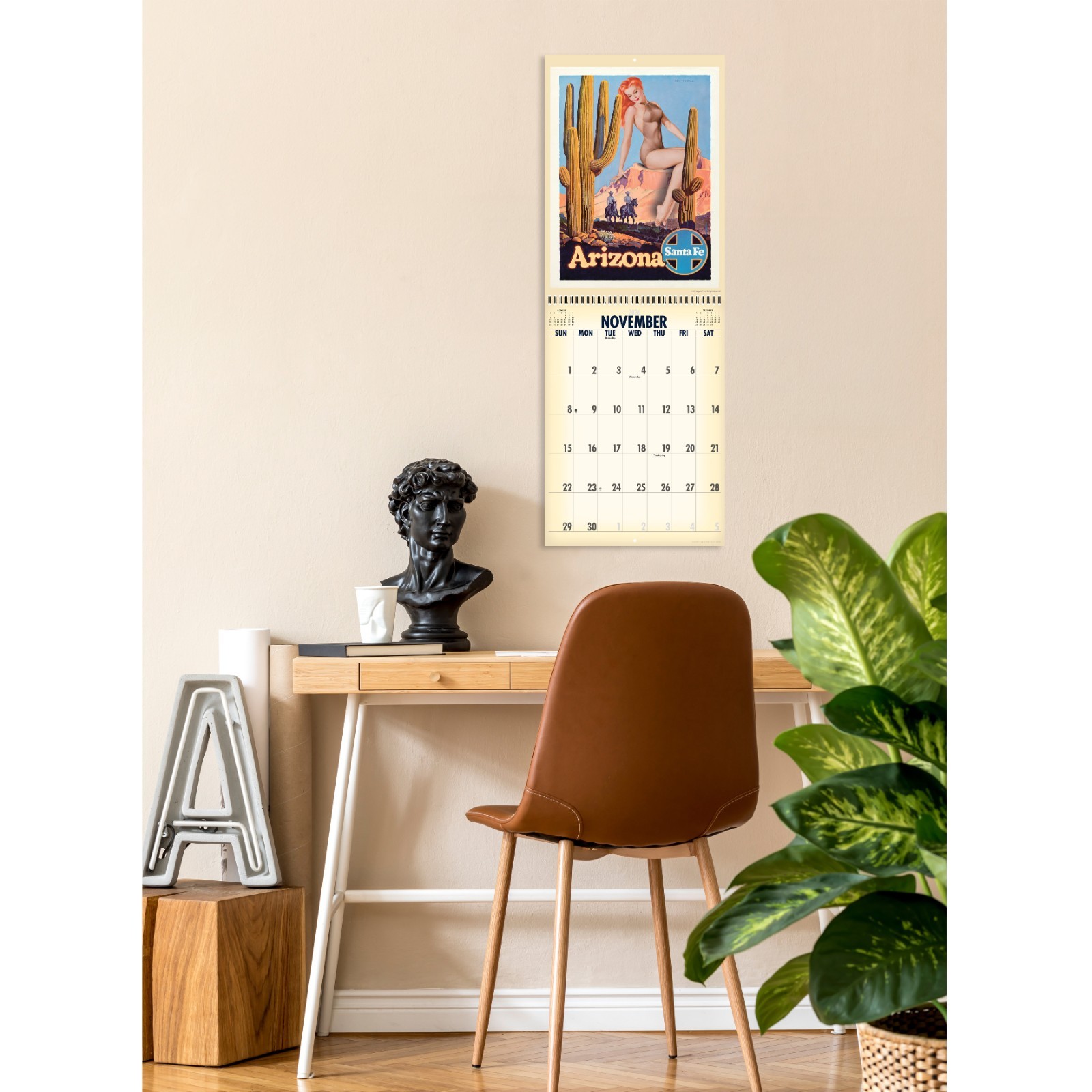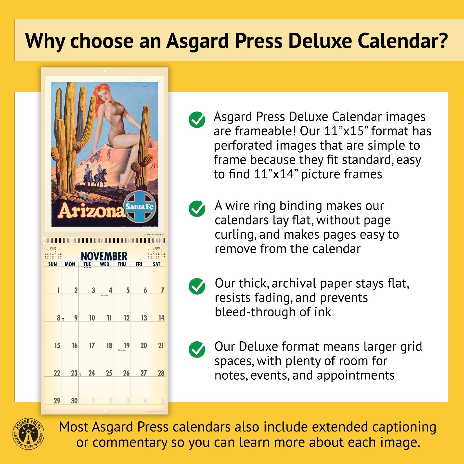 Asgard Press 2026 Retro Parks & Pinups Deluxe Wall Calendar 16-month hanging calendar of frame-ready prints featuring national parks, travel posters, and pinups The majestic splendor of U.S. National Parks and other outdoor destinations is made even more beautiful with the addition of pinups in the Asgard Press 2026 Retro Parks and Pinups Deluxe Wall Calendar, an eye-catching collection of prints featuring vintage travel posters infused with mid-century pinup art. Each month, a different destination is taken over by a glamorous lady making herself at home. The Asgard Press 2026 Retro Parks and Pinups Deluxe Wall Calendar features vintage national park travel posters from the 1920s through the 1950s collaged with pinup illustrations from the 1940s and 1950s. With its large vertical format of 11x15 inches, our wire-bound deluxe wall calendar opens to an impressive 11x30 inches. The perforated design allows for easy removal of each month's image, making them a perfect fit for standard 11x14 inch frames. Generously sized grid spaces leave plenty of room to keep track of all your appointments, reminders, and events. Fun for both home and office, this calendar will help you organize your time while beautifying your space. 2026 DELUXE WALL CALENDAR of vintage American travel poster art made more beautiful with the addition of pinupsLARGE FORMAT opens to 11"x30" with spacious grid pages for at-a-glance organization of appointments and events, and includes major US holidays and moon phasesINCLUDES 13 EASY-TO-REMOVE PRINTS that fit standard 11"x14" frames for sustainable reuseUSE THIS CALENDAR RIGHT AWAY with mini-grid page of the last 4 months of 2025HEAVY, ARCHIVAL PAPER vibrantly showcases each month's image and prevents bleed-through of pen or marker ink on grid pages