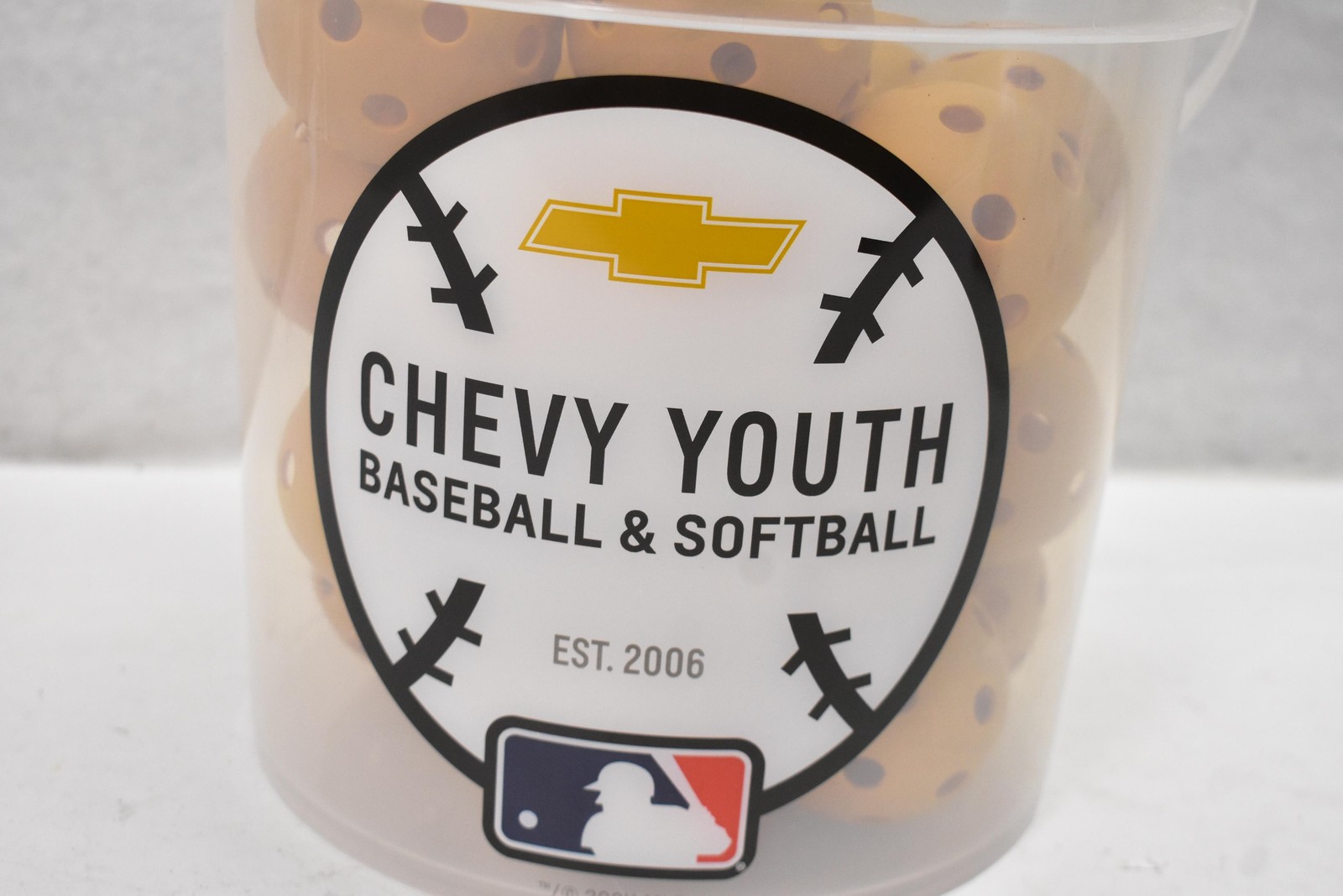 Brand: Franklin Sports.Item: 24 Indestruct-A-Ball practice balls with plastic storage bucket and lid.Color: Yellow vented practice balls with black recessed holes.Material/Construction: Molded plastic vented practice balls; translucent plastic storage bucket with snap-on lid and carry handle.Ball Size: 9 in.Design details: Each ball features multiple evenly spaced vent holes for airflow and reduced impact; bucket displays Chevy Youth baseball graphic and MLB logo on front.Branding and markings: Bucket and lid include Franklin logo and Chevy Youth Baseball & Softball artwork; product sticker reads 24 INDESTRUCT-A-BALL and MADE IN CHINA.Product codes: Label reads 24870S74 and 6231010068. UPC: 025725455696.Included: 24 Franklin Indestruct-A-Ball practice balls in the storage bucket with lid and handle only; no other