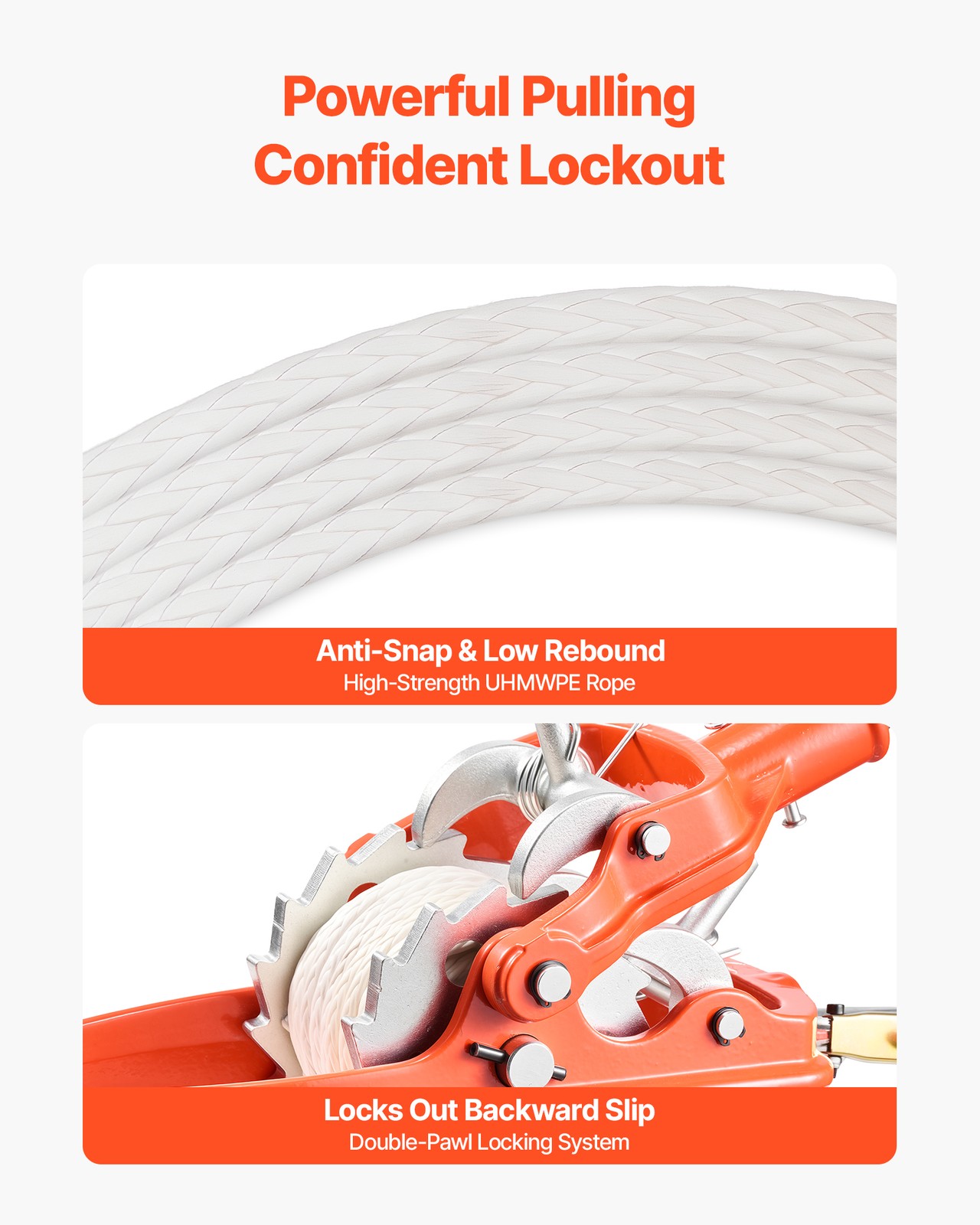 size delivers impressive pulling strength without extra bulk. This cable winch puller works without electricity, so it is always ready to go. The portable design fits perfectly in trucks, trailers, workshops, or garages for quick access. Features & Details Built Tough for Heavy Work: This rope puller uses a Q345B cast steel frame and thickened ratchet parts for solid strength. The double-line mode handles a 3T working load with up to 5T breaking strength, ready for serious pulling fun Double Security Protection: This come along winch includes a 35 ft high-strength UHMWPE rope that resists wear and corrosion. The dual pawl locking system grips loads firmly and helps prevent sudden release during tensioning Easy and Comfortable to Use: This cable winch puller features two forged steel hooks with self-closing safety latches. The 18 in non-slip PVC handle adds leverage and keeps your hands comfortable on long pulls Rust-Resistant for Outdoor Use: This ratchet power puller tool uses white zinc plating and a powder-coated finish. The protected metal parts help resist dampness and wear, making outdoor work more hassle-free Ready for Many Scenarios: This ratchet power puller tool works great for yard cleanup, off-road recovery, farm equipment moving, and jobsite pulling. The versatile design makes tough tasks feel lighter and smoother SHIPPING ABOUT US PAYMENT RETURNS CONTACT WARRANTY Welcome to our eBay store. As a leading and emerging company in manufacturer and exporting business, we are specialized in Business and Industrial Products, Sporting Goods, Pet Products, Home and Garden products for more than 10 years. We believe that it is our vision and mission to provide innovative products with best service and competitive price to satisfy you. Our goal is to make sure that you can find exactly what you are looking for and make it easy for you to place your orders. We accept PayPal payment,PayPal Credit,Credit card or debit card and so on.Payment should be completed within 4 (Four) days of auction closing. Or unpaid dispute will be filed for closing auction.We will leave a positive feedback immediately after payment is received. We appreciate a positive feedback as much as you do. If for some reason there is any issue with the purchase, please contact us prior to leaving feedback, we will be glad to work together and provide a satisfying solution. Please be aware that PO Box cannot receive items,please DO NOT fill in the PO Box address. DELIVERY DAYS: 3-7 BUSINESS DAYS 3 BUSINESS DAYS SHIPPING OUT SHIP FROM CA & TX & NJ & GA & NC &OR WAREHOUSE California Warehouse: City of Industry, CA Texas Warehouse: Houston, TX New Jersey Warehouse: Perth Amboy, NJ New York State Warehouse: Perth Amboy, NJ Georgia Warehouse: Austell,GA North Carolina Warehouse: Grove NC Oregon Warehouse: AIRPORT WAY Portland,OR All of our items are backed with a 30-day return policy. We ensure all our items are new and in excellent condition prior to shipping. In case you receive the item that is not to the standards above, please contact us via e-Bay messages. All returns must be in new original condition as received and should be shipped with delivery confirmation Please note that all returns must be pre-approved by us. Unauthorized returns will not be accepted. If you need to return, please check twice to confirm the item not work and contact our customer service representative, let us know the detailed problem and send us some pictures for confirmation. We ONLY accept returns with original package. Please make sure that item has NO man-made sabotage. Used items will not be accepted for return. Email Customer Support: 9:00am-2:00am PST Sunday-Friday All emails will be responded to within 12-24 hours This item comes with 12 months Warranty from the date of customers purchased it. Special circumstances will be listed clearly in the listing. If your item has been damaged in transit or become faulty in warranty period, please email us with pictures or video to show the problem. Please do check everything carefully after you received the parcel, any the damage except DOA (Dead-On-Arrival) would not be covered if it's your fault. Replacement products are provided with the same warranty as the returned products. VEVOR 3T Rope Puller This rope puller makes heavy pulling, tightening, and tensioning feel simple and fun. The strong UHMWPE rope handles farm work, forestry tasks, outdoor jobs, and professional use with confidence. This power puller uses a secure ratchet system that keeps the rope firmly in place. The stable grip helps avoid sudden releases and keeps pulling and transport jobs more secure and more controlled. This ratchet power puller tool switches easily between single and double rope modes. The ergonomic handle lets one person move heavy loads smoothly, even when working alone. This come along winch handles big challenges like moving heavy equipment or helping vehicles out of mud. The compact