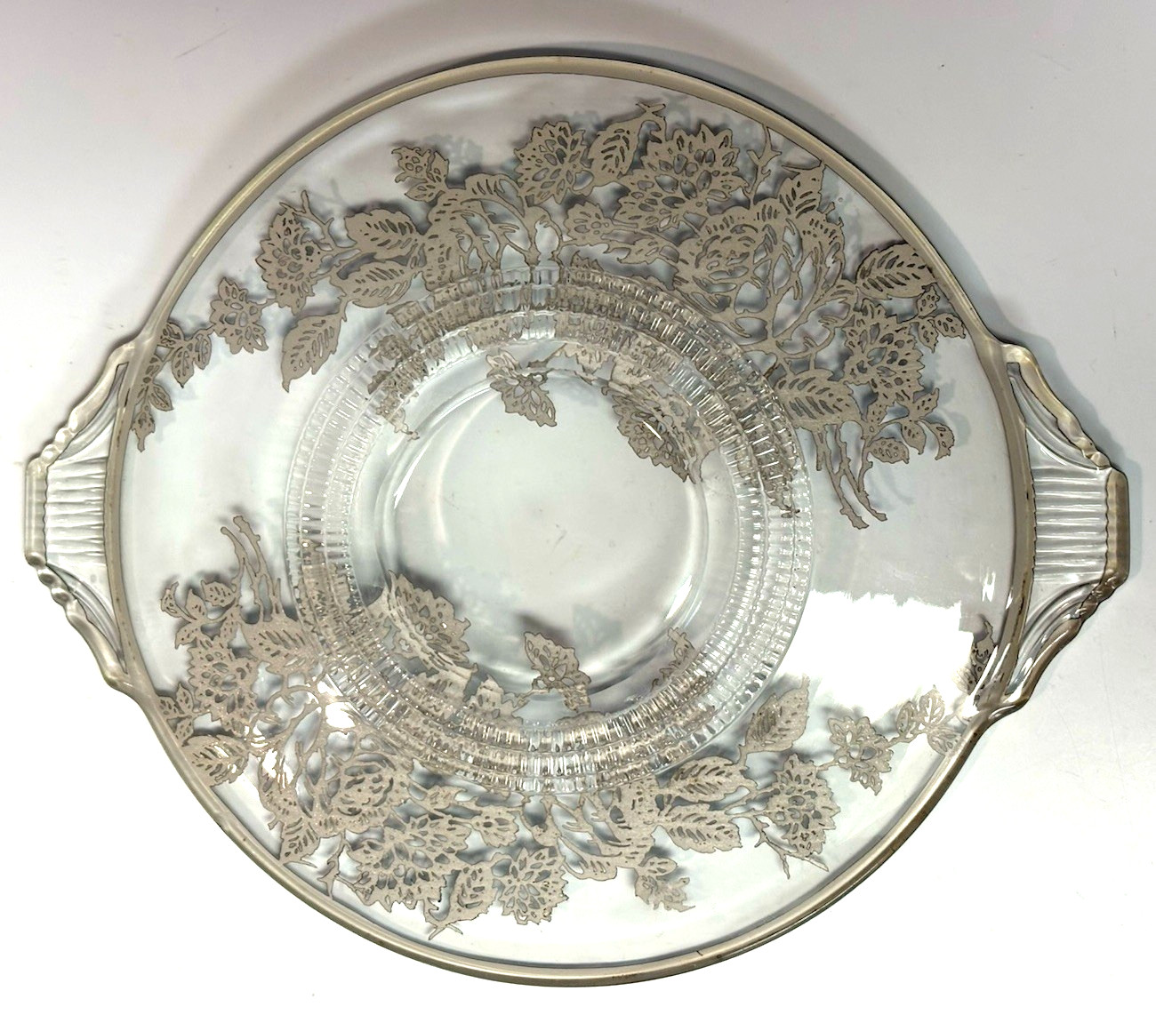 Sterling Silver Overlay 8" Glass Serving Dish Handles Rose Pattern Mid-Century