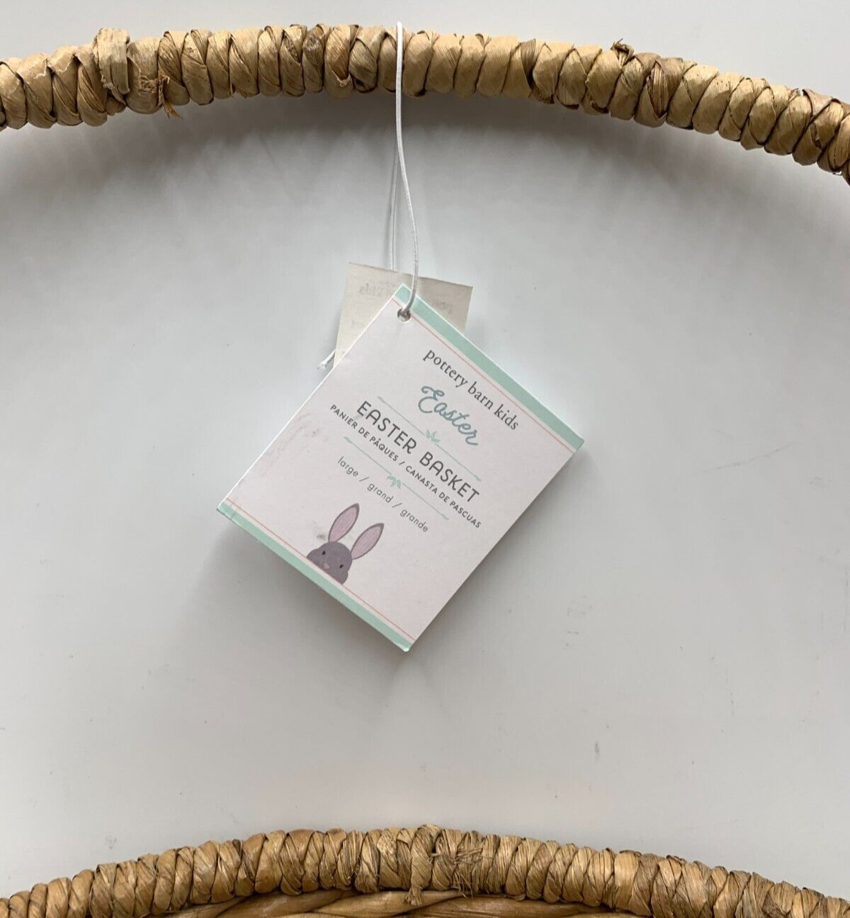 Pottery Barn Kids Natural Seagrass Iron Frame Easter Basket - Great Feature! Collapsible handle for easy storage!Item is brand newAuction includes: 1 Easter basketNote: I have 4 children and I reuse their baskets each year, therefore I prefer this type baskets with the collapsible handle for a much better storage. This basket will stack on top of one other, whereas the other pottery barn basket will not stack because of the permanent handle. DIMENSIONS: Small Overall: 11.75" diameter, 14" high Basket Height: 6.5" high Handle Height: 8" Top Diameter: 15" diameter Bottom Diameter: 6.5" diameter Basket Thickness: 0.5" Weight: 1.25 lbs Weight Capacity: 4.75 lbs Large Overall: 15" diameter, 18.5" high Basket Height: 8.25" high Handle Height: 11" Top Diameter: 11.75" diameter Bottom Diameter: 8.5" diameter Basket Thickness: 0.5" Weight: 1.75 lbs Weight Capacity: 7 lbs CARE: Wipe clean with a white cloth.