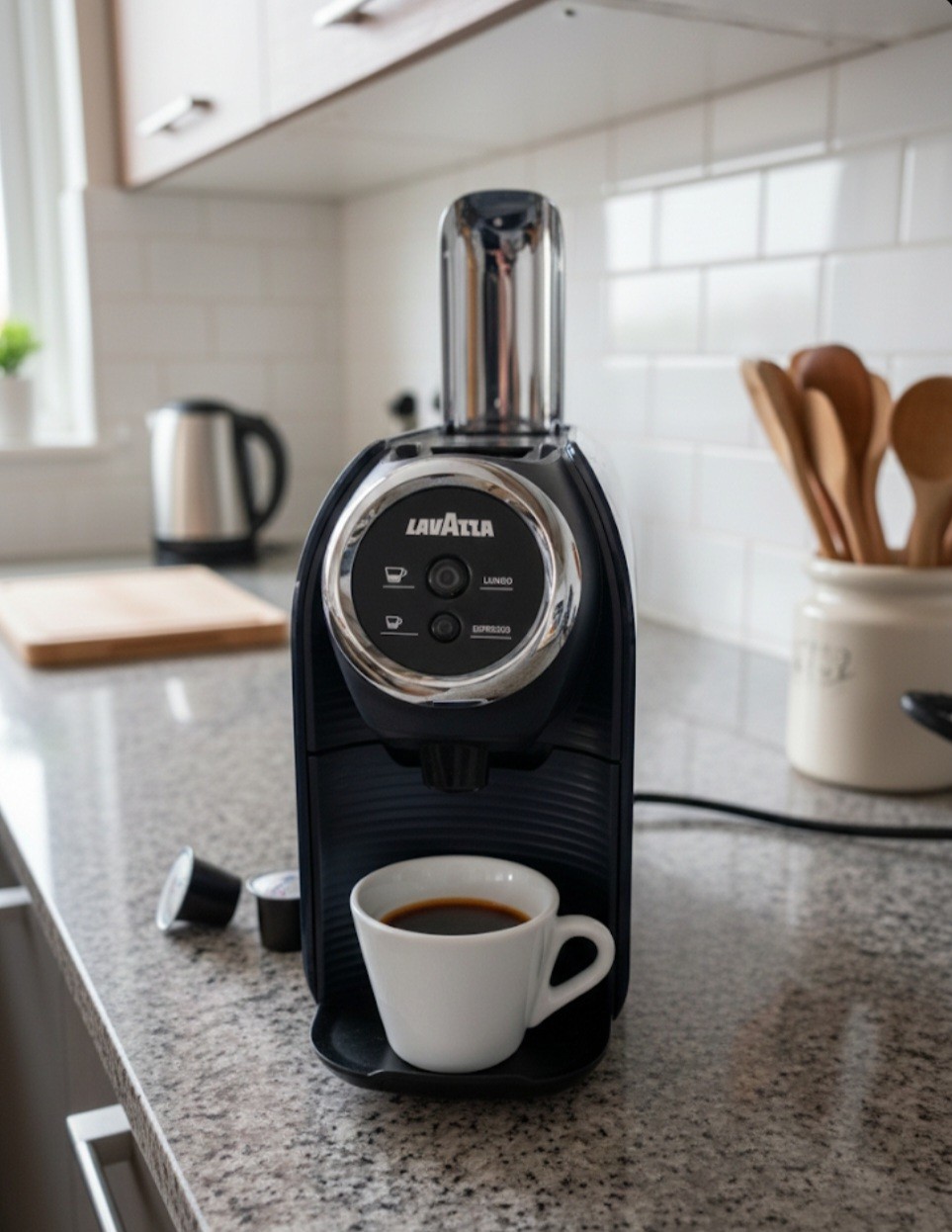 The Lavazza Classy Mini LAVAZZA Capsule Coffee Machine in blue features a sleek design with a shiny finish. It is compatible with Lavazza capsules and is capable of making espresso and lungo coffee. The machine includes a water tank and drip tray for easy maintenance. With its analog control panel, this electric coffee maker is convenient for those looking for a compact and efficient coffee machine for their home.