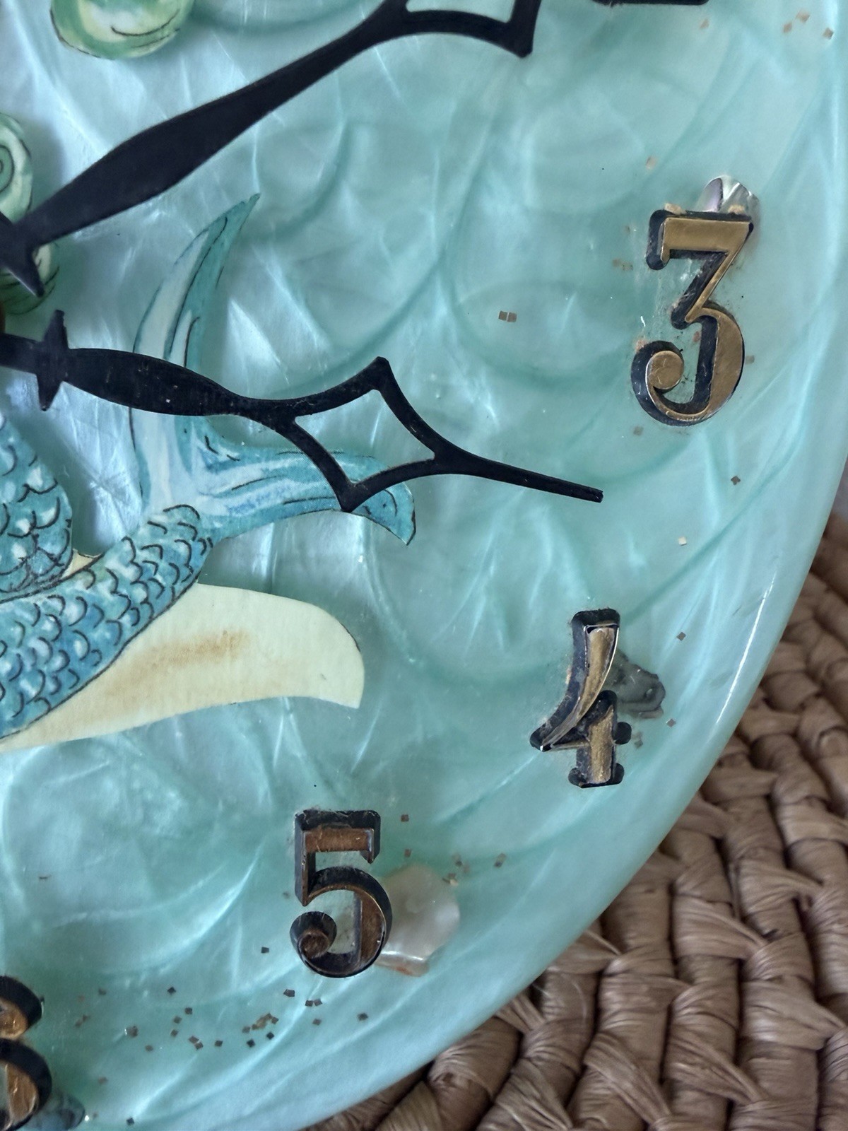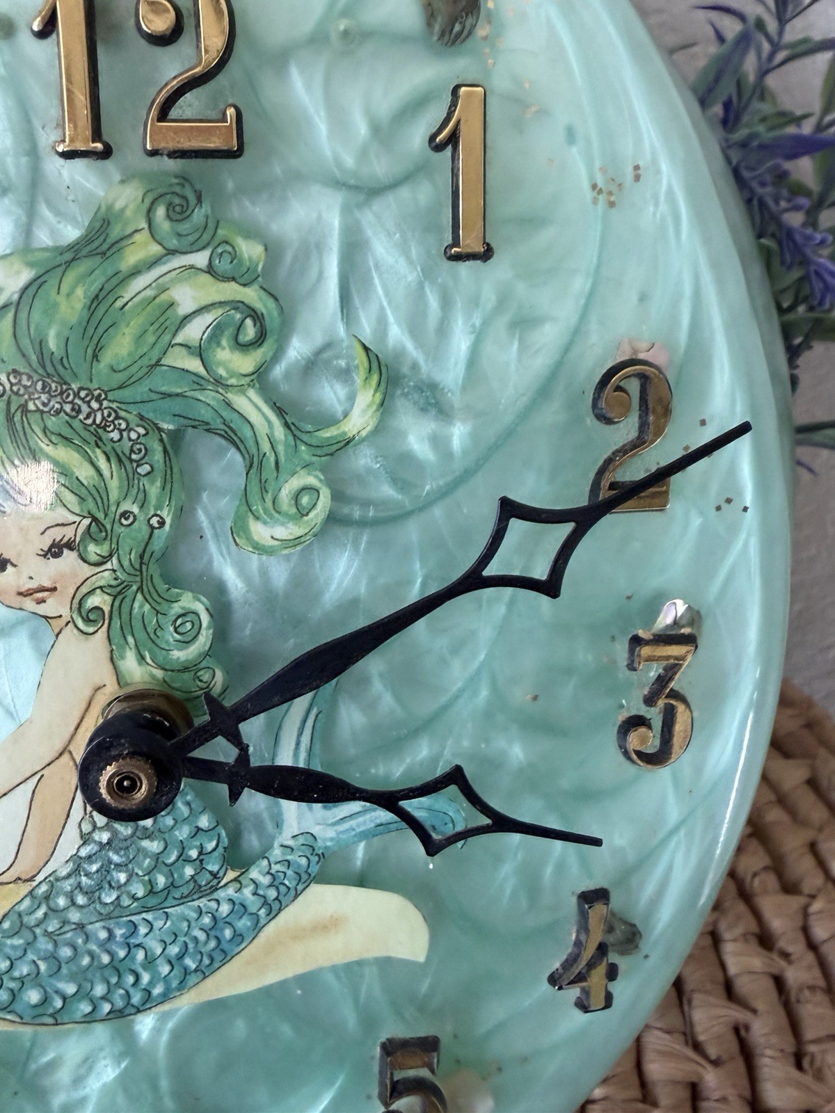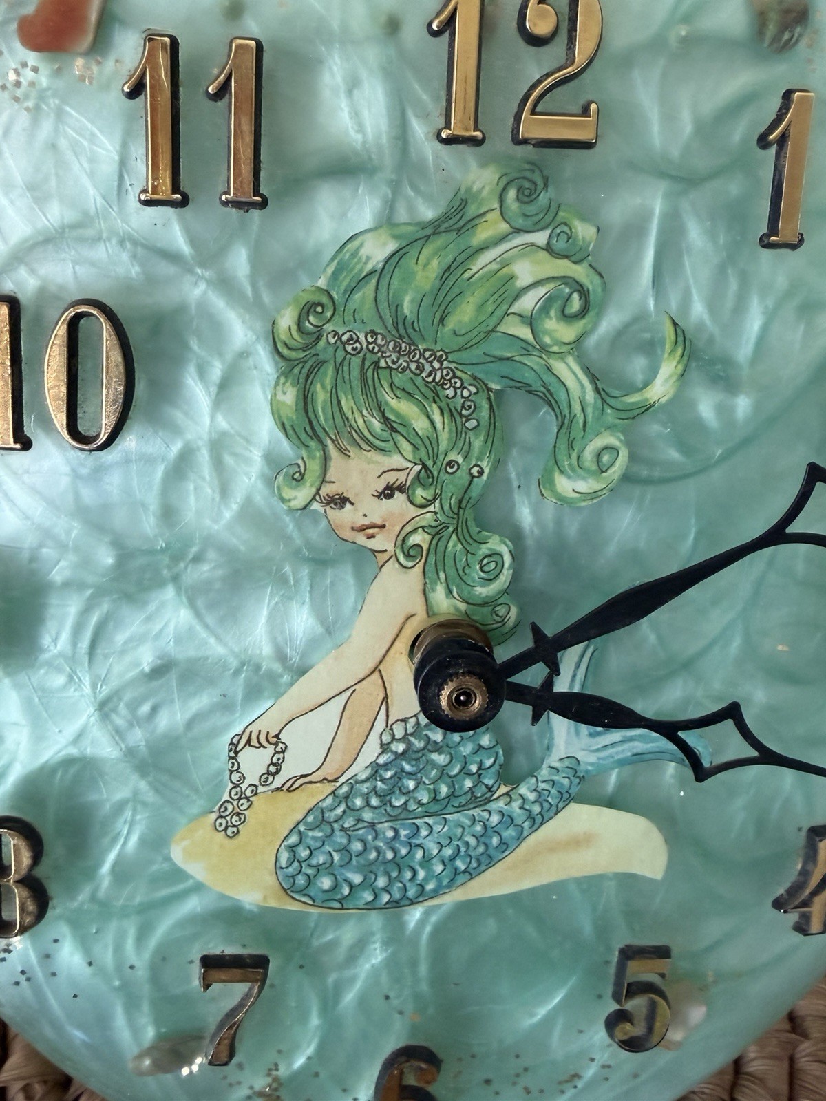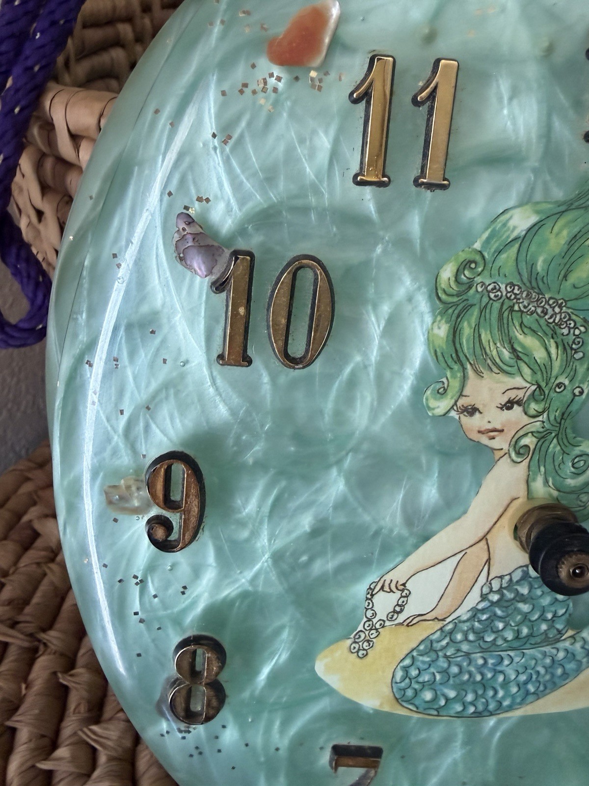This vintage teal mermaid wall clock features a lucite shell design and quirky toilet seat–style decor, making it a fun collectible wall hanging for themed rooms or retro displays. Condition is used; check the listing for details on any wear, marks, or age-related imperfections. The clock is described as working; check the listing for details on timekeeping accuracy, battery type, and any included hardware. Ships with free shipping; check the listing for details on handling time, carrier, and packaging.