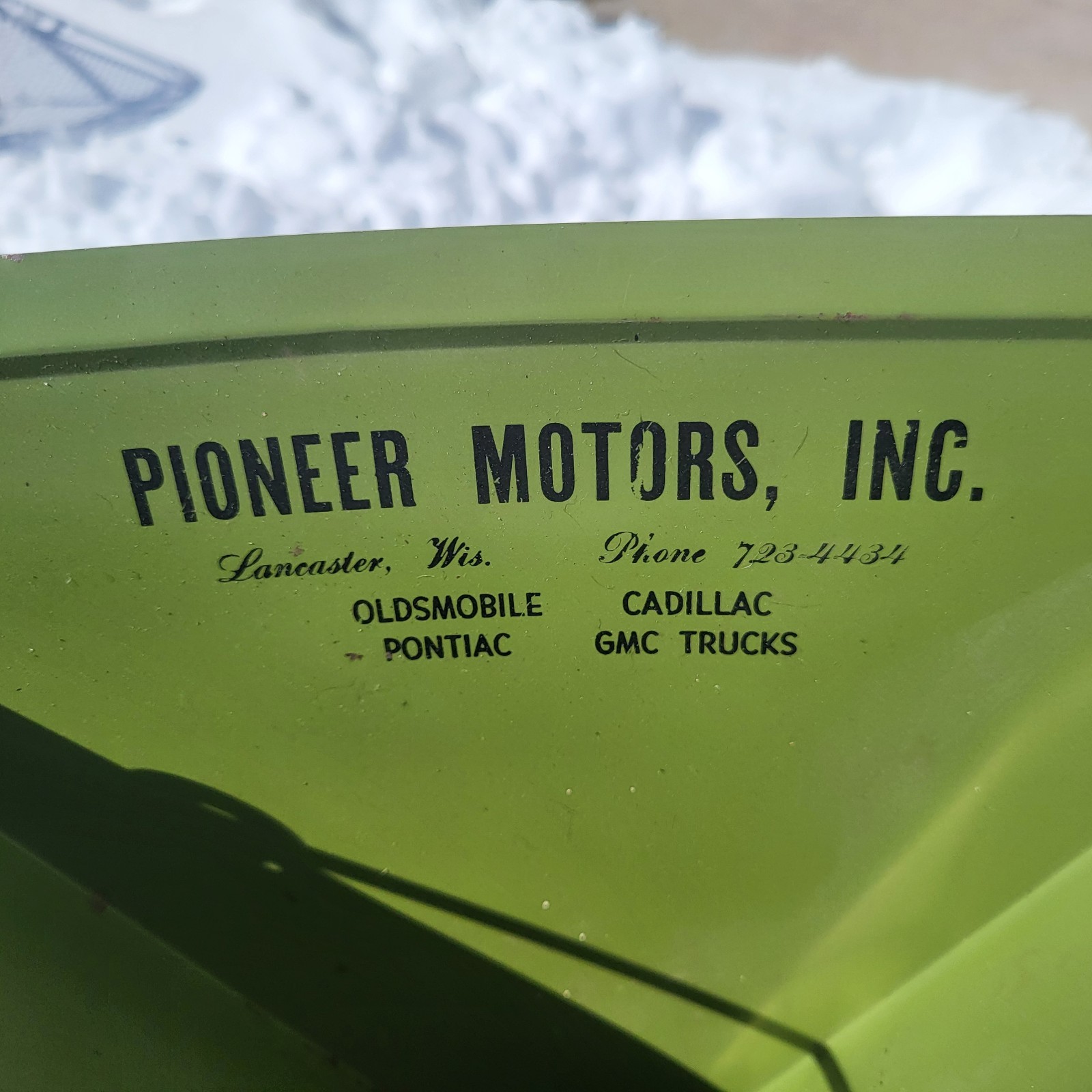 This Vintage dust pan looks as though it's been hidden away in a clost. Advertising Pioneer Motors Lancaster Wisconsin ( now platteville)