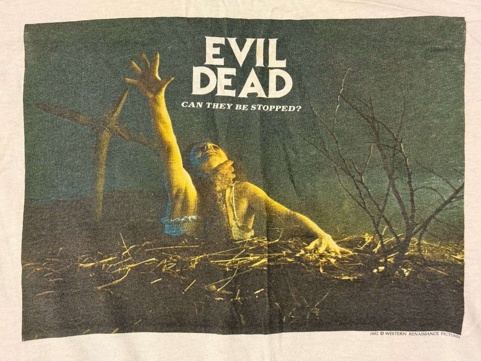 This is an officially licensed t-shirt from the year 1992 featuring the original poster artwork from the classic 1983 horror film The Evil DeadThe shirt is an adult