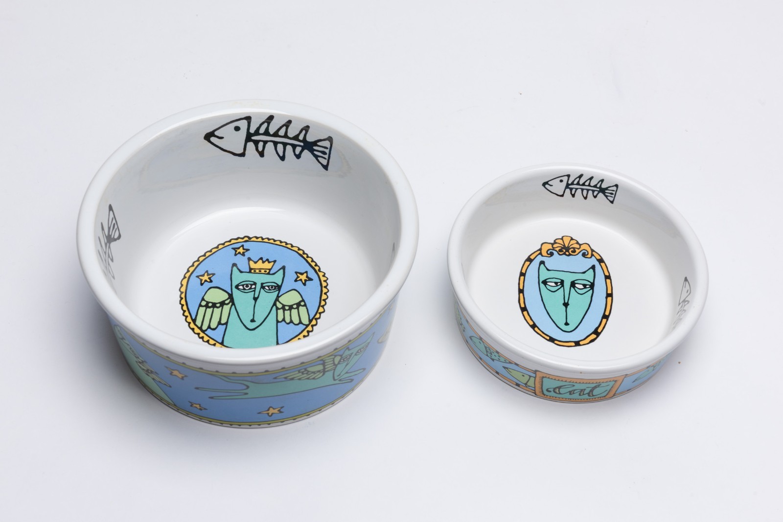 Super cute set of stoneware food and water bowl from the 1990's for us cat lovers. Water Bowl measures 6" x 2 3/4Food Bowl Measures 5" x 1 1/2"There is a small chip in the bottom edge as shown in the last image.