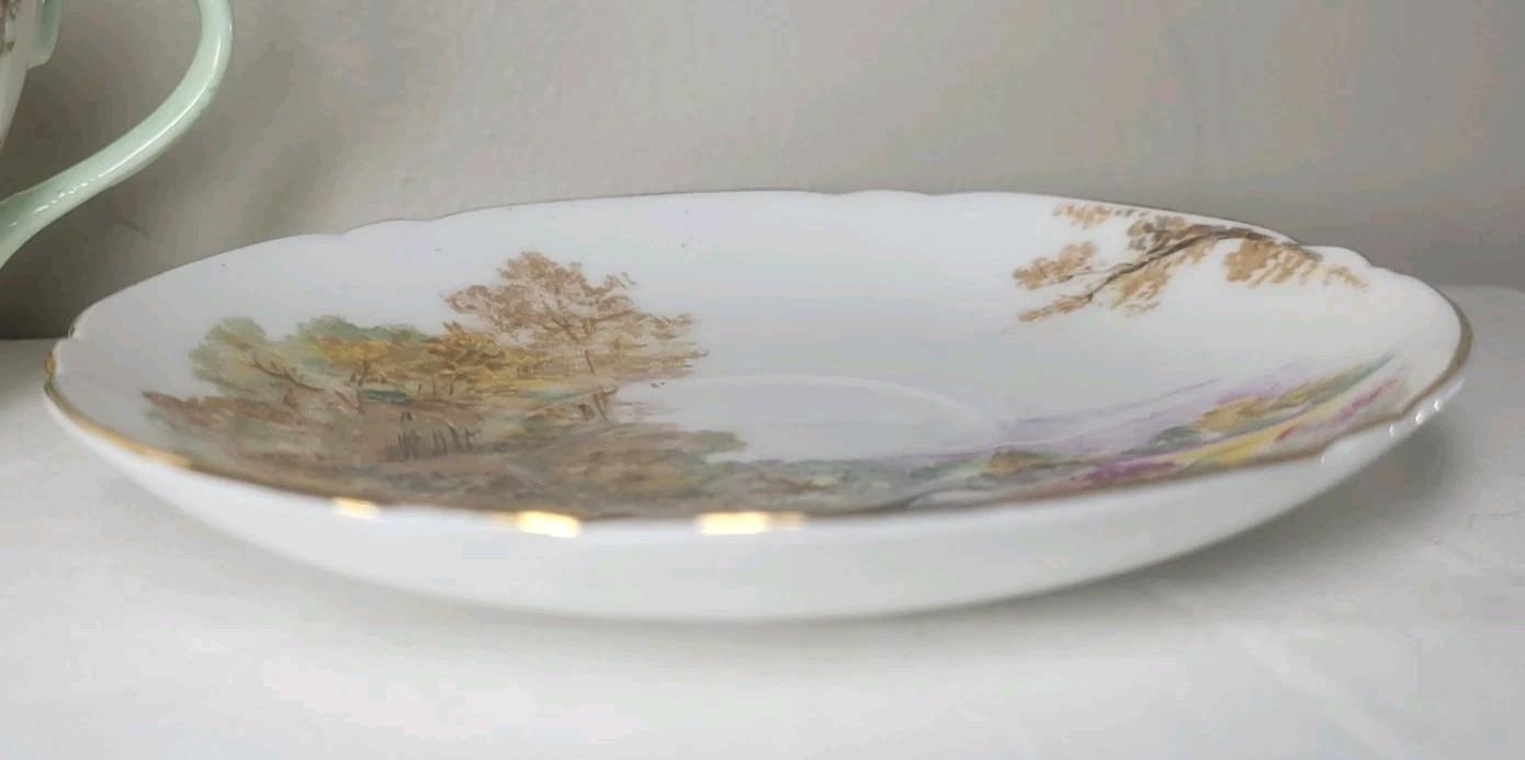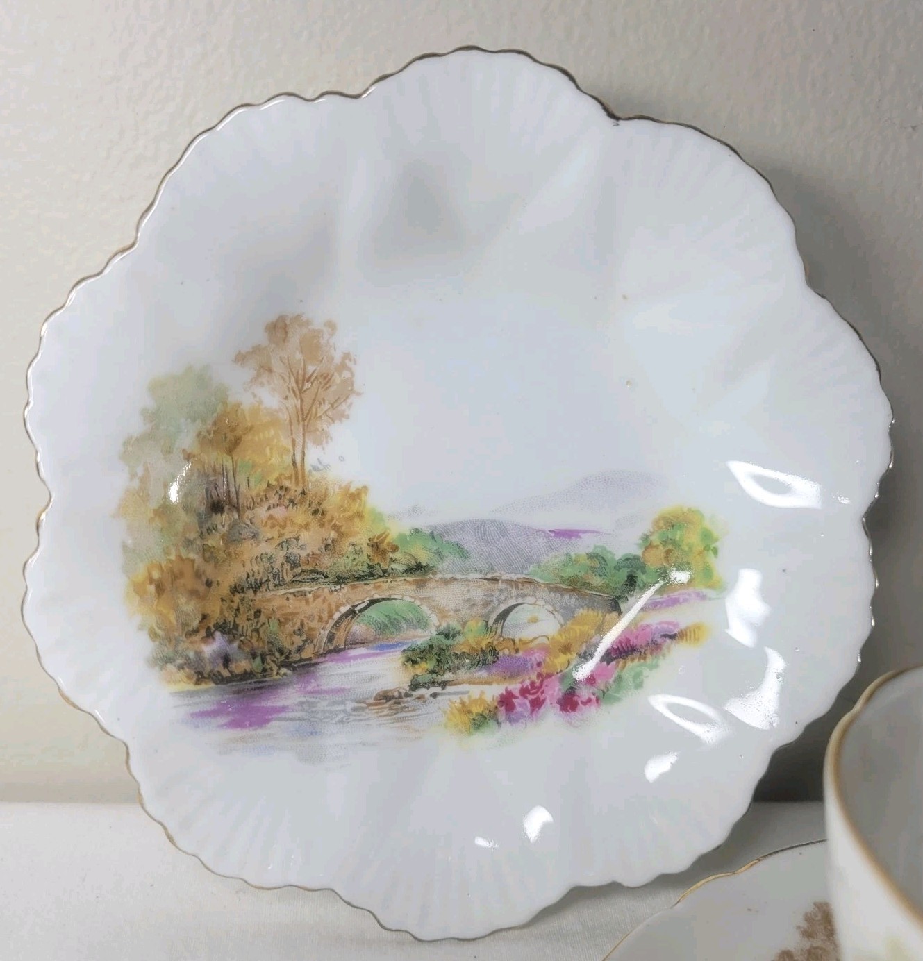 The Vintage Shelley Heather Trio Fine Bone China is a dainty gold rimmed that was hand painted three-piece set made in England, featuring a round cup, saucer, and fruit/nut/dessert bowl with a scenic landscape design hand-painted and transferred by Shelley. This vintage set was made from 1937 to 1966, and it is decorated with colorful multi