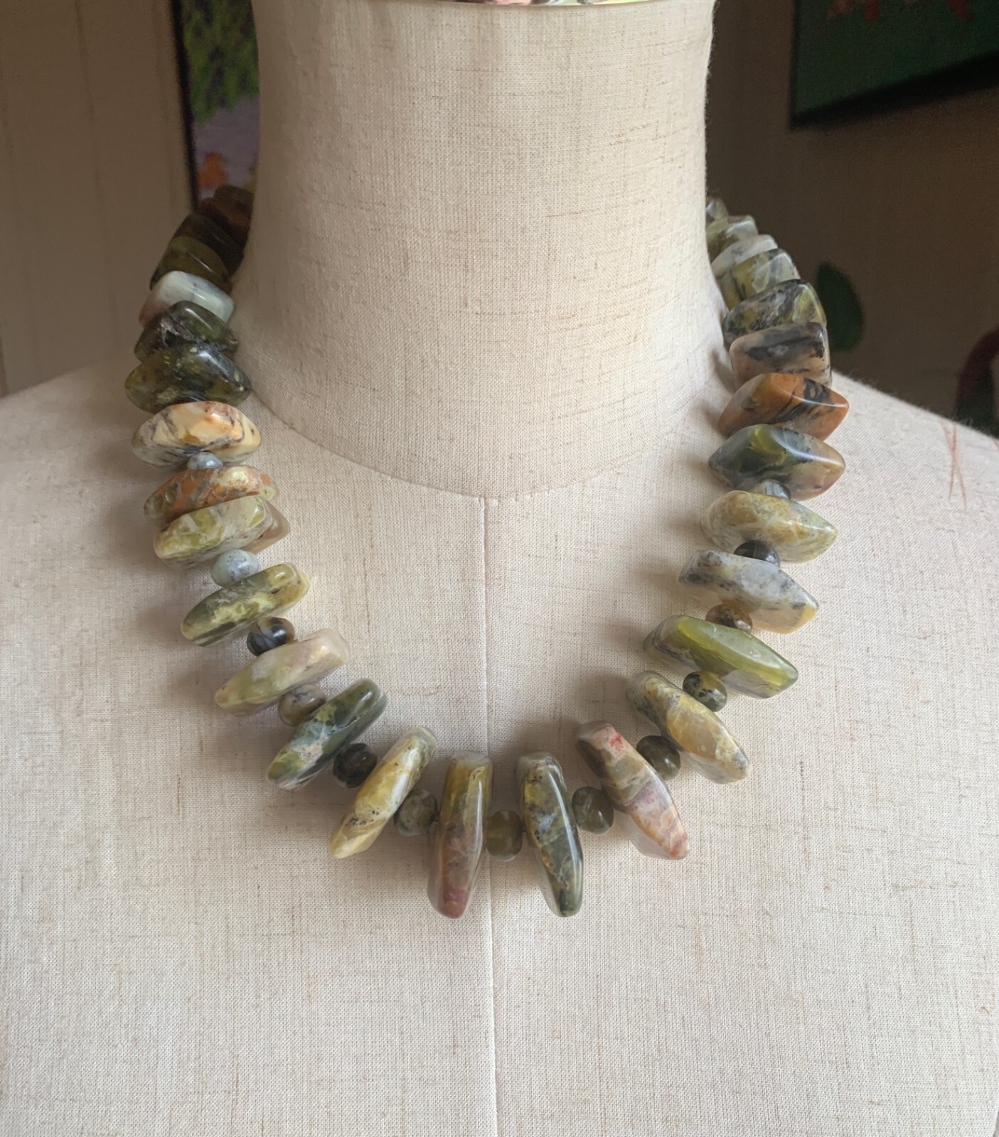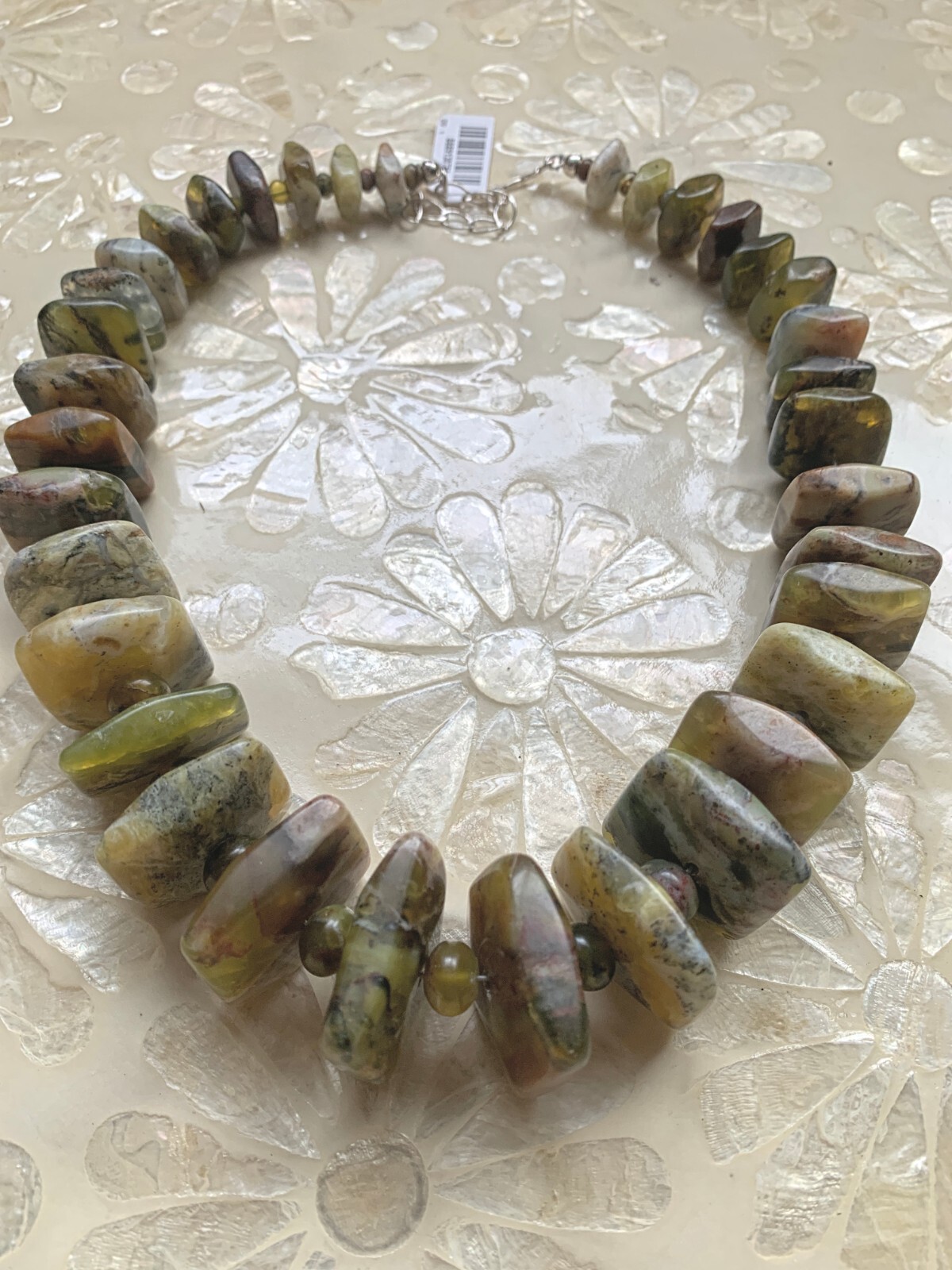 Jay King Sterling Silver Multi-Color Green Reef Opal Necklace. 19"A rare and unique find from southwestern Africa, Green Reef Opal displays a natural mix of green, brown, black and white shades. With its big, bold profile, this beaded necklace of Green Reef Opal will make a spectacular style statement at your neckline.Approx. 19"L x 1"W with 2-3/4" extenderSterling silverHook closureNecklace has elongated freeform beads of multi-