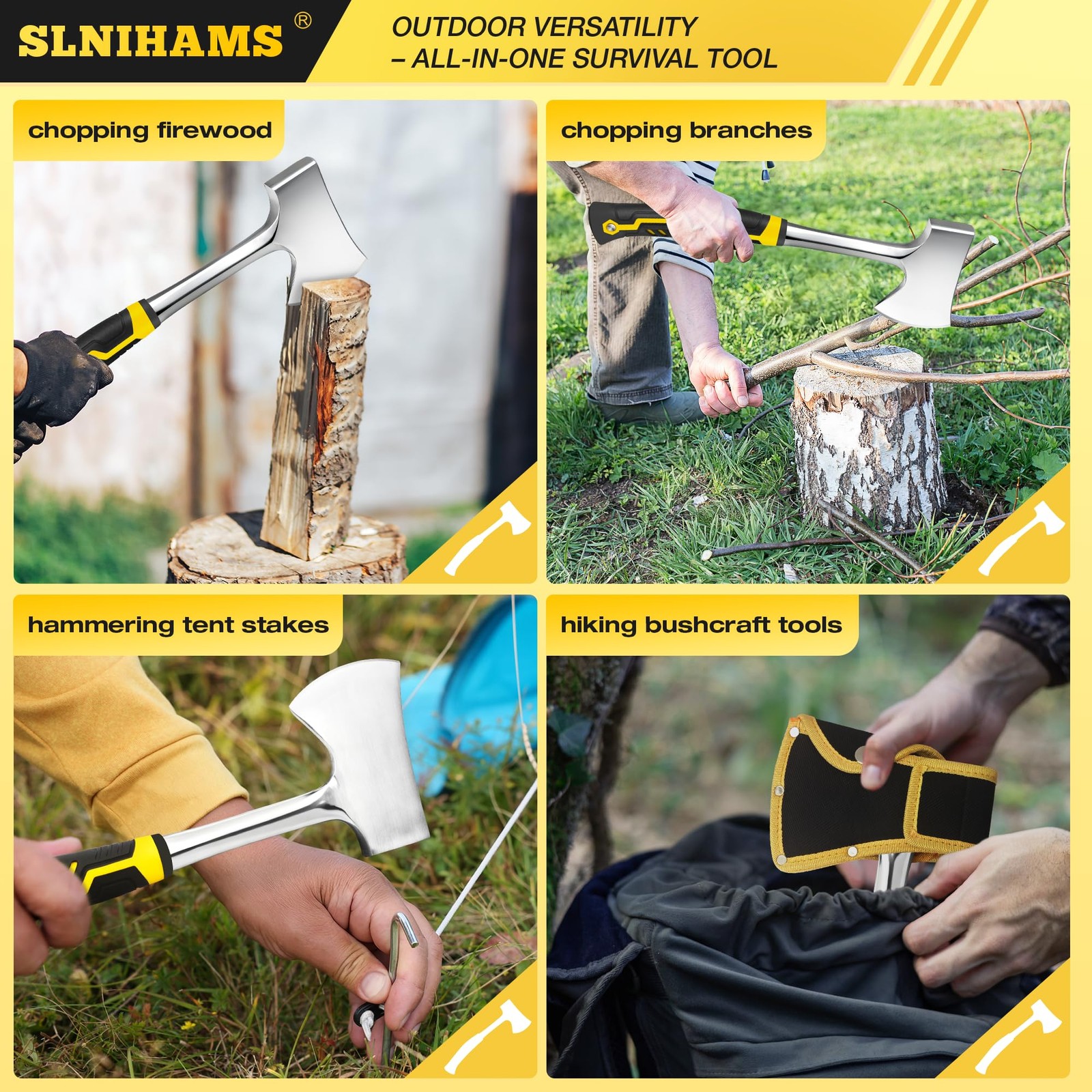 body html h3 p .a h2 div #content SLNIHAMS 13.5" Camping Hatchet, Forged Carbon Steel Axe with Ergonomic metalProduct Features 【Outdoor Versatility – All-in-One Survival Tool】 Perfect for chopping branches, splitting kindling, hammering tent stakes, or clearing trails. Whether camping, hiking, or bushcrafting, this 13.5" camping hatchet delivers dependable performance for all outdoor adventures. 【Forged Carbon Steel Head – Sharp & Durable】 Crafted from high-quality forged carbon steel for superior strength, sharpness, and durability. Designed to withstand repeated impact, ensuring efficient wood cutting and long-lasting performance. 【Ergonomic Anti-Slip Grip – Comfort & Control】 Features a textured, shock-absorbing handle that provides a secure, non-slip grip, even in wet conditions. Reduces hand fatigue during extended use, making chopping and splitting easier and safer. 【Heavy-Duty Oxford Nylon Sheath – Safe & Portable】 Comes with a reinforced Oxford nylon sheath that protects the blade and adds convenience for transport. The sheath includes a belt loop, keeping your hatchet close at hand and safely stored when not in use. 【Compact & Reliable – Built for the Outdoors】 At 13.5 inches and lightweight enough to carry, this hatchet strikes the perfect balance between portability and power. A must-have tool for campers, hikers, survivalists, and outdoor professionals. Shipping:Shipping is complimentary within the lower 48 US States. We Do Not Ship to PO/APO Boxes, HI or Alaska We Do Not Ship Outside of the Continental US All items ship within 24-72 hours of Payment For large items that require Freight shipping a valid phone number is required to call and schedule your deliveryTerms of Sale and Feedback: Feedback is extremely important to us and eBay If you are satisfied with our transaction, please take a moment to leave Positive Feedback. YOUR Satisfaction is our Priority! If there are any issues, PLEASE contact us BEFORE leaving a neutral or negative rating so that we may resolve any concerns. We PROMISE we can make you happy if you give us a fair chance. Returns / Concerns: All items qualify for returns within 14 - 30 days of receipt. Buyer is responsible for return shipping on any item that is not damaged Please be sure this is an item you want before making your purchase. Customer Satisfaction is our TOP priority! All items are IN STOCK at time of listing. Inventory on eBay changes constantly and it is impossible to maintain a perfectly accurate count of all items. Please do not penalize us if we have to issue you a refund! Thank You For Your Business!