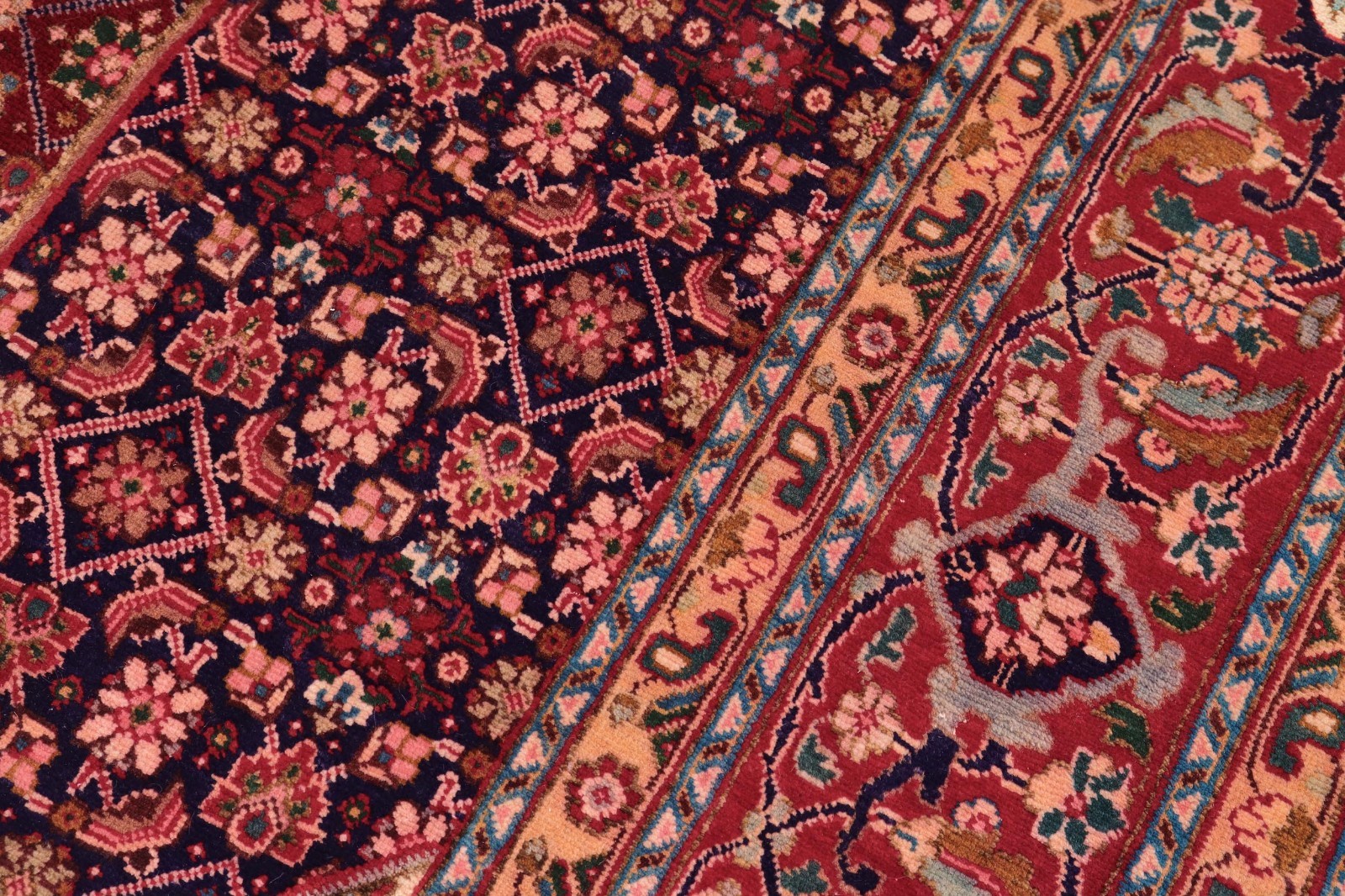 This captivating hand-knotted wool area rug in Blue, ruby red and multicolored medallion design is a traditional rug from the mid-20th century. Measuring 9.11x12.6 feet, this non-slip rug is suitable for various rooms such as the bedroom, living room, office, and more. Made with 100% wool, this handmade rug is moth-resistant, allergy-friendly, and easy to clean. With its unique design, this rug adds a touch of elegance and culture to any space.This rug showcases exceptional artistry, notable for its vivid use of