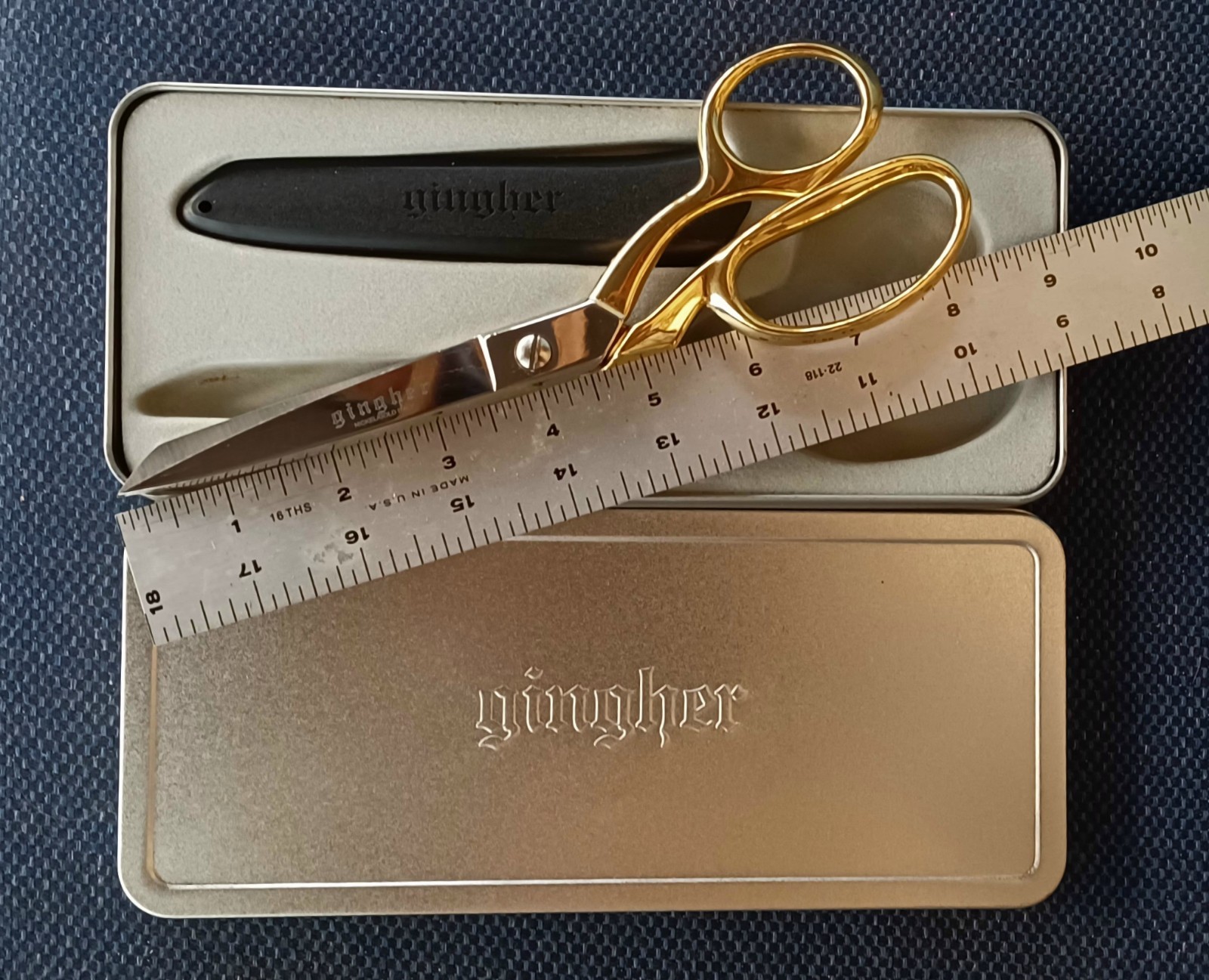 GINGHER Recognized as the premier line of cutting implements for home sewing, crafts, and needle arts, the Gingher brand name has been synonymous with precision performance and lasting quality for more than 54 years. High quality scissors and shears are manufactured to exacting standards and each pair is carefully inspected in order to maintain the highest level of quality. These Dressmaker’s Shears have a versatile length cut and blades strong enough to trim and cut multiple layers of fabric effortlessly. The cut is ideal for cutting out patterns and trimming seams. Gingher’s precision ground knife edge cuts flawlessly all the way to the points and the bent handle allows for smooth, comfortable cutting across a tabletop or counter. A truly wonderful addition to your treasured sewing tools. Gingher bent, knife edge shears. Comes with sheath, in case shown. ***Please see photos for exact length of scissors and cutting edge***