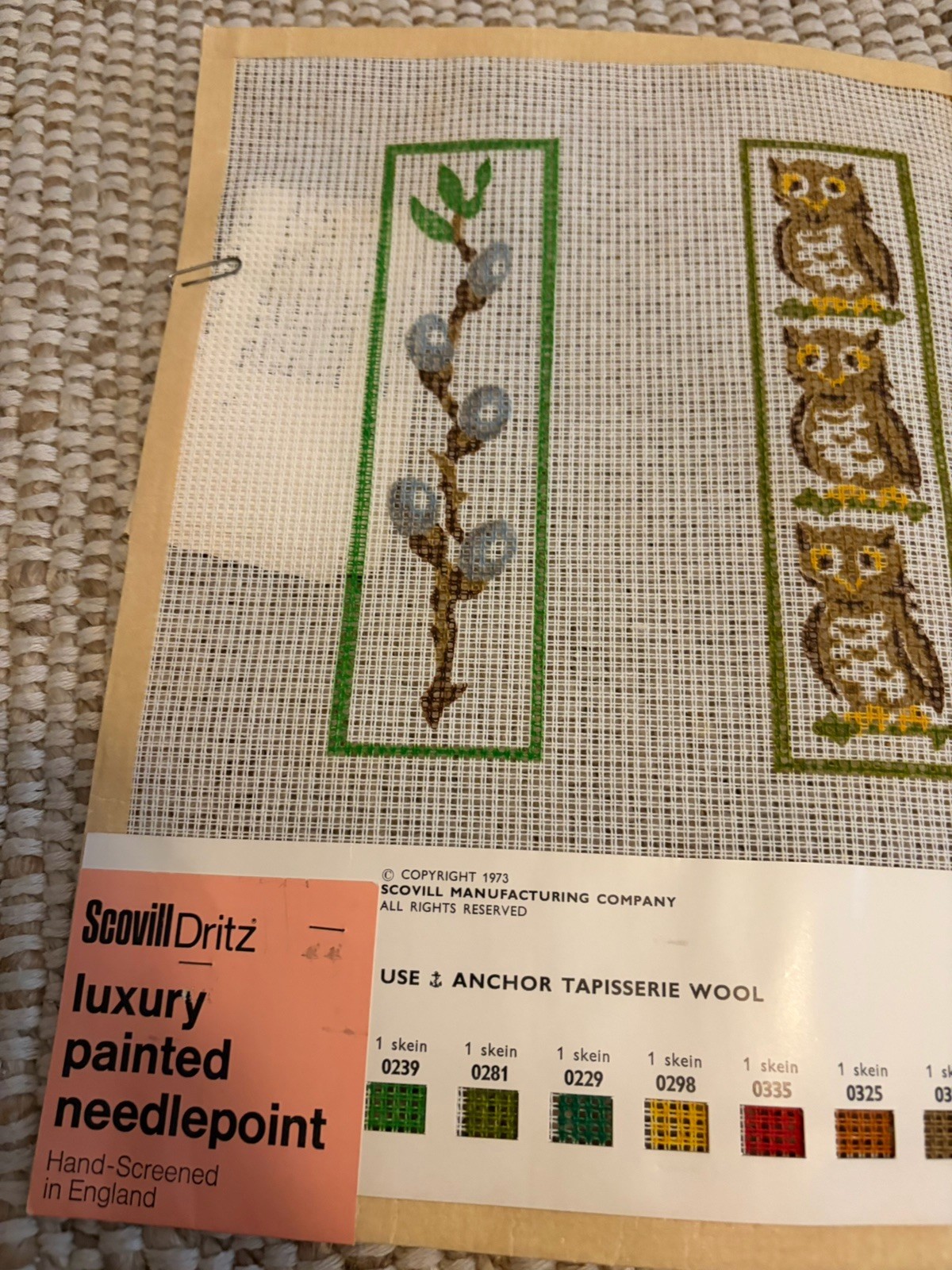 A charming lot of vintage unfinished needlepoint canvases, perfect for a stitcher, collector, or cottage-core décor lover.This mixed lot includes multiple partially completed and blank canvases featuring floral baskets, countryside cottages, birds, fruit, and botanical motifs. Several pieces are luxury painted or hand-screened needlepoint canvases, including Scovill / Scovill Dritz examples, with original instruction cards and