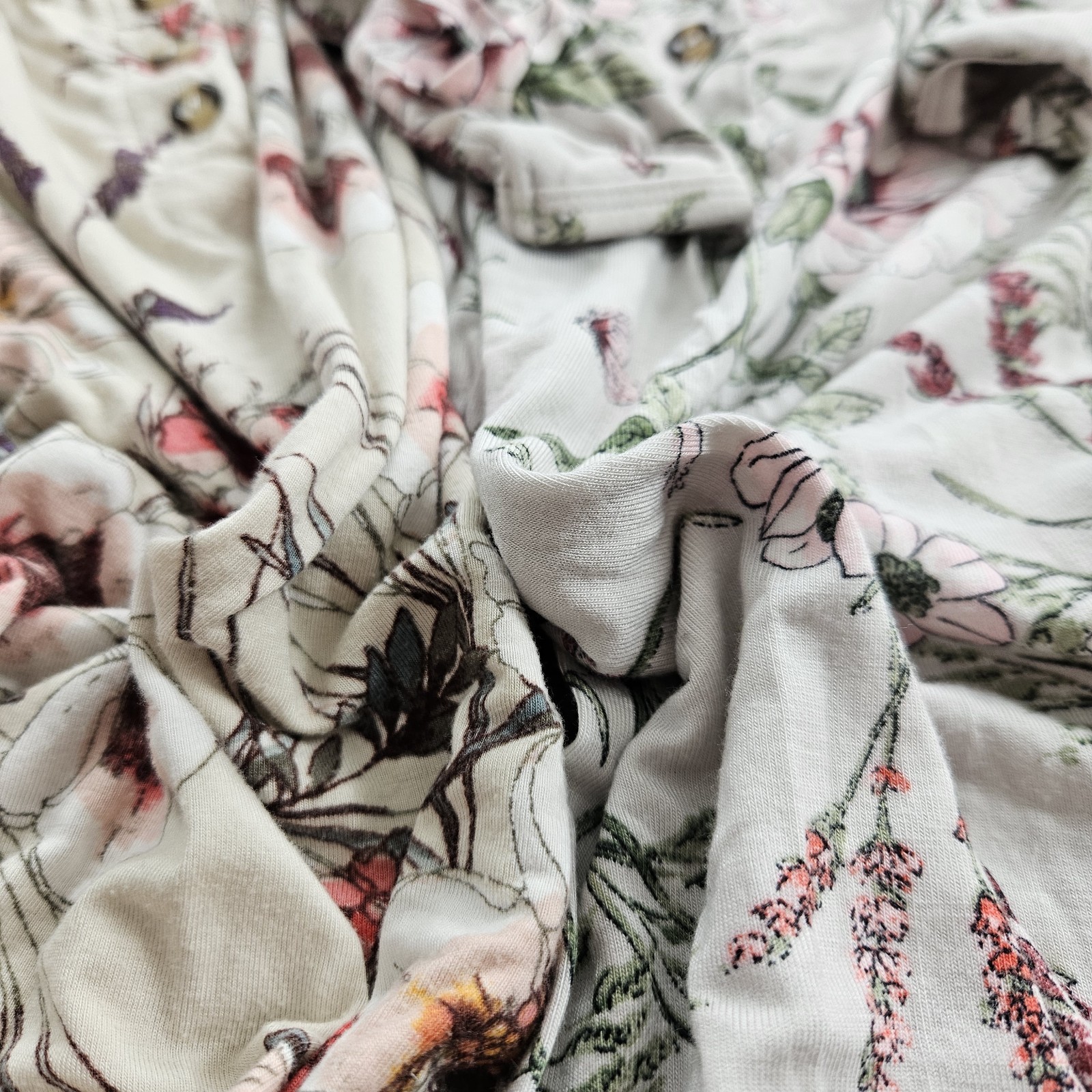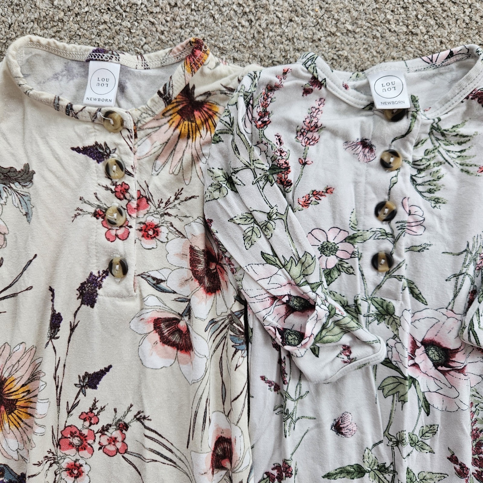 Lou Lou baby girl's knot gown bundle of 2. Beautiful floral print. Buttons at top and knot style bottom, awesome for quick and easy diaper changes! Super soft and stretchy fabric, made from rayon and spandex (feels like bamboo). Good used condition.Originally $34 each.0326.A1.V02See my page for more!