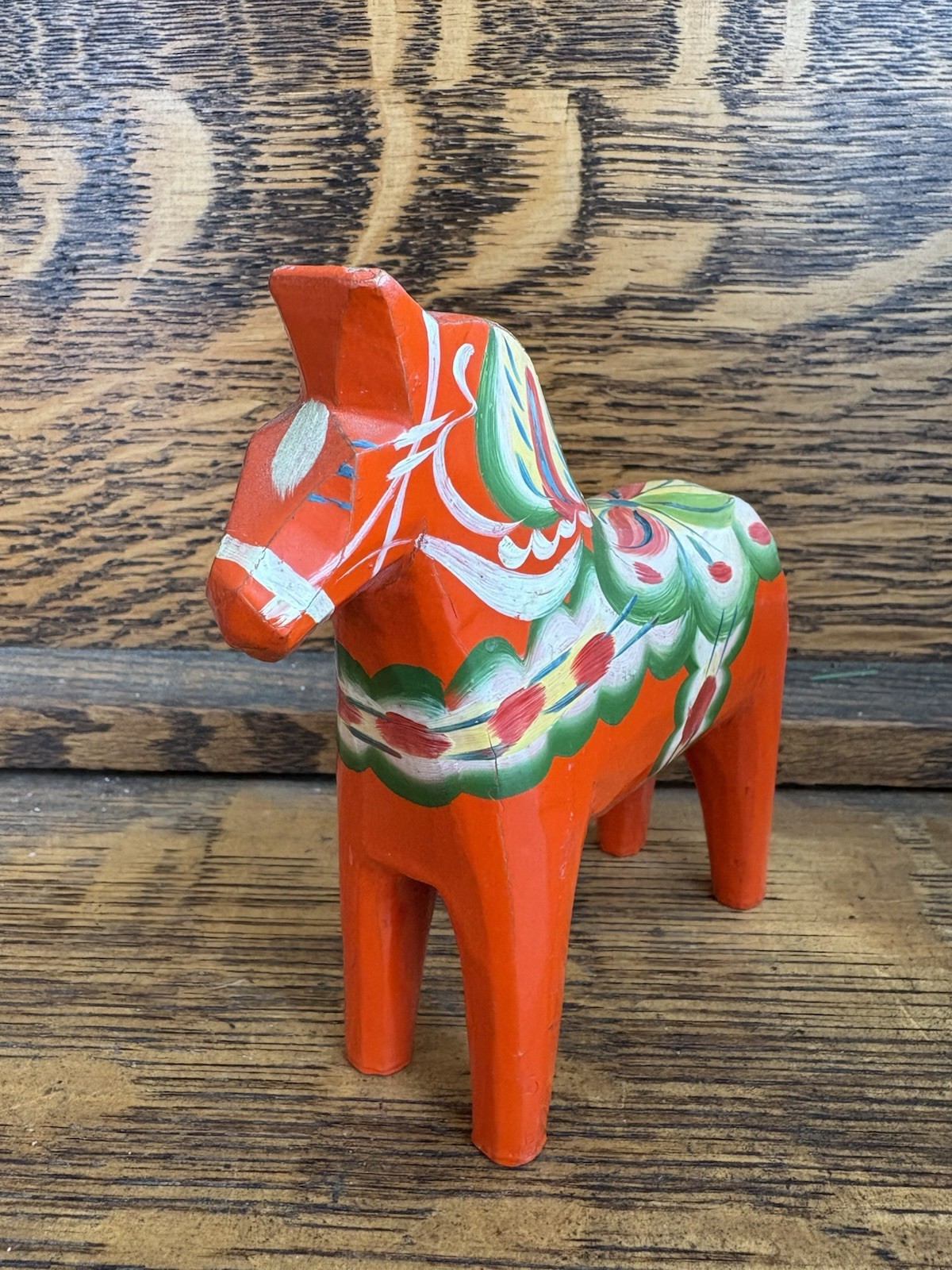 A vintage 5" hand-painted red /orange DALA horse from Sweden, unmarked but probably from the Nils Olson Studio Measuring approximately 5” tall x 5 1/2” long x 2” wide please see Photos he has some paint chipping around his ears Offered at &24.99Carefully packaged and shipped