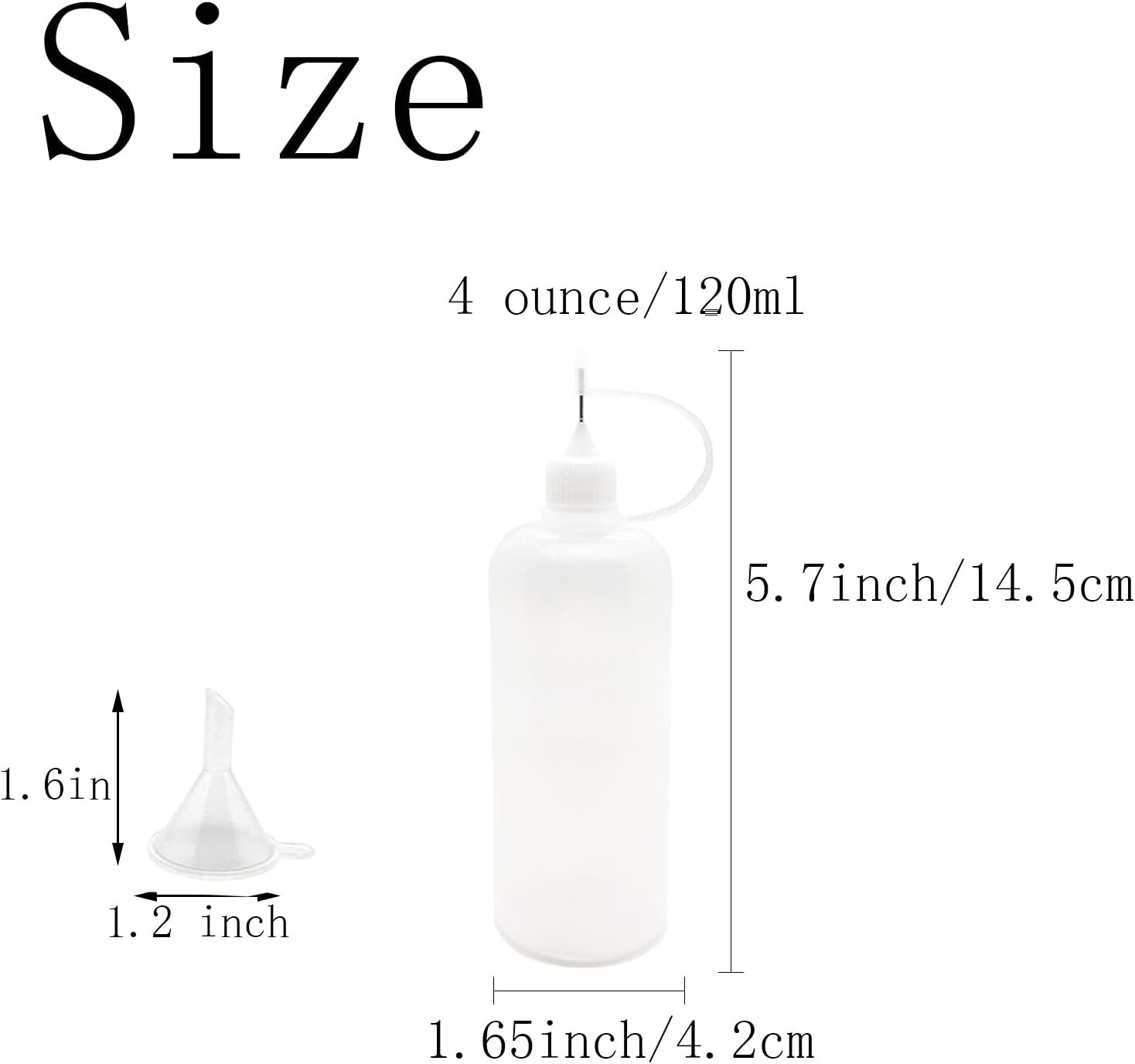 5 Pcs Precision Tip Applicator Bottles, 4 Ounce Needle Bottle, with White Value set: 5 tip applicator bottle, 2 mini funnels,White Lid.Perfect design: The translucent bottle body is made of high-quality plastic, the diameter of the metal tip is 1 mm.The