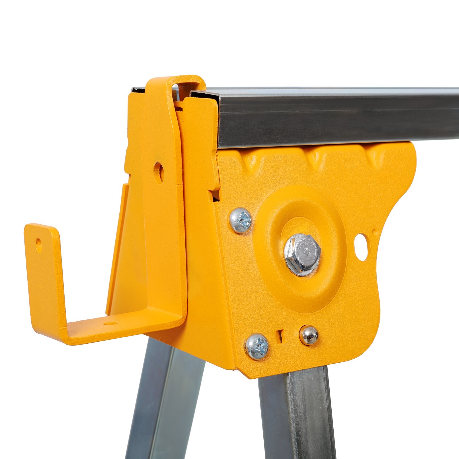 2PACK Adjustable Height Sawhorse,Folding Heavy Duty Steel Sawhorse for Garage Features Our sawhorse stand is engineered with a robust A-shaped frame, a design inspired by structural stability principles that distributes weight evenly across the entire base. This thoughtful construction eliminates wobbling even when supporting heavy materials like lumber, plywood, or metal sheets—perfect for demanding woodworking, construction, or DIY projects. Designed to adapt to every user’s needs and project requirements, the sawhorse stand comes with 5 adjustable height settings, ranging from 28.5in to 35in. Each leg features spring-loaded pins that let you switch between heights in seconds—no tools required. Whether you’re a tall professional needing a higher work surface to avoid hunching, a hobbyist working on a low-profile project, or adjusting for different material thicknesses, this flexibility ensures optimal comfort and efficiency. Our sawhorse stand is equipped with an intuitive foldable design, crafted to solve the common hassle of bulky tool storage—making it a game-changer for garages, small workshops, or job sites with limited space. Unlike traditional non-foldable sawhorses that take up permanent floor space, this model lets you collapse it in seconds with a simple, one-handed operation. Our sawhorses are engineered for maximum strength, built to tackle the heaviest loads while remaining portable enough for everyday use. Each pair can hold up to 1000lbs. Beyond its core role as a heavy-duty support, our sawhorse is equipped with integrated versatile hooks—small but powerful additions that transform it from a simple stand into a multi-purpose workspace ally.