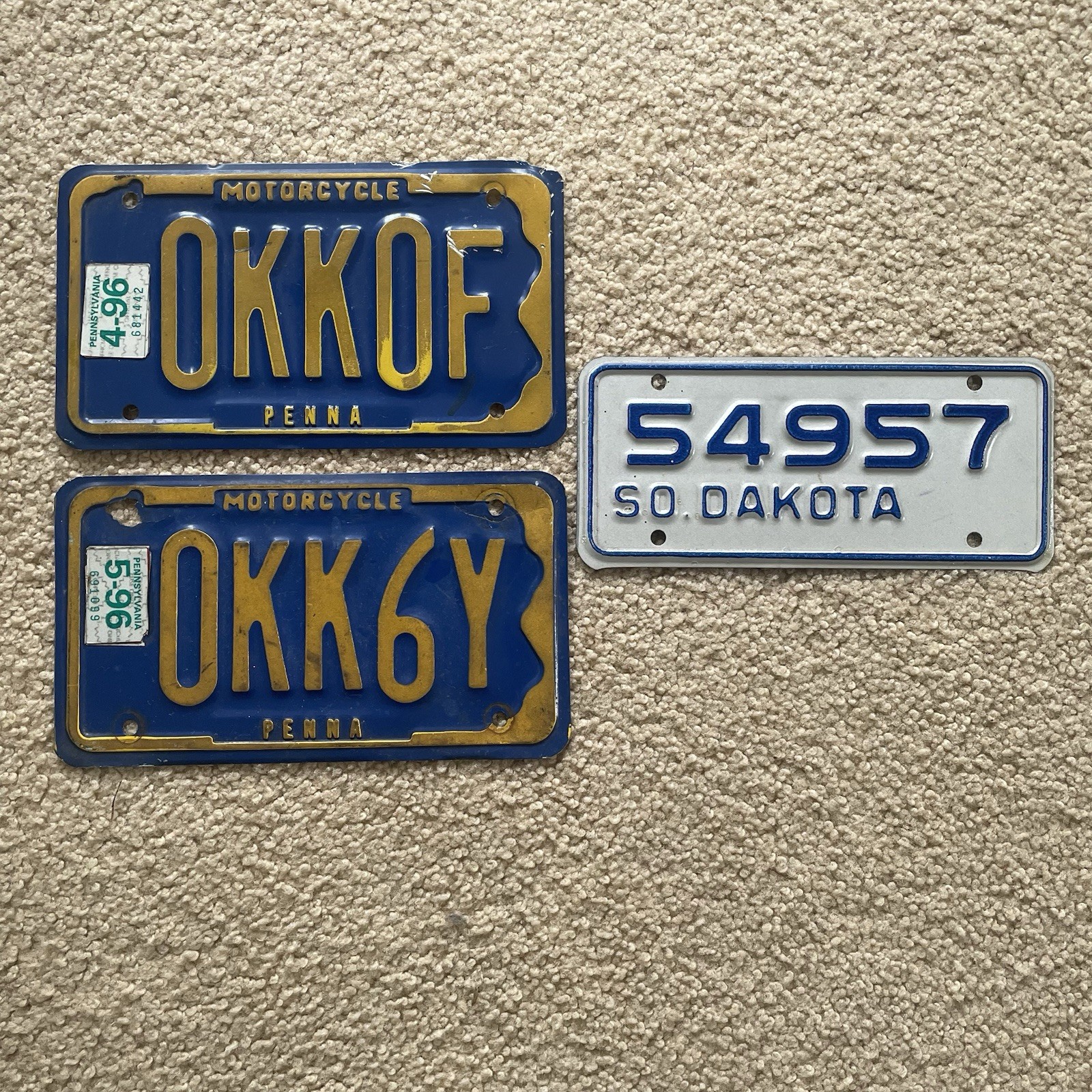 Set of 3 used motorcycle vintage license plates,late 80's for South Dakota-1996 for Pa-South Dakota is in excellent condition-Pa plates show some cracks and scrapes-see photos for details-the 2 Pa plates are close by in series