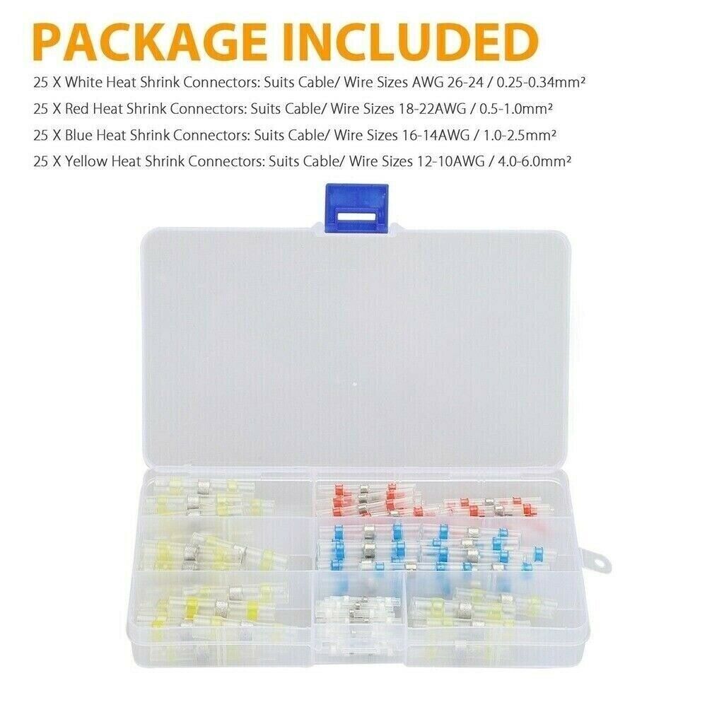 size is easy to pick up for use. And with transparent heat shrink sleeve allowing for precise visual inspection. Product Specification Type: Heat Shrink Connectors The Shrinkage Ratio of Red, Blue, White and Yellow Heat Shrink Sleeve : 2 Shrink Temperature: >160℃ Solder Melting Range: 111℃ - 138℃ Operating Temperature: -55℃ - 125℃ Waterproof Class: IP67 Package Included 25 X White Heat Shrink Connectors: Suits Cable/ Wire Sizes AWG 26-24 / 0.25-0.34mm² 25 X Red Heat Shrink Connectors: Suits Cable/ Wire Sizes 18-22AWG / 0.5-1.0mm² 25 X Blue Heat Shrink Connectors: Suits Cable/ Wire Sizes 16-14AWG / 1.0-2.5mm² 25 X Yellow Heat Shrink Connectors: Suits Cable/ Wire Sizes 12-10AWG / 4.0-6.0mm² Payment Policy (1) We accept PayPal payment only. (2) PayPal is a faster, easier and safer payment method. It is widely used in international online business. Even if you do not want to register a PayPal account, you can still use your credit card to go through PayPal checkout process without any extra steps. (3) You can register an account on https://www.paypal.com, it just take a few minutes. Or you can ask your friend for help (4) If you can not pay via paypal, we can cancel this transaction for you. Shipping Policy (1) We will ship your item(s) within 2 working day. (2) We send to USA , 15-25 working days. (3) UK / Auatralia / Canada ,18-35 working days. (4) Europe , 18-30 working days. (5) Other Countries, 25-45 working days. (6) We can also provide express post by EMS(4-15 days) or DHL(4-8 days). The cost is higher than standard postage, about $ 20 or higher. If you want post by EMS or DHL, please contact us.Very reasonalbe shipping fee will be charged Feedback Policy Hope you will leave us positive feedback and 5 stars DSR. Glad to deal with you in the future. Your satisfaction is our pursuit. If there is any way we can help you, do not hesitate to contact us. Contact US If you have any questions please feel free to contact us. We will be delighted to help.You can contact us by clicking on "Ask a question" at the bottom of this page. 75Pcs Piggy Back Insulated Spade Terminals 22-10AWG Wire Crimp Connectors Mixed11.59 USDFree shipping25-35 Feet Heat Shrink Tubing 4:1 Wires Sleeve Adhesive Waterproof Dual Wall Kit28.49 USDFree shipping60× Heat Shrink Wire Butt Connectors AWG 22-14 Solder Seal Sleeve Terminals Set9.59 USDFree shipping8-15FT Heat Shrink Tubing Ratio 3:1 Marine Grade Waterproof Glue Adhesive Lined9.49 USDFree shipping280pcs 2.8/4.8/6.3mm Male Female Wire Crimp Terminals Spade Connectors Assorted13.99 USDFree shippingSC50-8 Tinned Copper Lug Non-Insulated Terminal Connectors 20PCS20.99 USDFree shipping120pcs Solder Seal Sleeve Waterproof Terminals Heat Shrink Butt Wire Connectors12.99 USDFree shipping100PCS Solder Seal Sleeve Terminal Heat Shrink AWG 22-18 Wire Splice Connector11.95 USDFree shippingPack 5-50 80 Amp Large Blade Style Audio MAXI Fuse for Car RV Boat Auto 80A6.79 USDFree shipping6/10FT Ratio 3:1 Heat Shrink Tubing Adhesive Glue Dual Wall Marine Grade Kit8.99 USDFree shipping50-400PCS 16-14AWG Heat Shrink Sleeve Terminals Solder Seal Butt Wire Connectors6.99 USDFree shipping50/200× Solder Seal Sleeve Heat Shrink Butt Wire Connectors Terminals Waterproof5.99 USD0.99 USD300Pcs Blue Heat Shrink Butt Wire Connectors Crimp Terminals AWG 16-14 Gauge8.79 USDFree shipping100× Waterproof Heat Shrink Bullet Female Male Wire Connectors Crimp Terminals11.3 USDFree shipping10pcs Gauge 8 AWG 1/2" Copper Ring Terminals Battery Cable Lugs Wire Connectors8.79 USDFree shipping100-400PCS Heat Shrink Butt Wire Splice Connectors Crimp Terminals 22-10AWG Kit11.69 USDFree shipping10pcs 40a AMP Large Blade Style Audio GOLD Maxi Fuse Car Marine Auto Motorcycle10.99 USDFree shipping8-20FT Heat Shrink Tubing 3:1&4:1 Marine Grade Wire Wrap Adhesive Lined Kit8.79 USDFree shipping