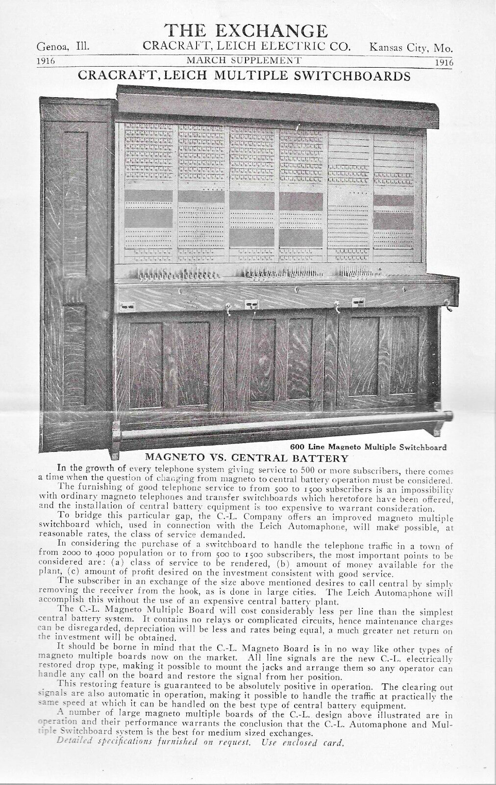 TO SEE MY OTHER TRADE CATALOG & OWNER'S MANUAL COLLECTIBLES, please click on the link above to my eBay store and do separate searches for "CATALOG" and then "MANUAL"TO SEE MY OTHER ADVERTISING COLLECTIBLES, please click on the link above to my eBay store and do a search for "ADVERTISING"TO SEE MY OTHER ILLINOIS COLLECTIBLES, please click on the link above to my eBay store and do a search for "ILLINOIS" ++++++++++++++++++++++++++++++++++++++++++++++++++++++++++++++++++++++++++++ FREE SHIPPING - AS USUAL THE EXCHANGE, [a monthly promotional advertising & catalog like publication]issued by Cracraft Leich Electric Company of Genoa, Illinois."To assist our friends in the operation of their exchanges . . ." in other words, "sort of" an owner's manual.March, 1916, Volume 1, Number 1 (the very first issue!)with 4 pages, measuring 7 1/2 inches wide by 10 1/2 inches = opening up to 15 x 10 inches for reading or perusal.Has 3 b&w halftone illustrations (2 different relays and one old-timey "Magneto" switchboard) + 2 more smaller line cuts showing telephone usage but which are also a lot more "generic." + the halftone b&w photo on the separate, extra broadside.Laid in as an extra piece is a 6x9 inch illustrated broadside (a typical broadside, printed on one side of the sheet only) which illustrates & tells about the company's "new" 600 line (!) Central Battery Multiple Switchboard. (I wish I had one of those 1916 switchboards to sell on eBay!)Part of this journal discusses the differences between a "Central Battery Switchboard" and a "Magneto Switchboard." Page 3, while only showing a single switchboard, describes & tells about 6 different switchboards made by the company - anywhere from a 20 line switchboard to a 300 line switchboard.This is really a neat piece of vintage telephone paper memorabilia.NO OTHER COPY* ON EBAY AS OF 24 February, 2025* LOTS of their original antique phones are listed but not any of their "substantive" paper collectibles :-}FINE, CLEAN & FRESH CONDITION._________________________________________________________ (the fine print ... [sigh] ... but please read :-) WE REGRET WE DON'T SHIP OUT OF USA; SORRY, BUT NO EXCEPTIONS. FREE SHIPPING via corrugated board, bubblewrap and mylar sleeve-protected USPS Ground Advantage Parcel rate & sent with Free post office tracking MAY OPT IN at checkout for faster priority mail at an extra charge of $9.00. You will need to pay the $9.00 extra before actually checking out in order to upgrade: Ebay will NOT let me upgrade to priority if you don't remember to pay the $9.00 at the same time you pay for the catalog.Please pay within 4 days. Delayed? Then email me - I'll try to work with you when necessary but it helps a lot when I have contact with you. If your payment is delayed, ebay is liable to send a dun or two. PLEASE NOTE THAT THOSE ARE COMING AUTOMATICALLY FROM EBAY AND NOT FROM ME. I typically send out just one reminder.